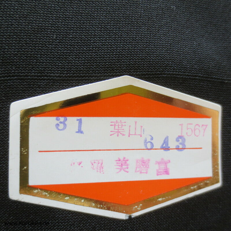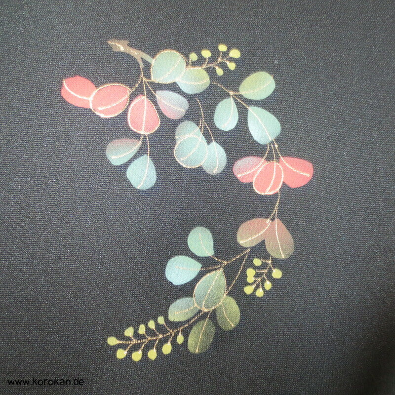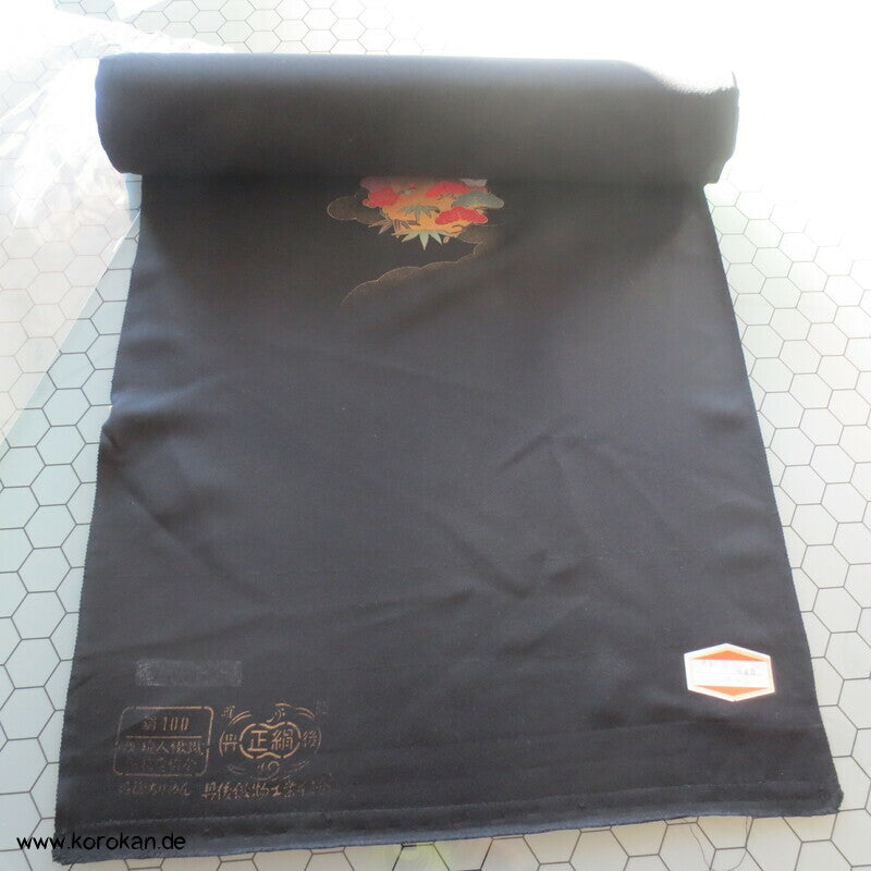 Vintage unbenutzte Tanmono Stoffrolle schwarzer Seidencrepe für Kimono Haori Jacke mit Blütenspiegeln bemalt