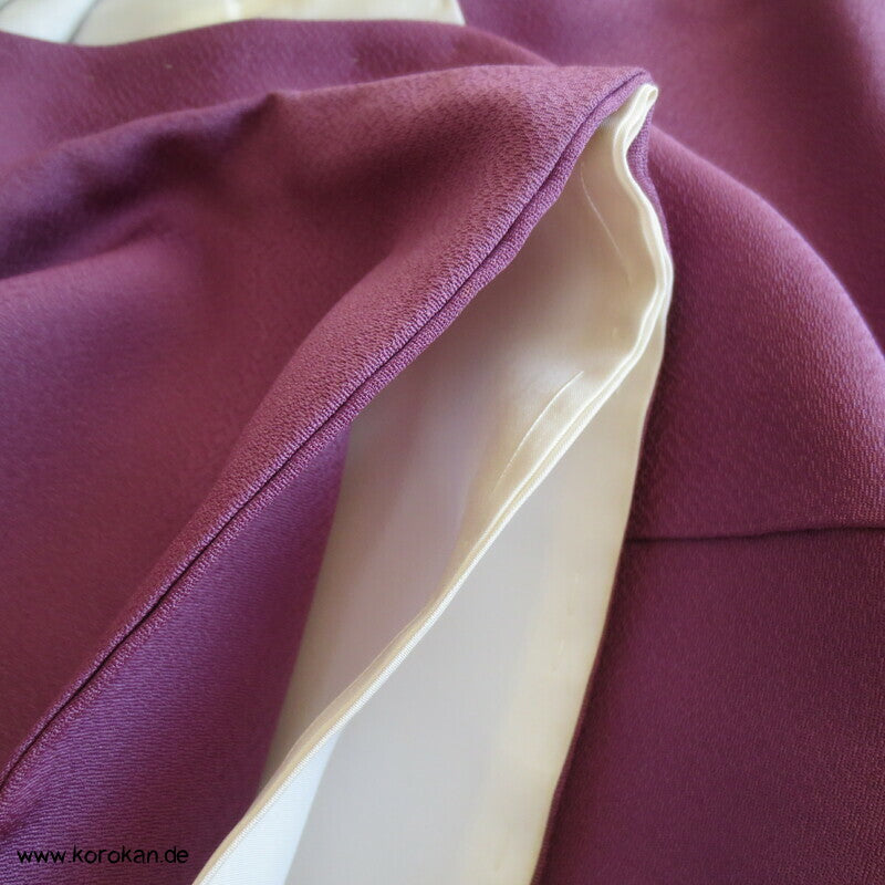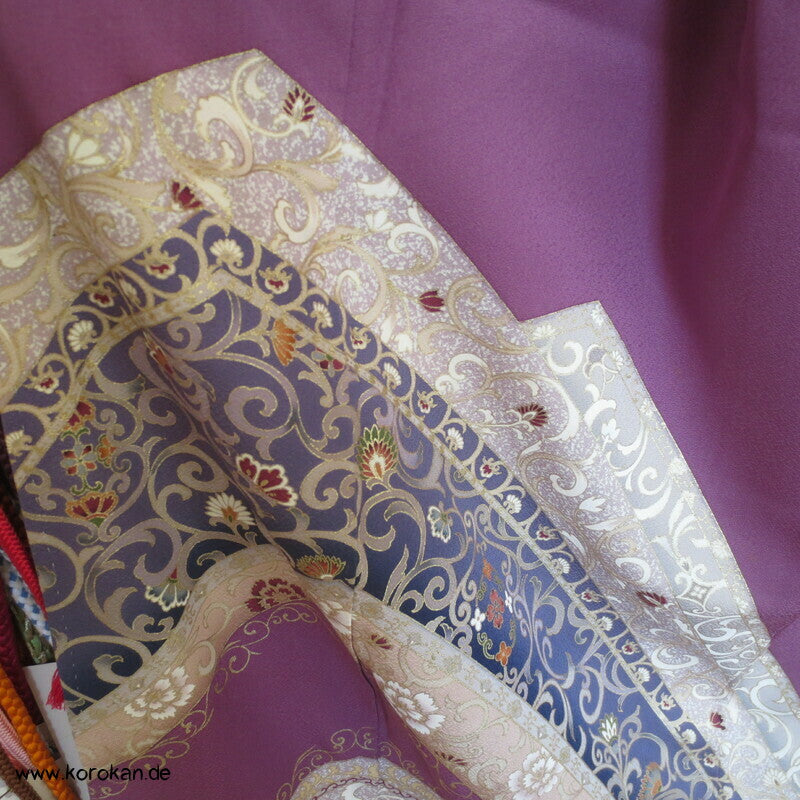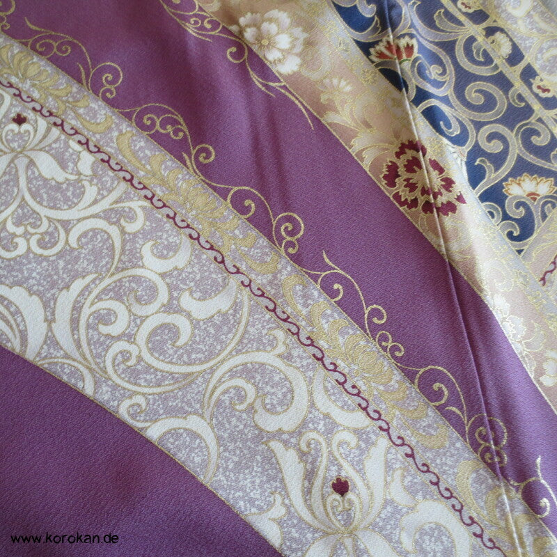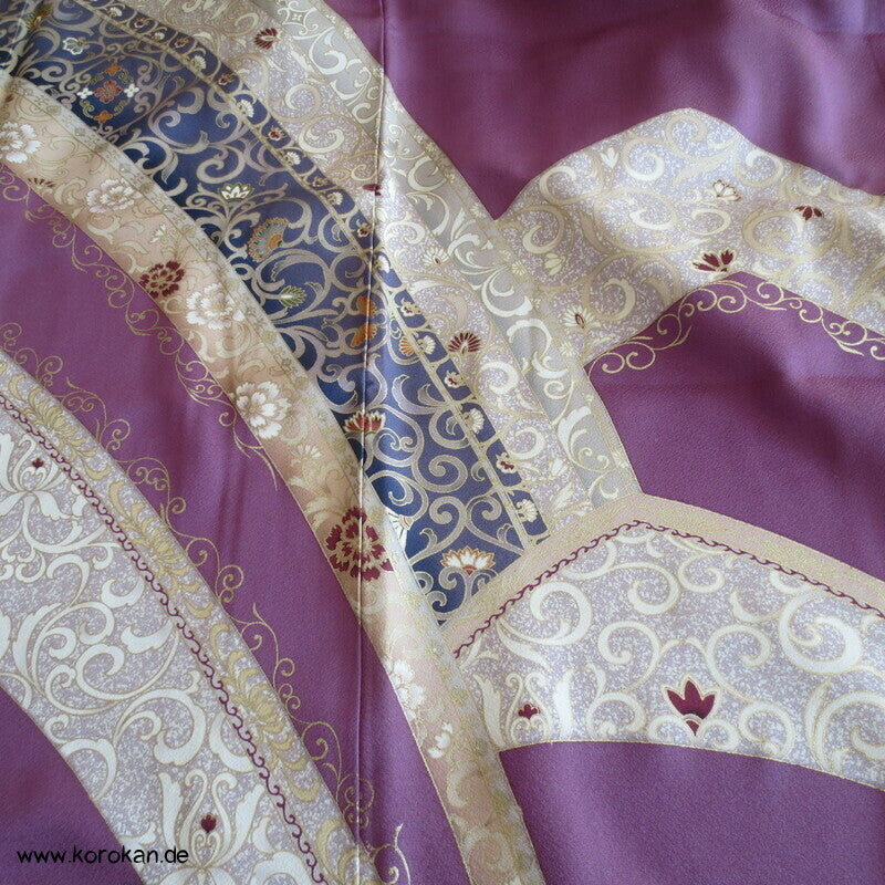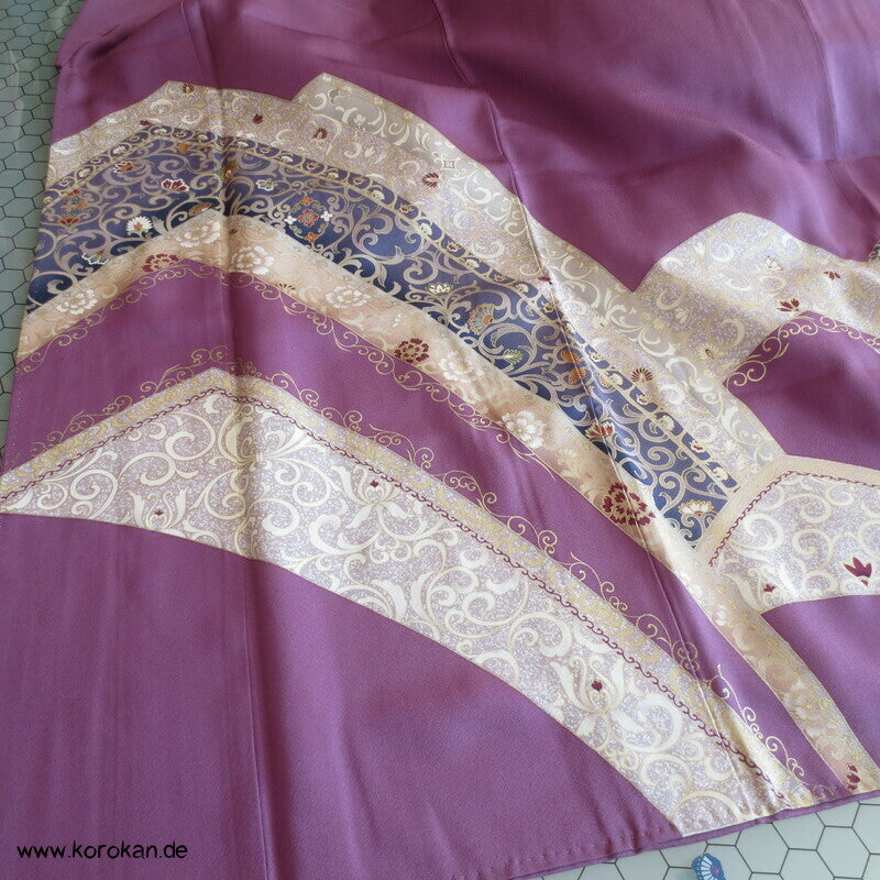 Vintage Irotomesode aus pflaumenlila Seidencrepe mit leicht abgewandelter Bindung mit einem Noshi Tanzashi Berge Motiv mit viel Golddruck und 3 Mon mit 3 Blätter Motiv.