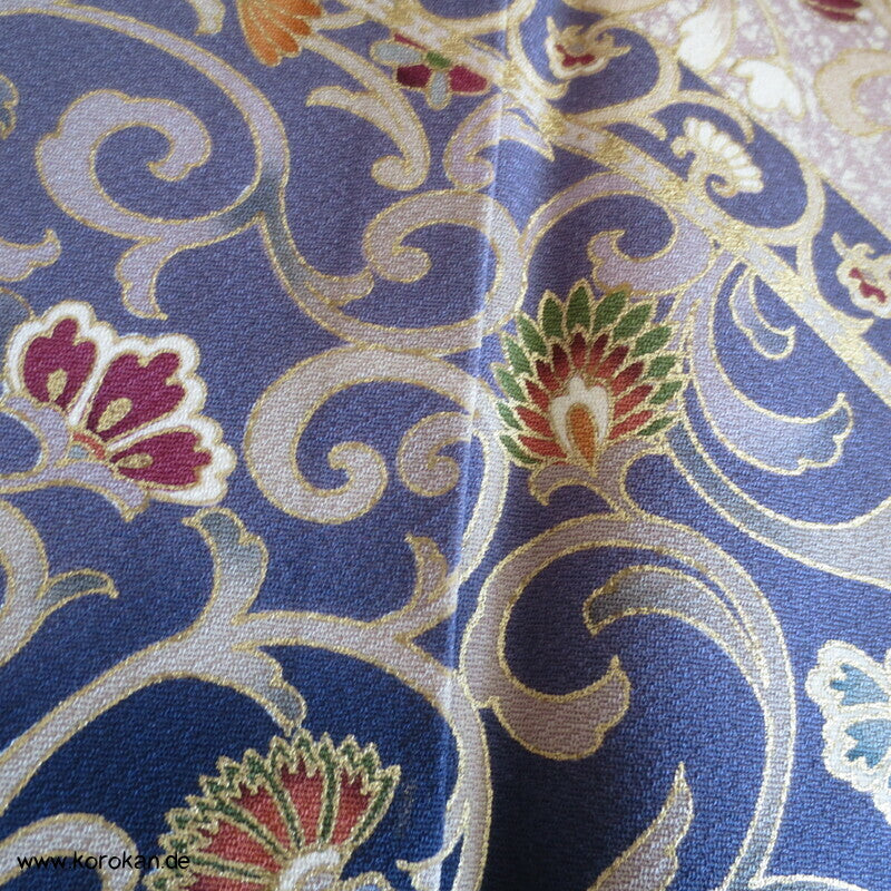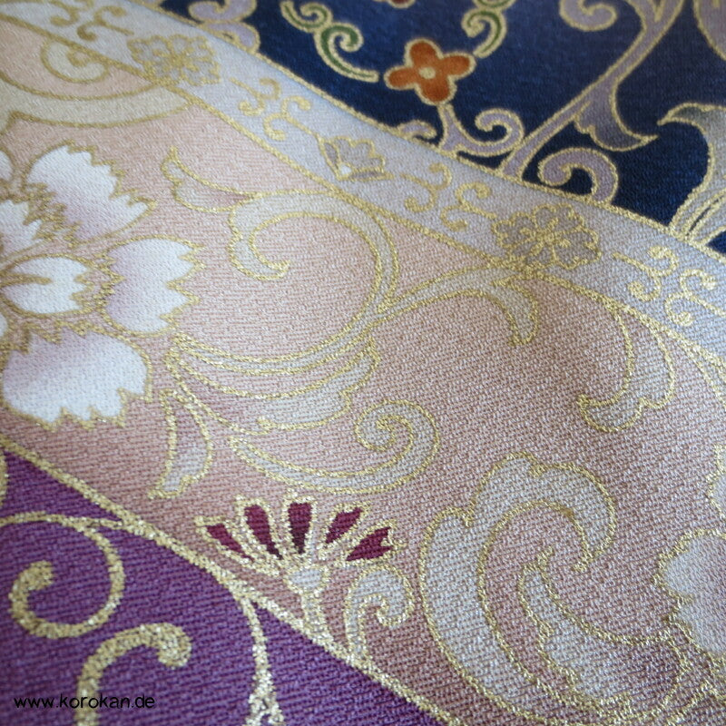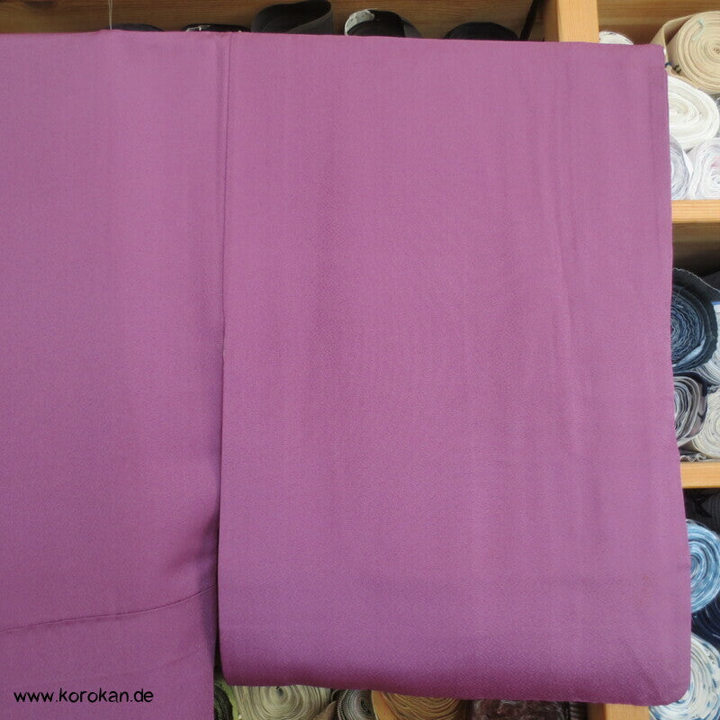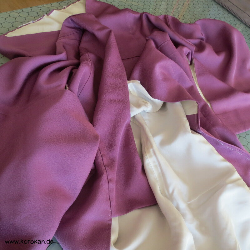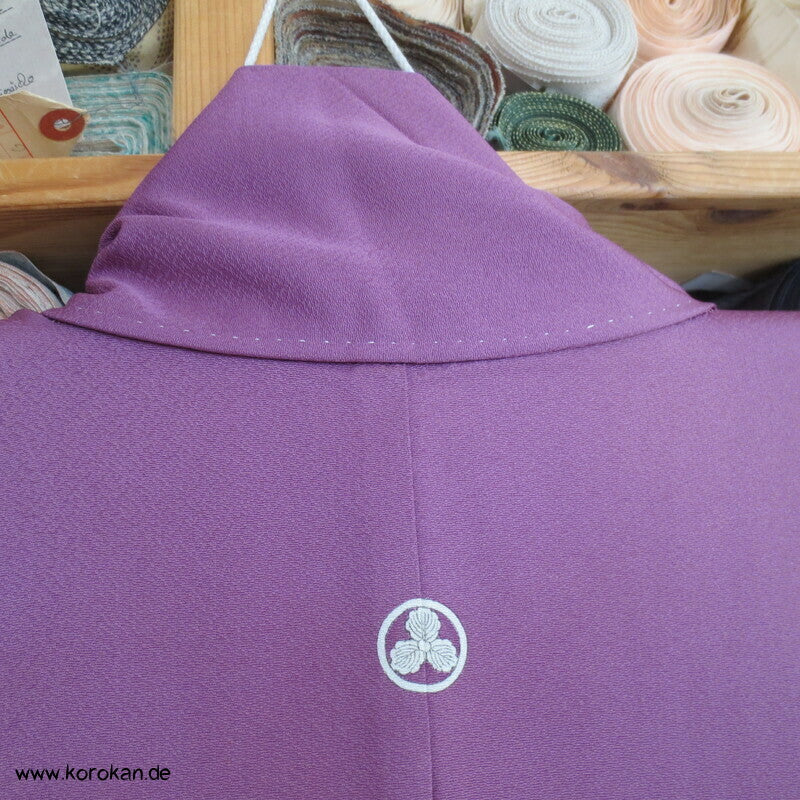 Vintage Irotomesode aus pflaumenlila Seidencrepe mit leicht abgewandelter Bindung mit einem Noshi Tanzashi Berge Motiv mit viel Golddruck und 3 Mon mit 3 Blätter Motiv.