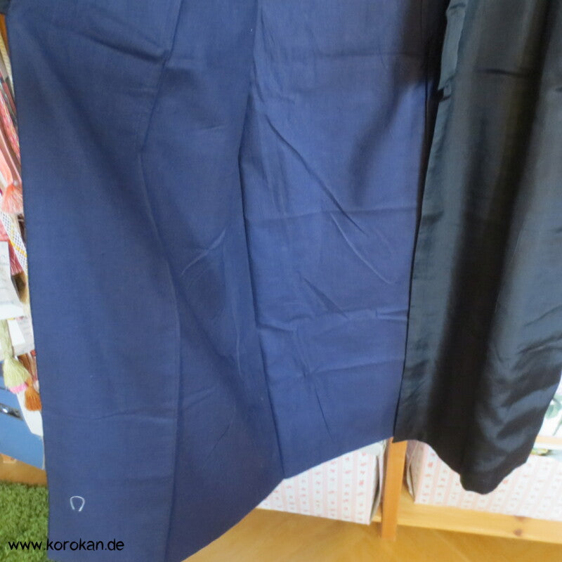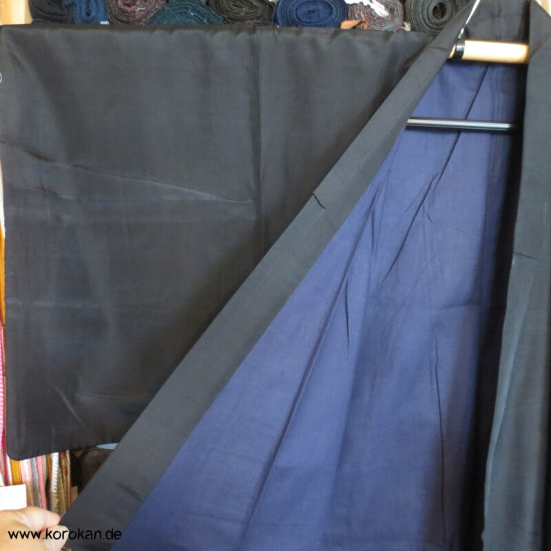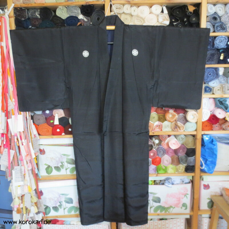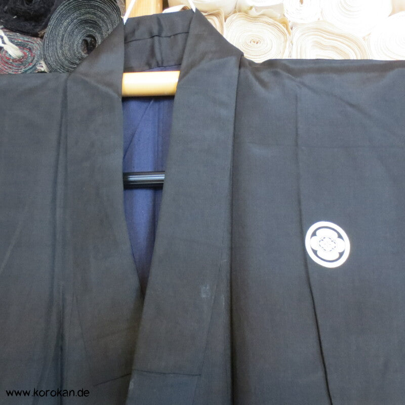 Vintage Männer Honan Seiden schwarzer formeller Kimono, mit 5 Mon, Futter blauer Baumwoll Chintz