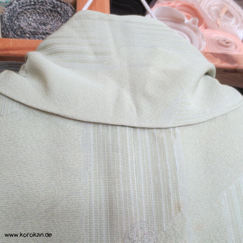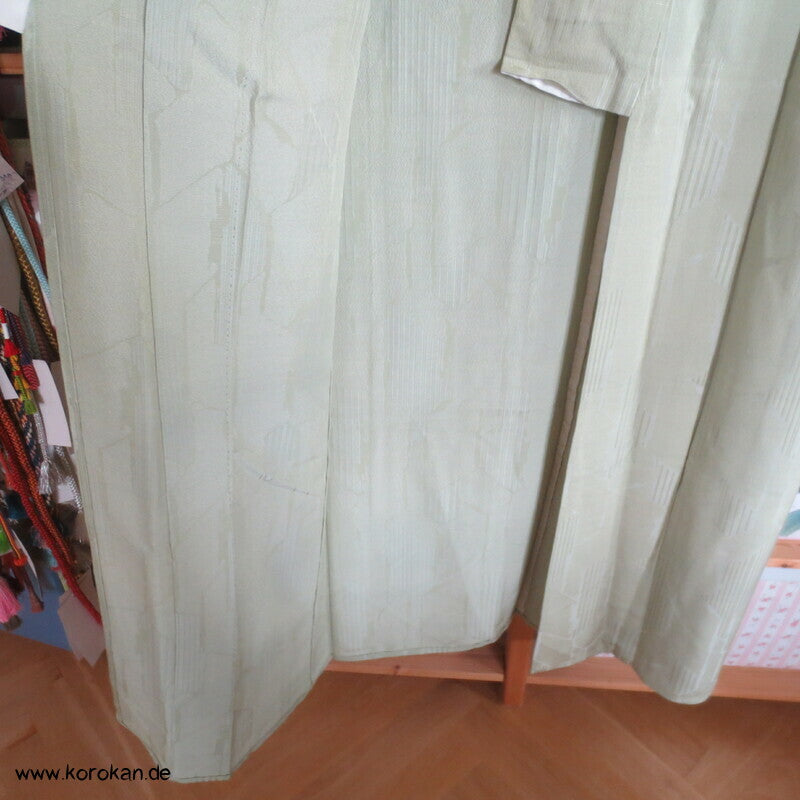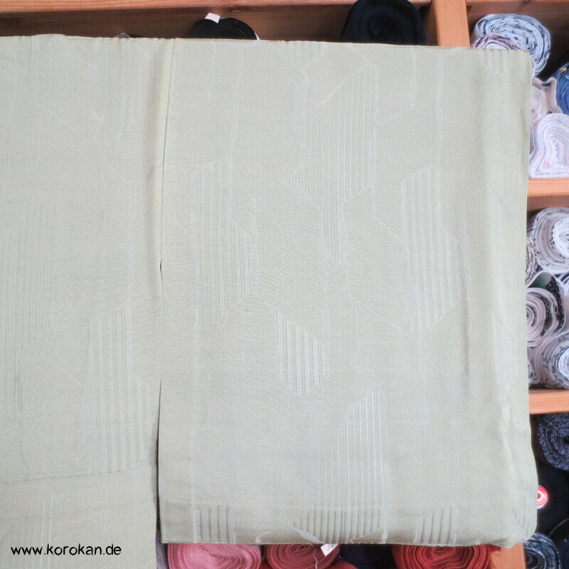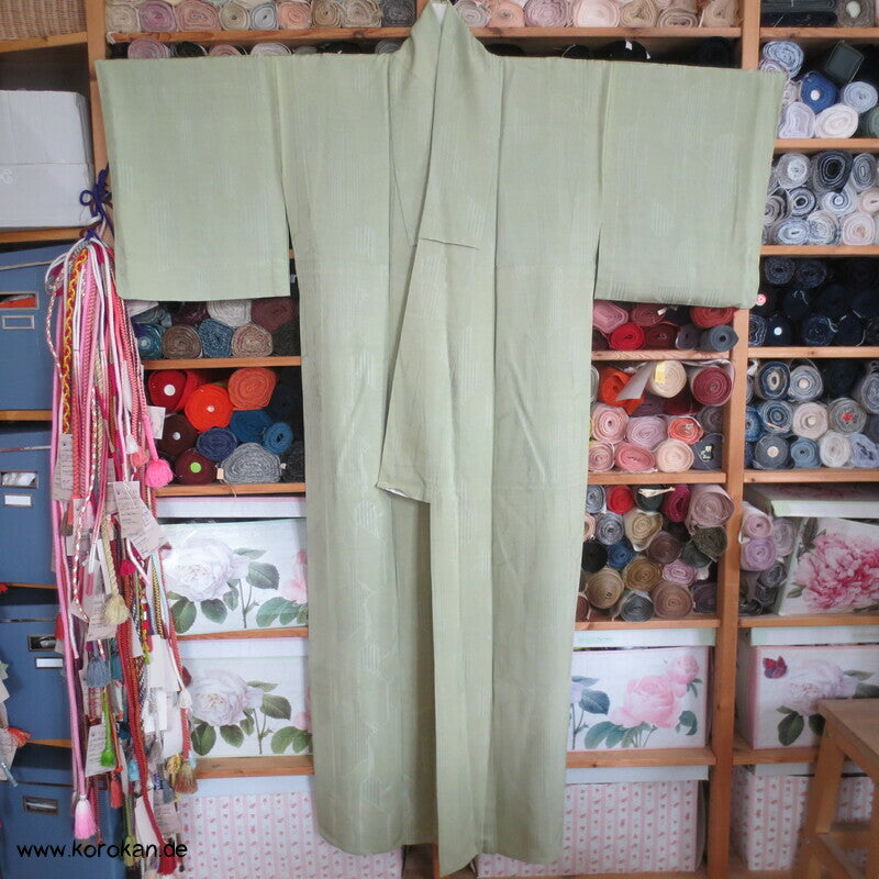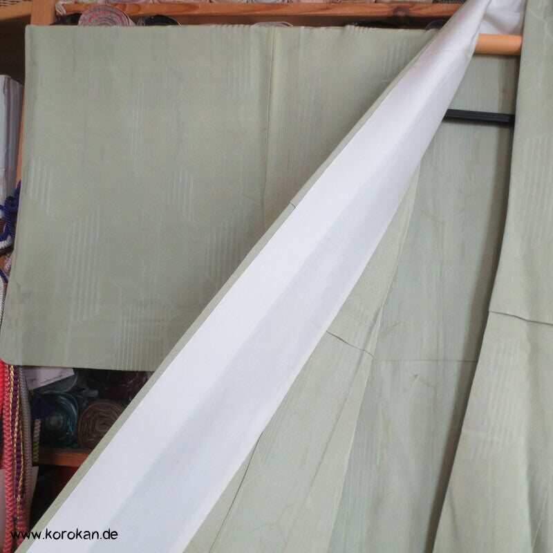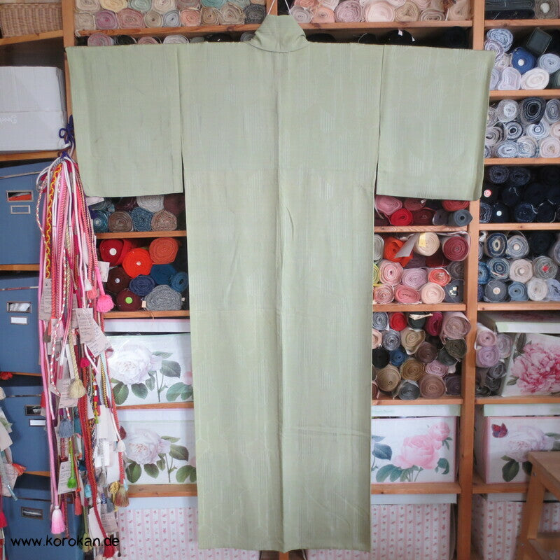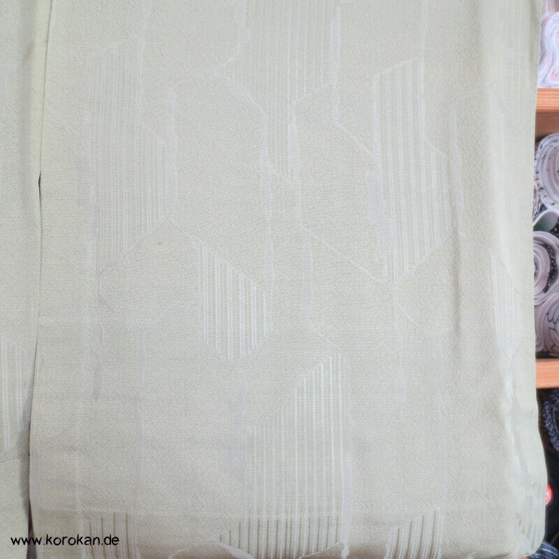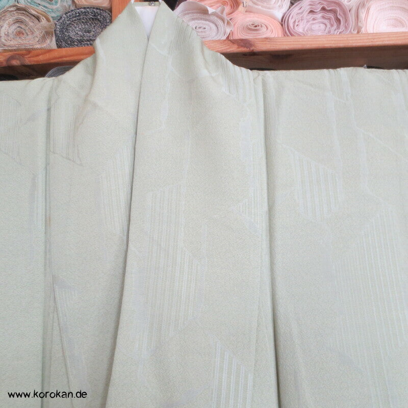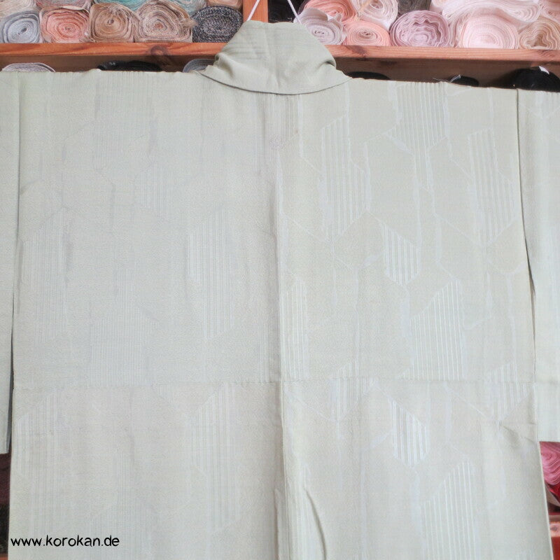 Vintage Seidendamast Iromuji Hitoe ungefütterter Kimono jadehellgrün mit eingewebtem abstraktem Kikko Muster, 1 gesticktes Mon im Nacken.