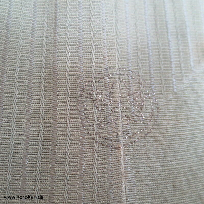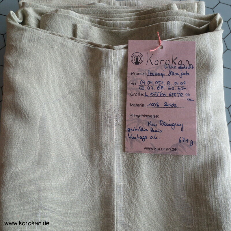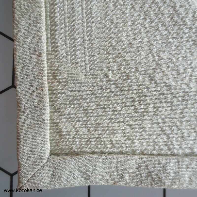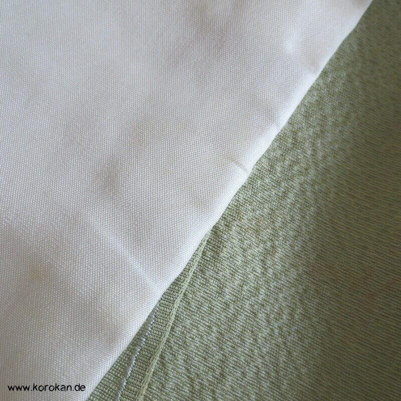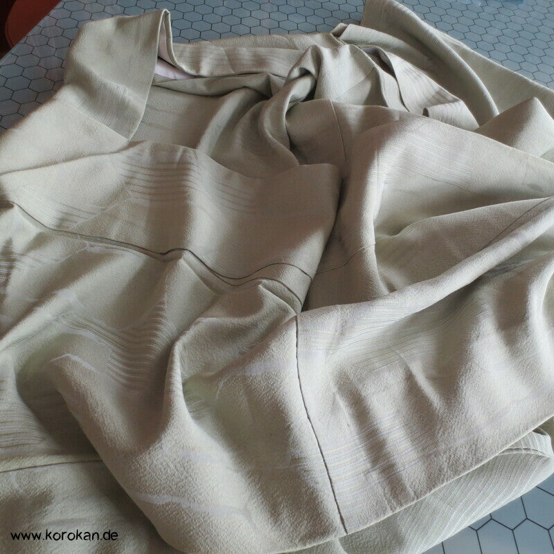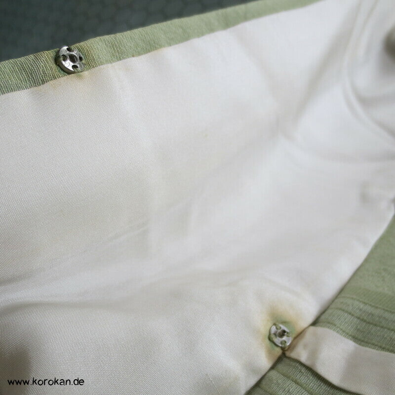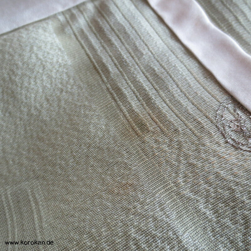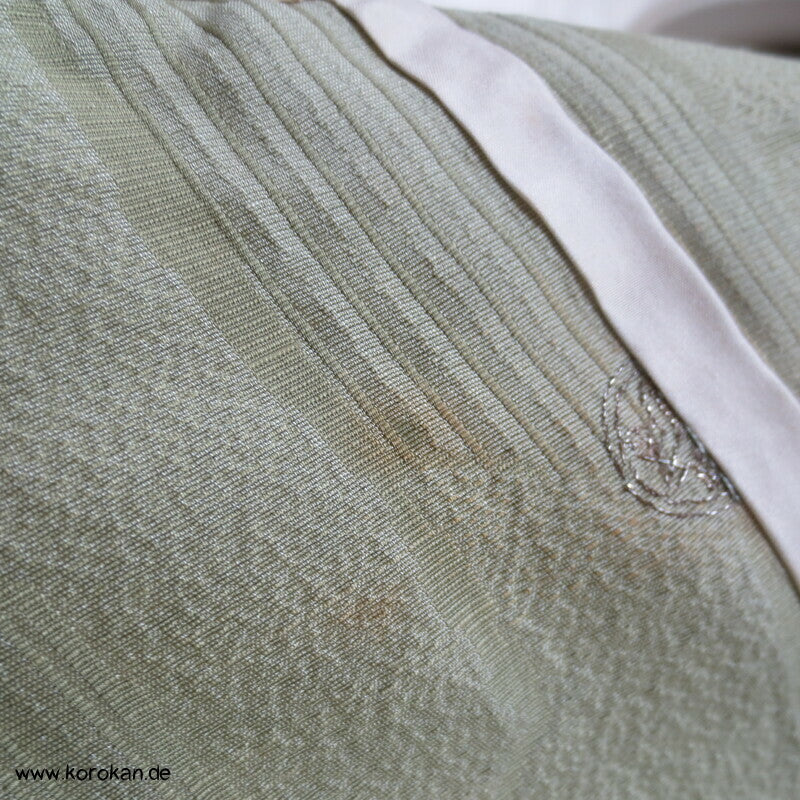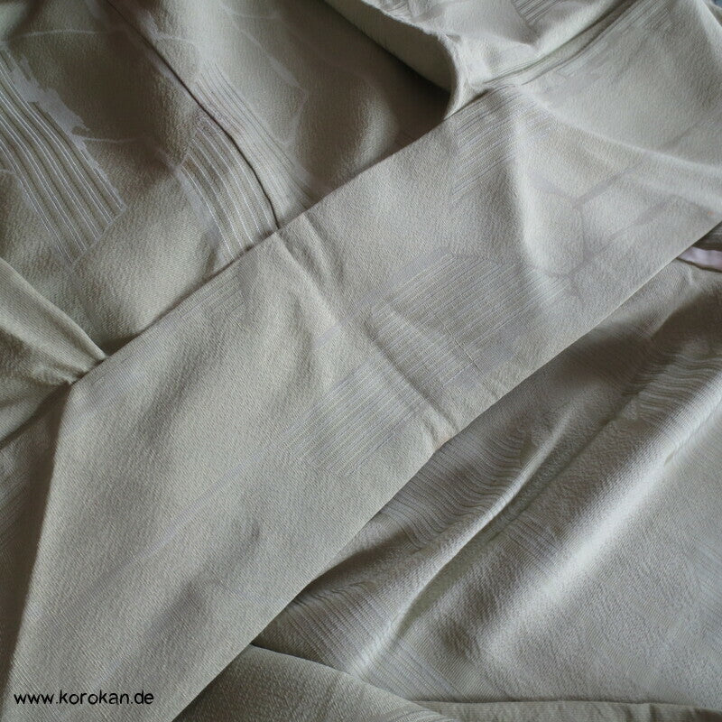 Vintage Seidendamast Iromuji Hitoe ungefütterter Kimono jadehellgrün mit eingewebtem abstraktem Kikko Muster, 1 gesticktes Mon im Nacken.