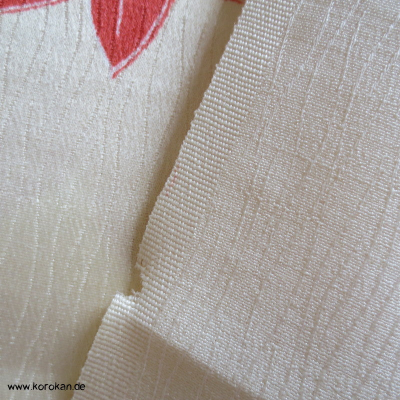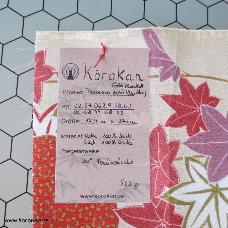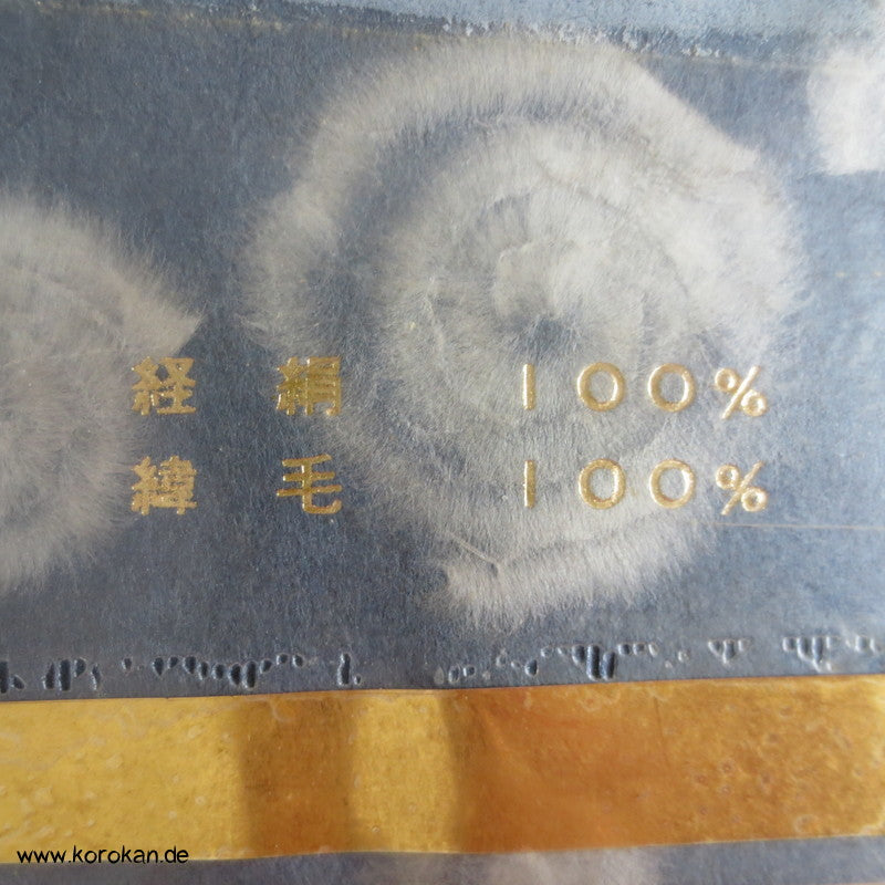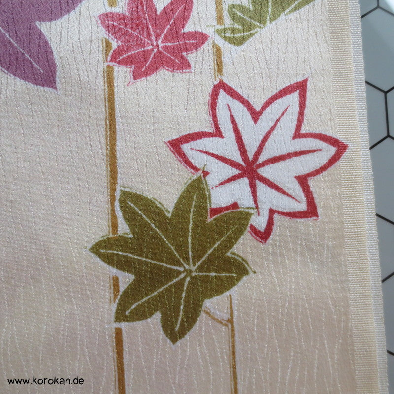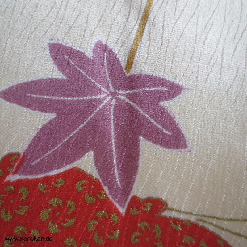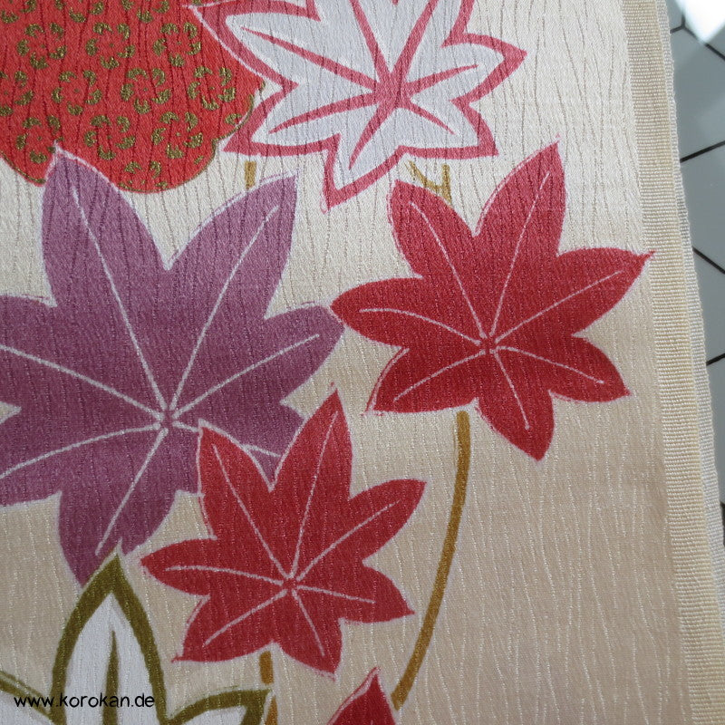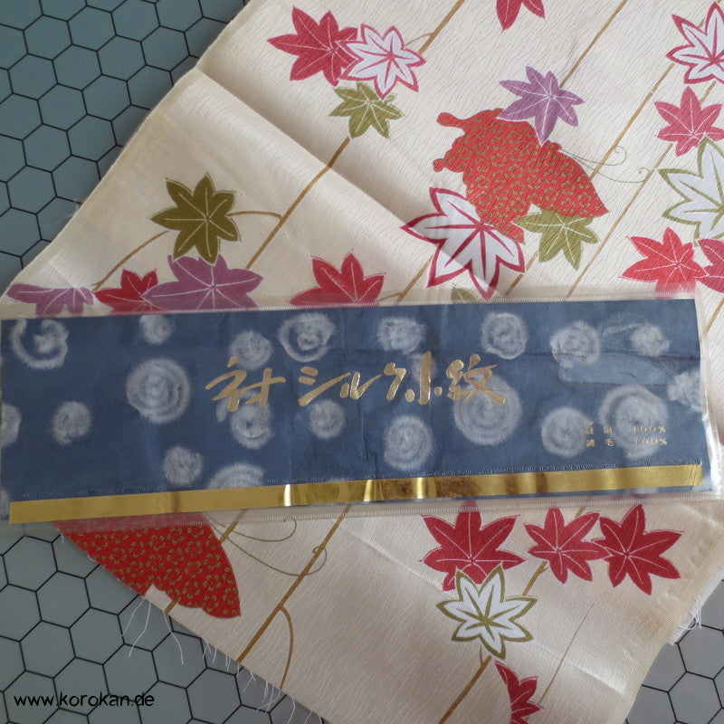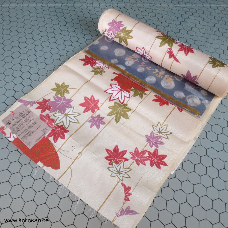 japanischer Vintage unbenutzter Kimono Seide / Wolle Damast natur Basis mit gewebten Wellen, mit Schmetterlingen und Ahornblättern mit Golddruck.