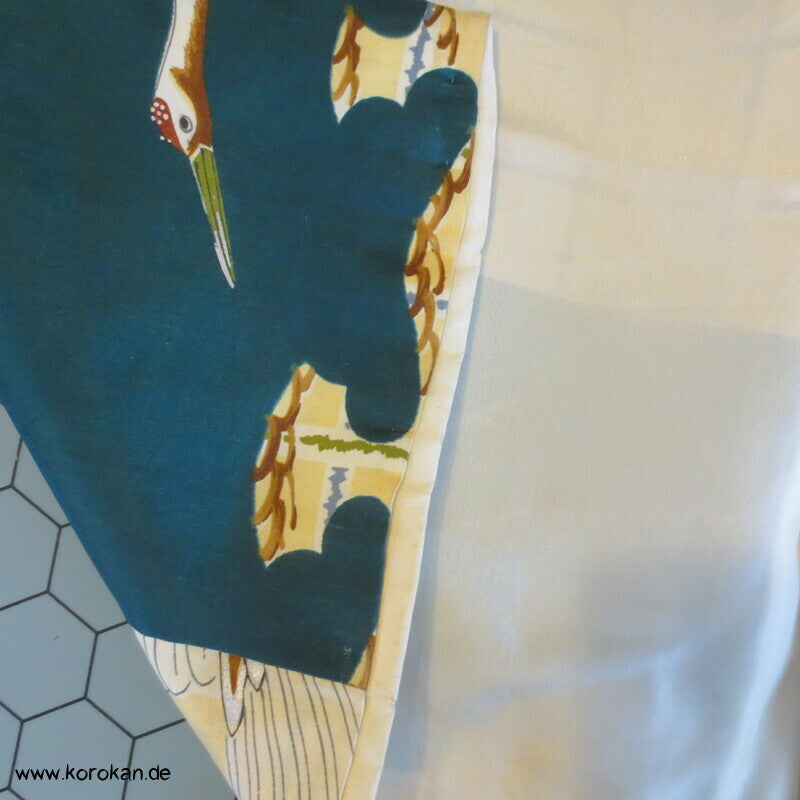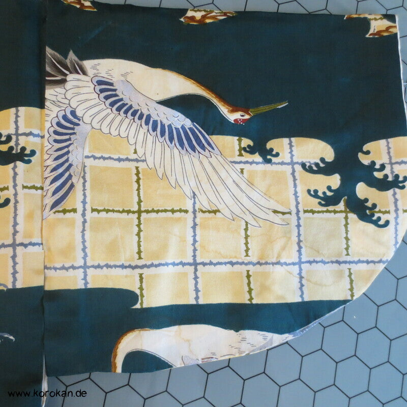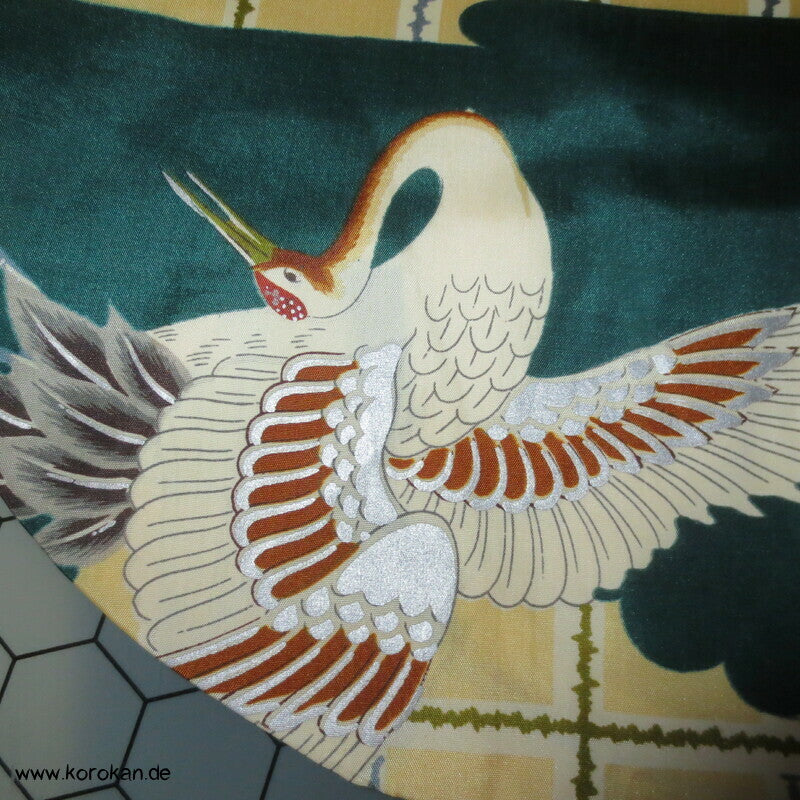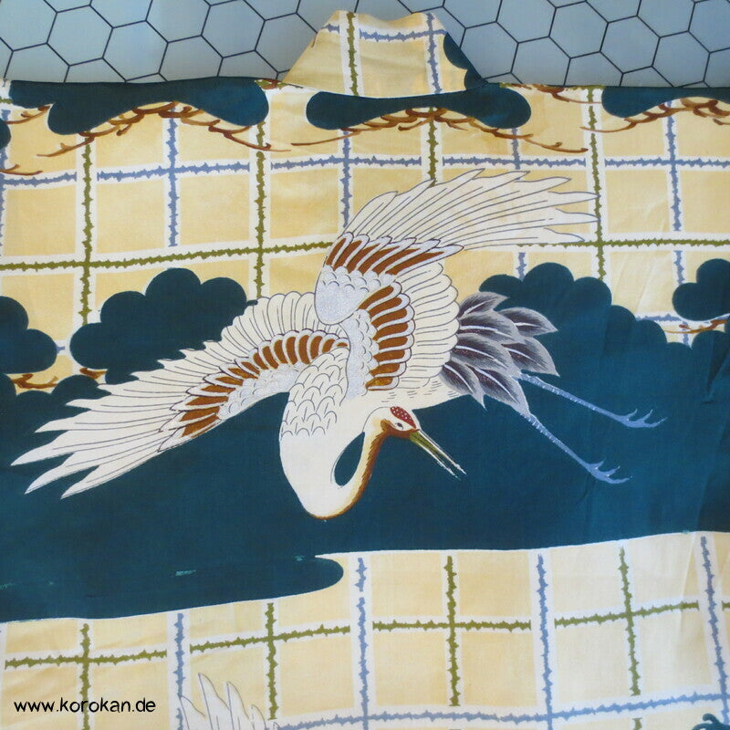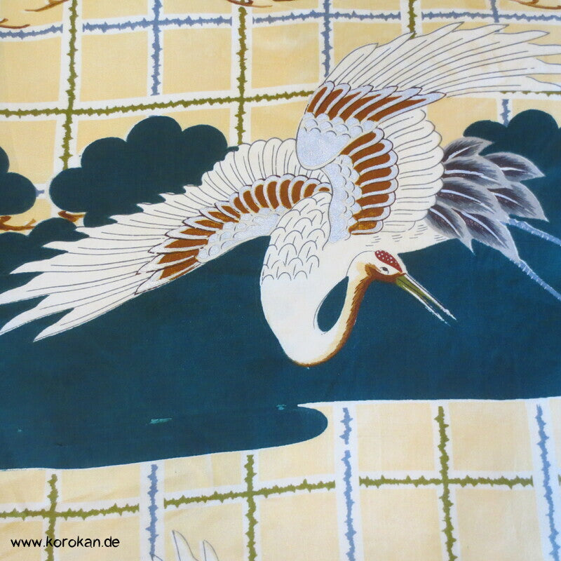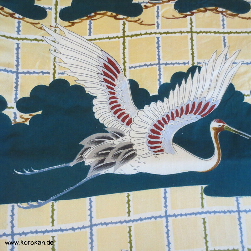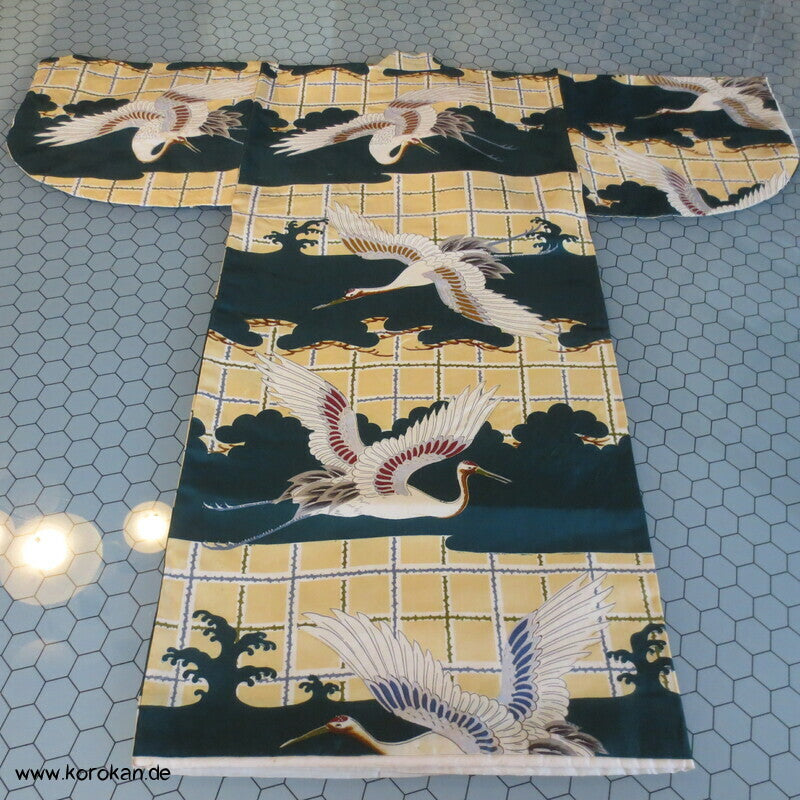 Taufkimono, antiker Kimono für kleine Jungen, Kraniche auf Seitentaft mit Silberbemalung