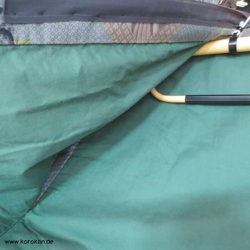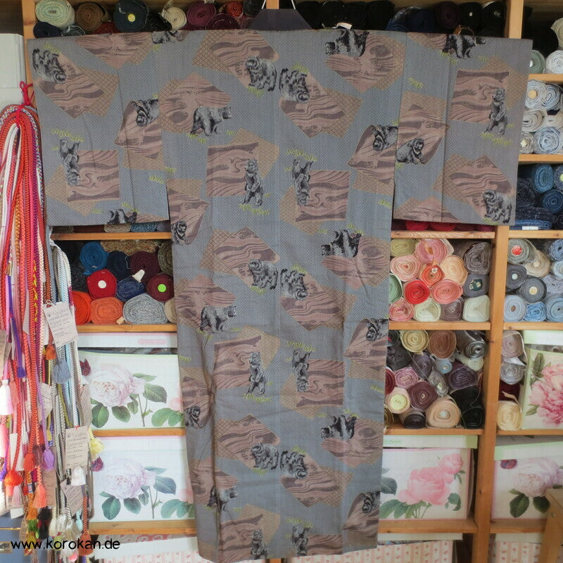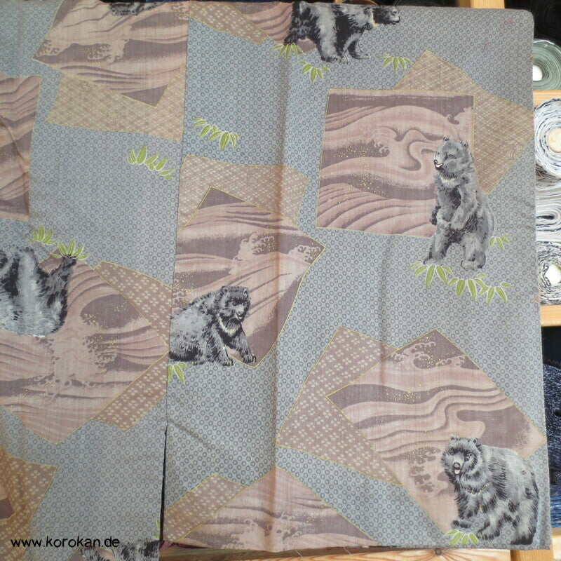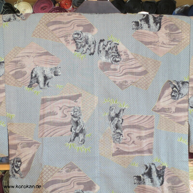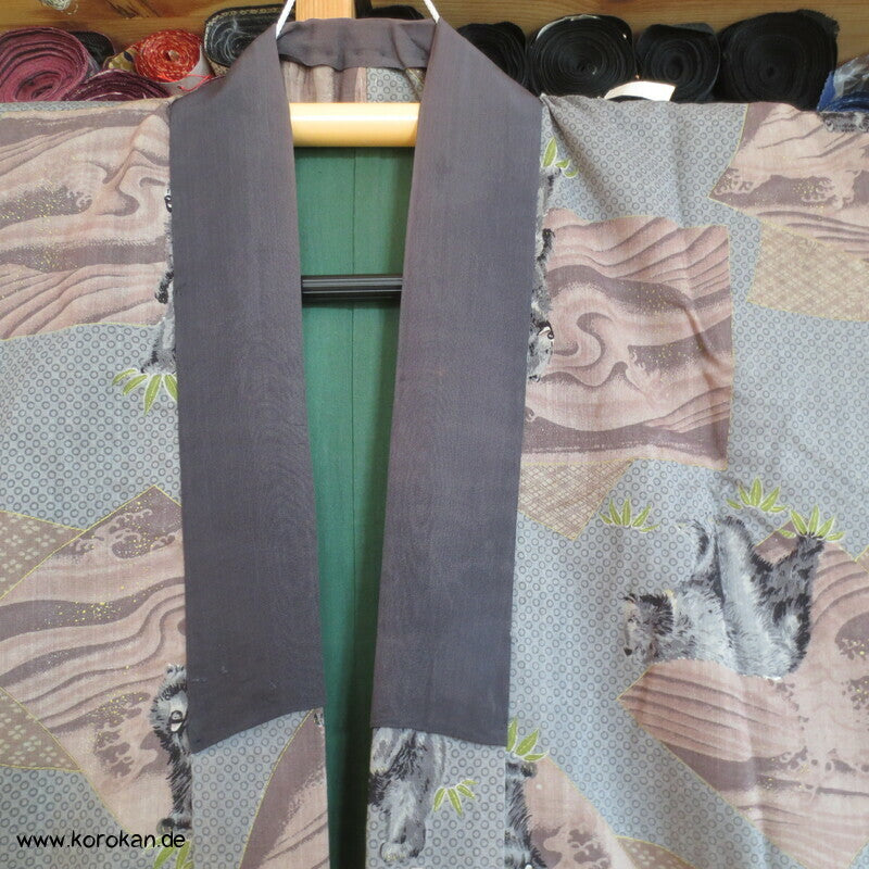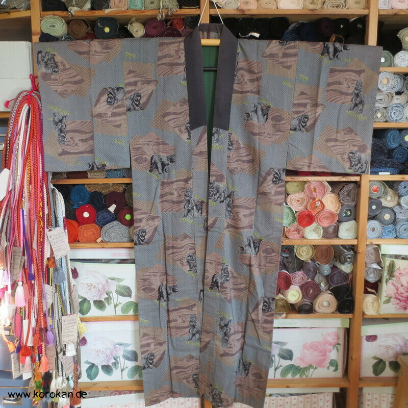 Vintage Männer Juban Unterkimono aus feinem weichen Woll Musselin bedruckt mit Bären und Shikishi Bildern auf grau, grünem Baumwollfutter und Seidenripskragen