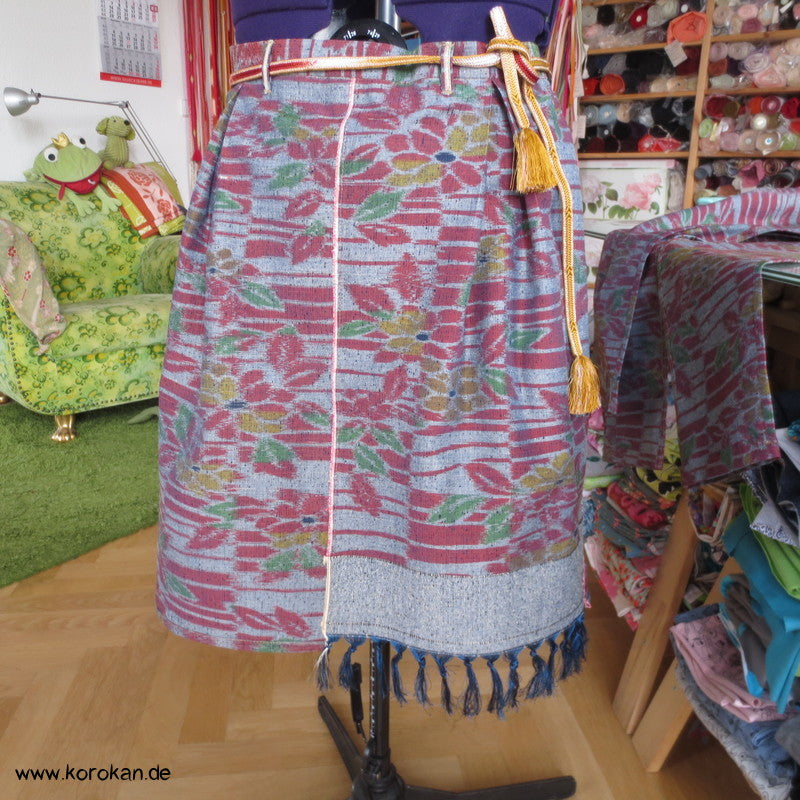 weiter Bahnen Falten Rock aus einem japanischen Kimono dicken Tsumugi Seide Stoff mit Kasuri bunten Blüten auf graublau, mit Endstücktroddeln, ungefüttert, Reissverschluss, Metallknopf, Gürtelschnallen, mit Obijime