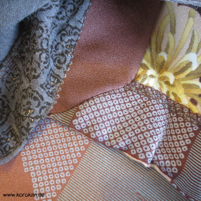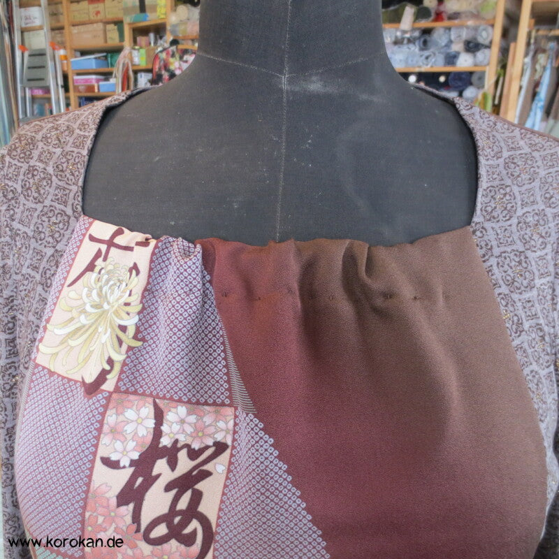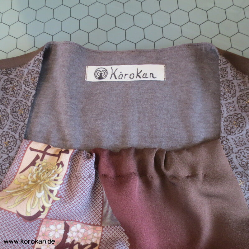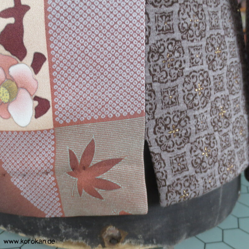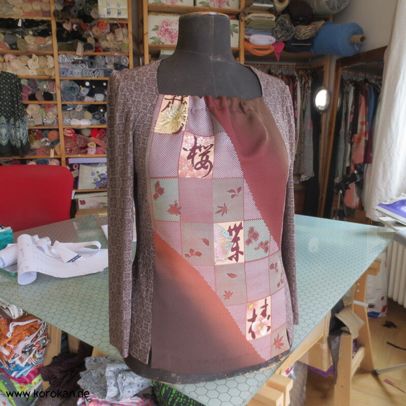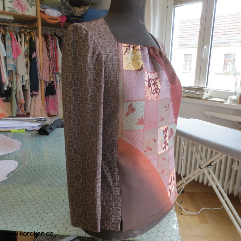 Panelshirt aus einem Kimonoseiden Stoffrest Seidencrepe mit Ichimatsu Karos mit lauter unterschiedlichen Motiven kombiniert mit Baumwolljersey mit Ornamente mit gold Druckmuster