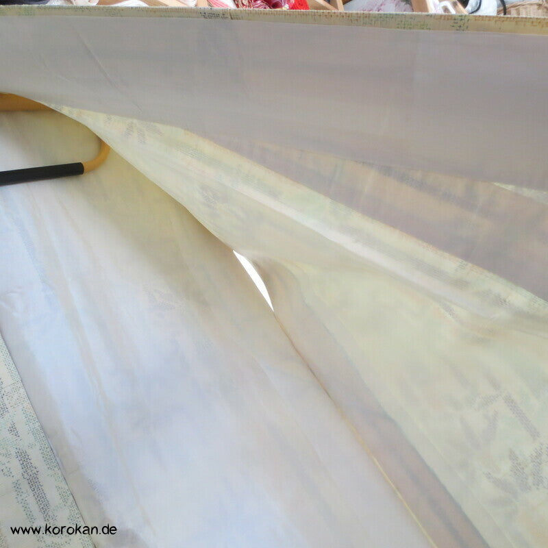 Vintage Tsumugi Seide Komon Kasuri Bambusmuster hellgrün hellgelb in natur, oberes Futter hell, unteres Hakkake Futter Seide mit Bokashi Verlaufsrand