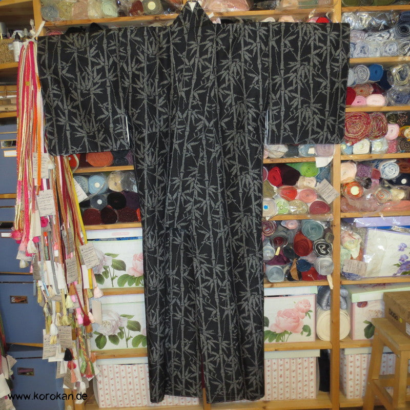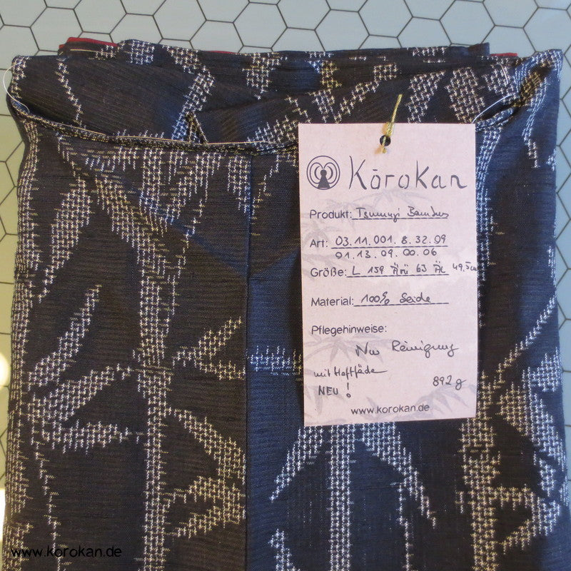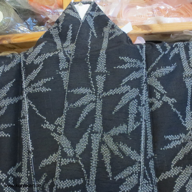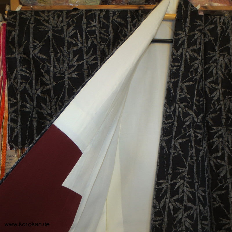 Vintage Tsumugi Seide Komon Kasuri Bambusmuster weiß in schwarz, oberes Futter hell, unteres Hakkake Futter rote Honan Seide