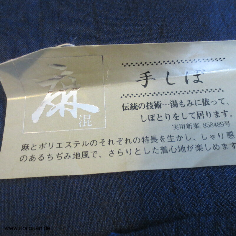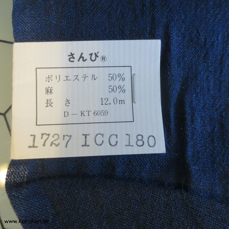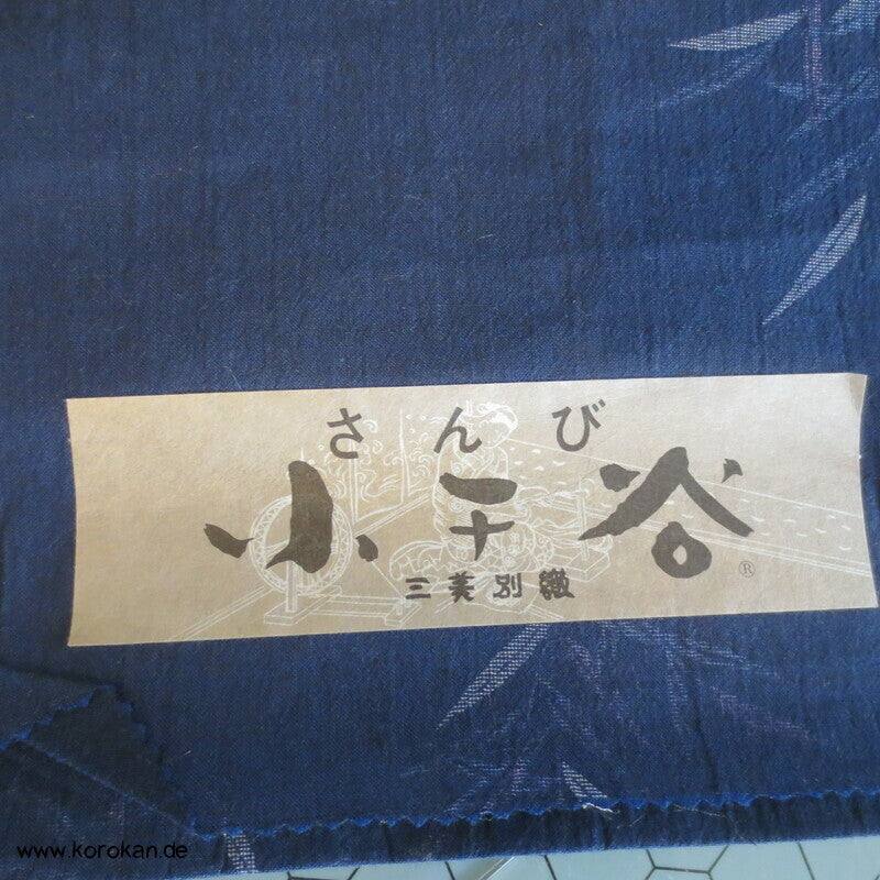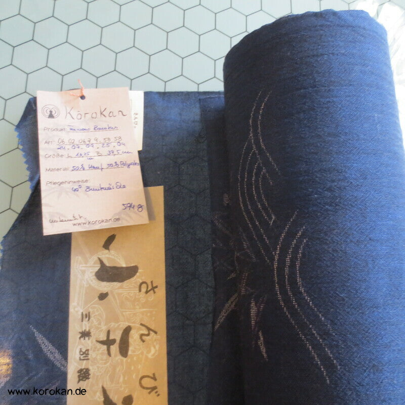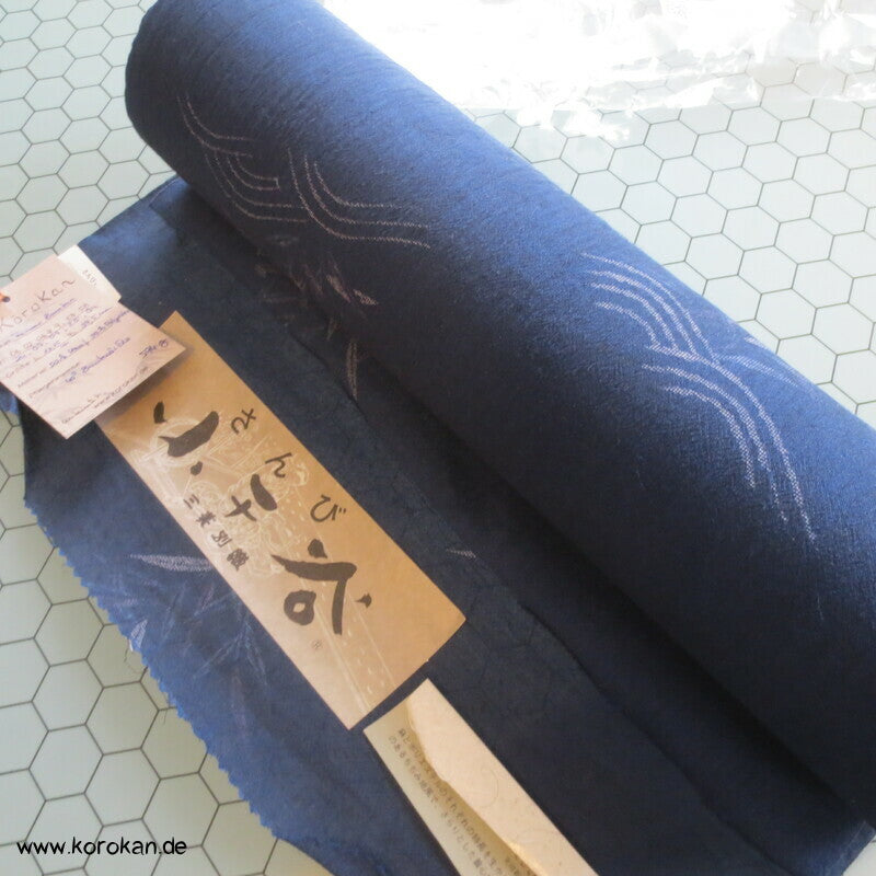 Vintage unbenutzte originalgeheftete Yukata Kimono Stoff Rolle grober meliert gewebter Krepp blau schwarz mit eingewebten Wellen und Bambusmotiven.
