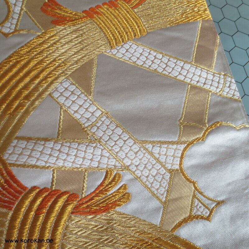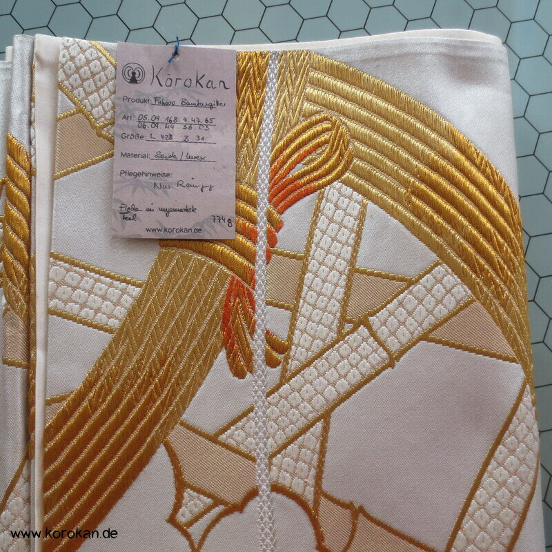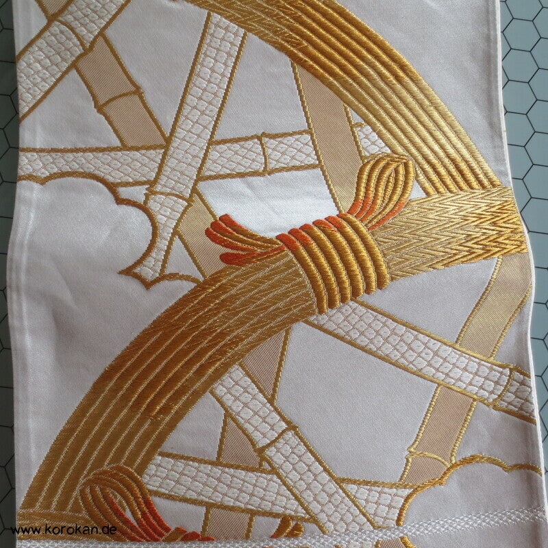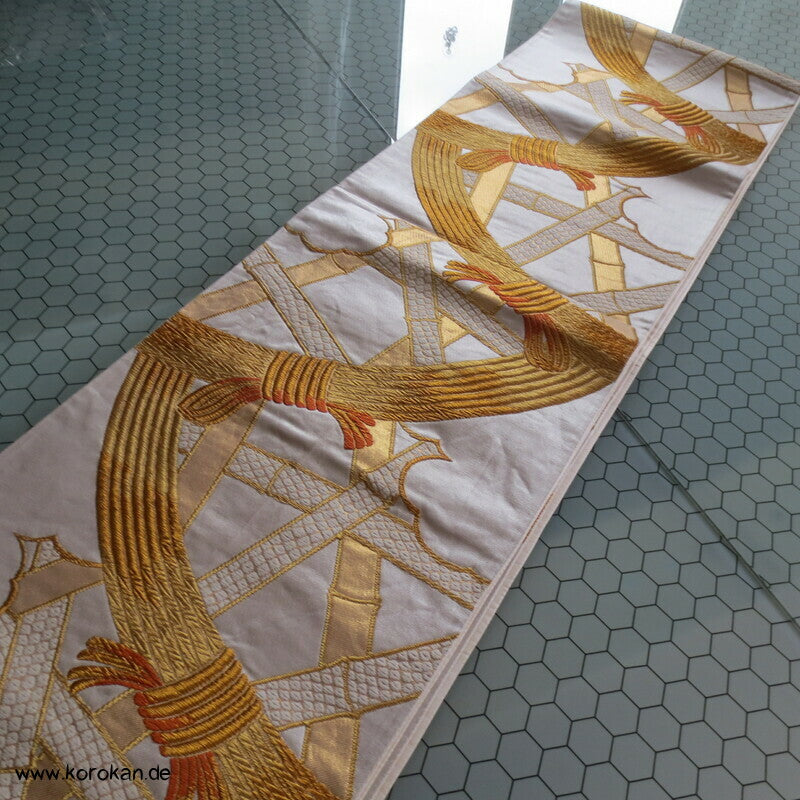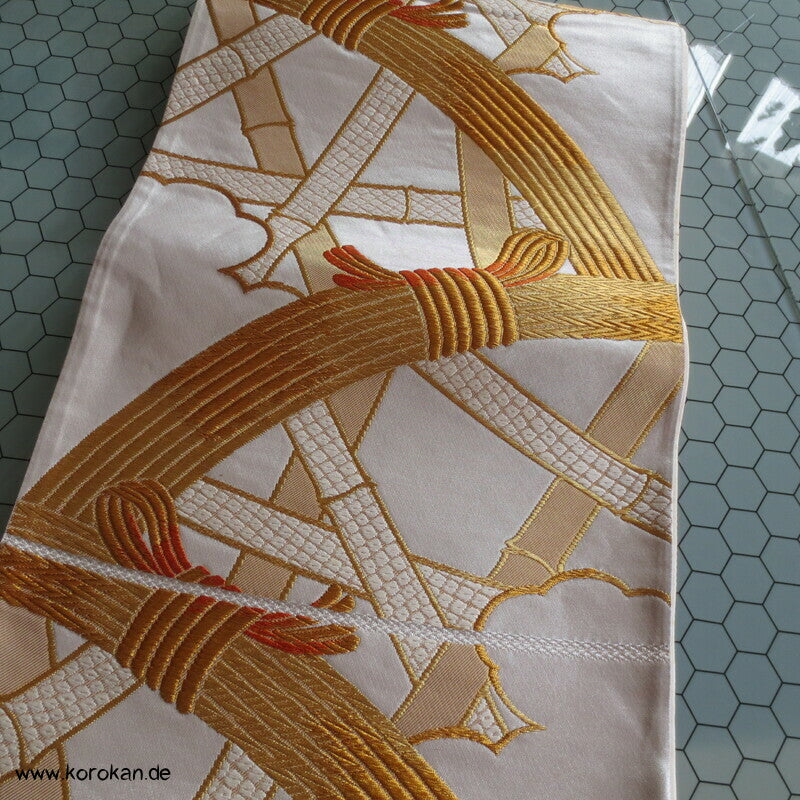 Bambusgeflecht Seiden Brokat Fukuro Obi, goldener Kimonogürtel