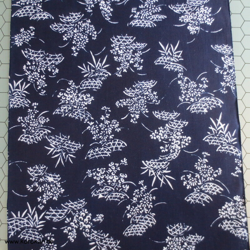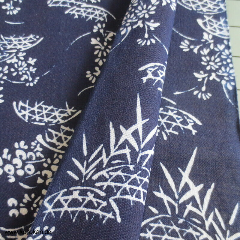 Vintage unbenutzter originalgehefteter Männer Yukata Leinwand Baumwoll Stoff für Sommerkimono mit einem weißen Bambusgitter und Chrysanthemenbüschen auf dunkelblau.