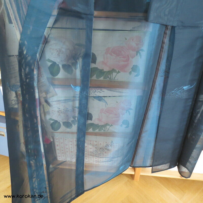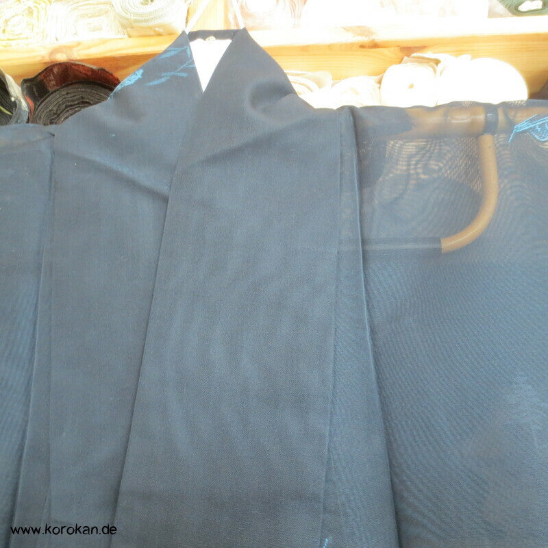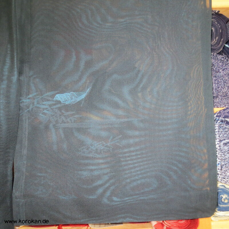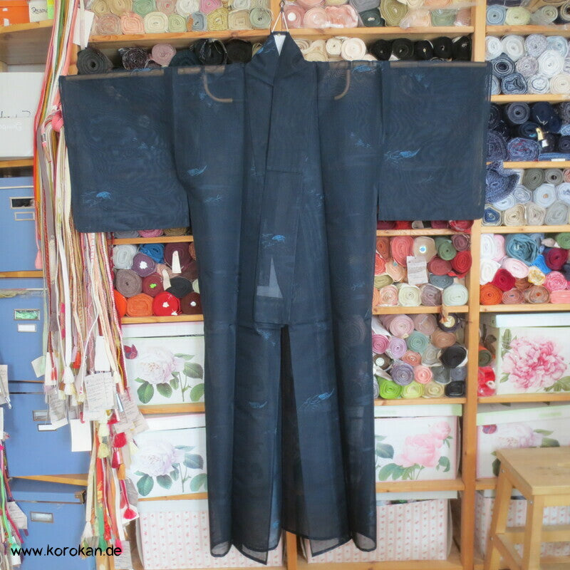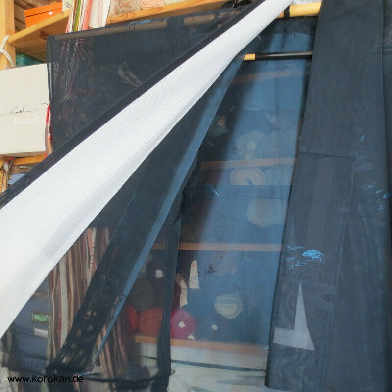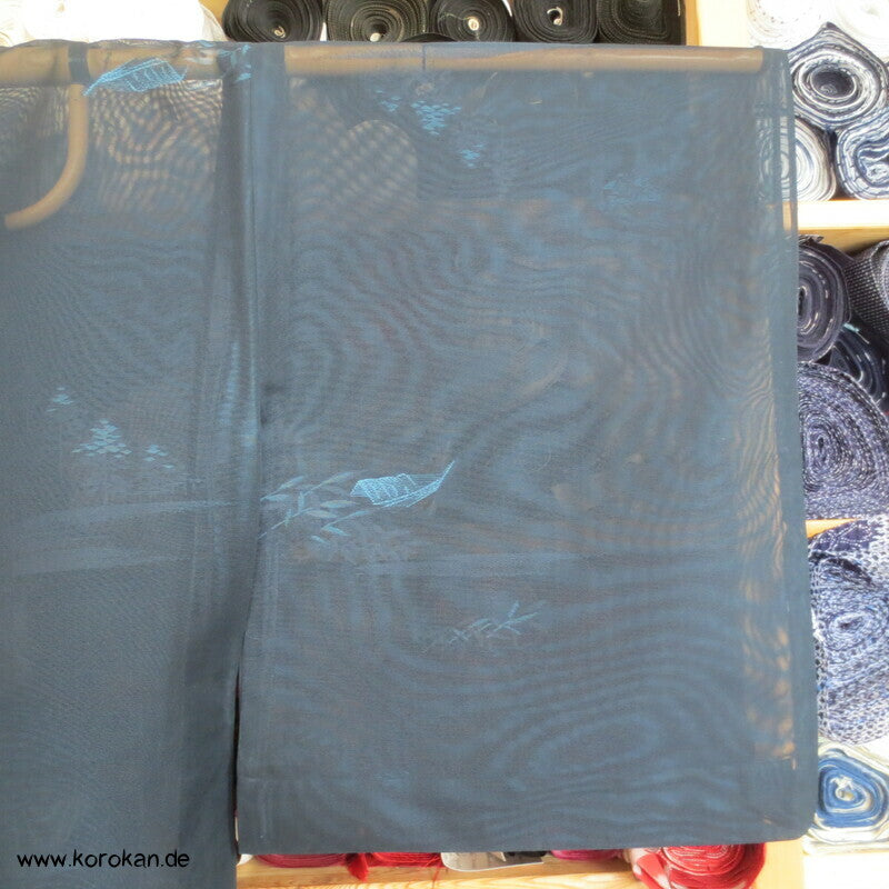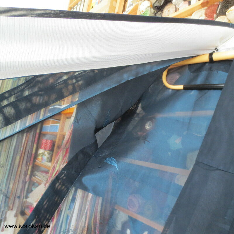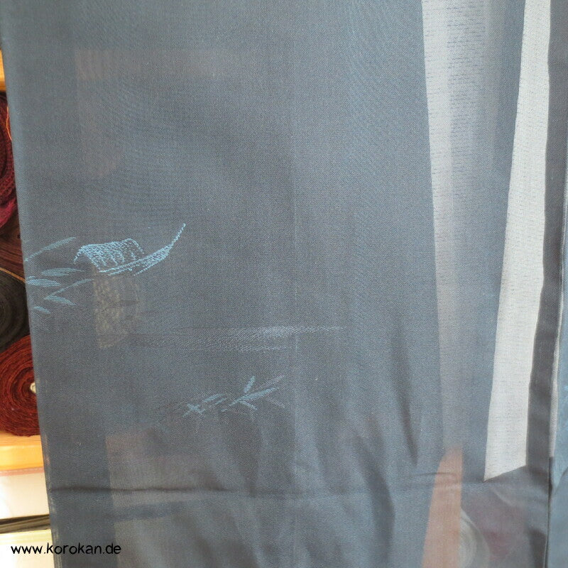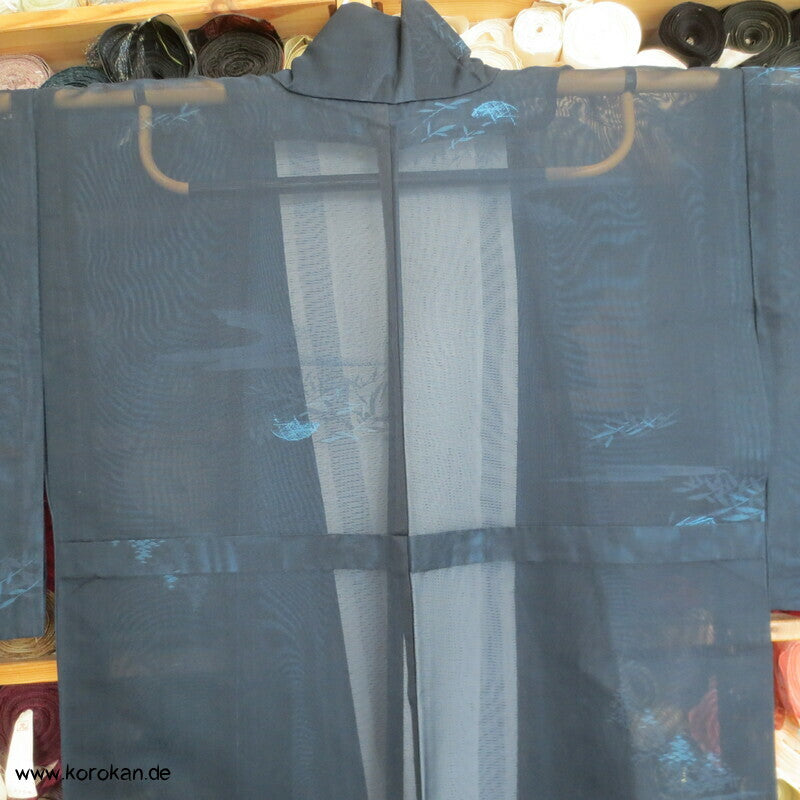 Vintage Sha Muster Drehergewebe Seide Kimono dunkelblau eingewebte Boote am Seerand mit Bambusgittern und Blättern blau in blau, für den Sommer oder als Negligée
