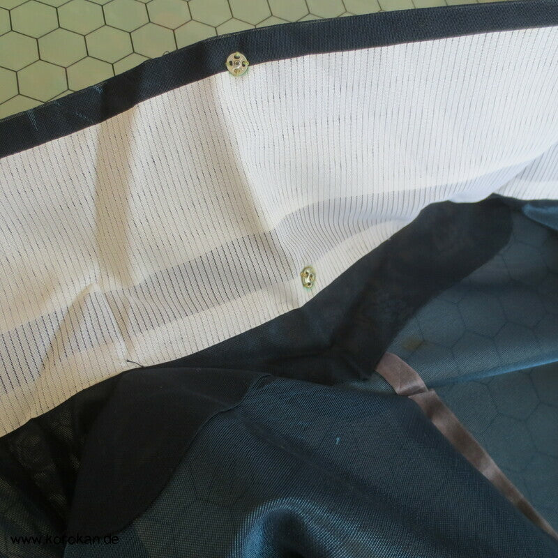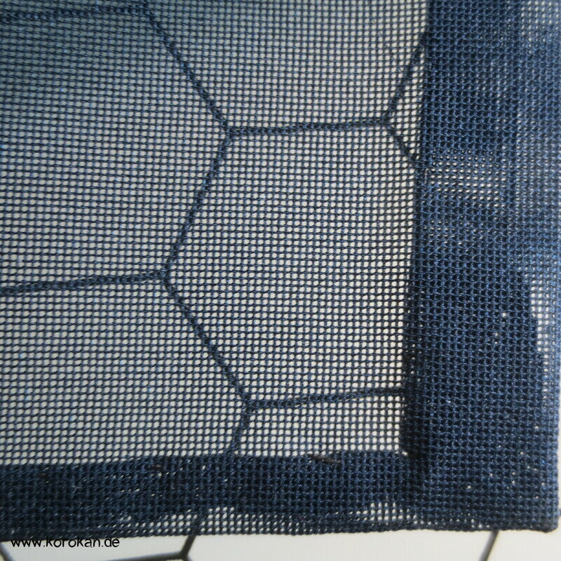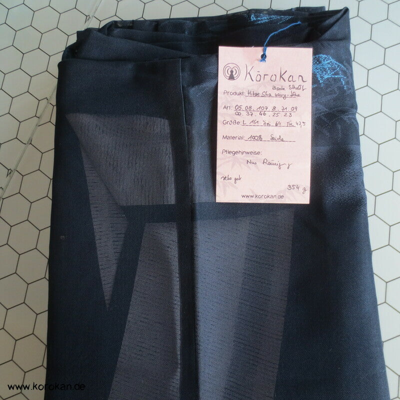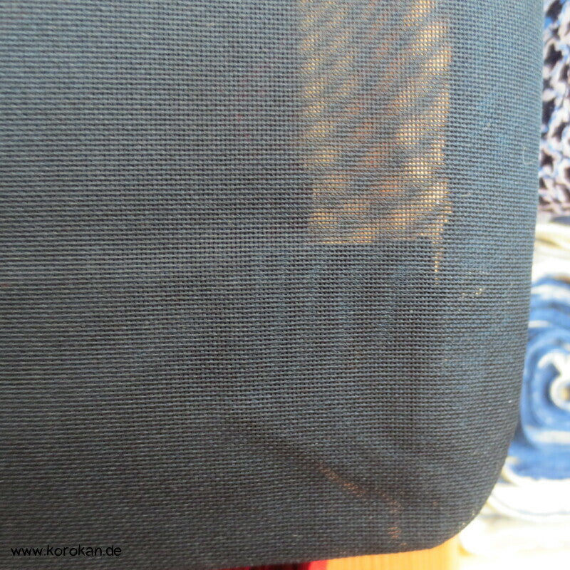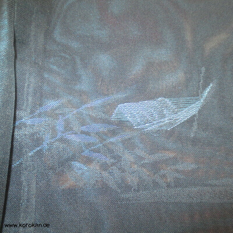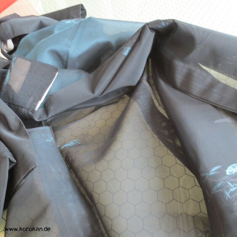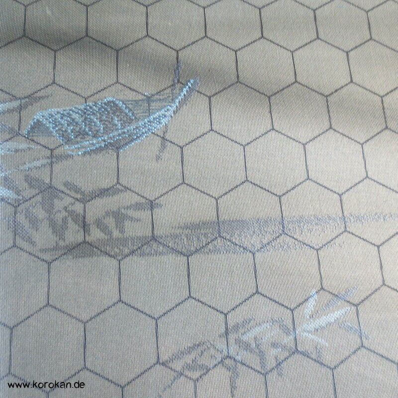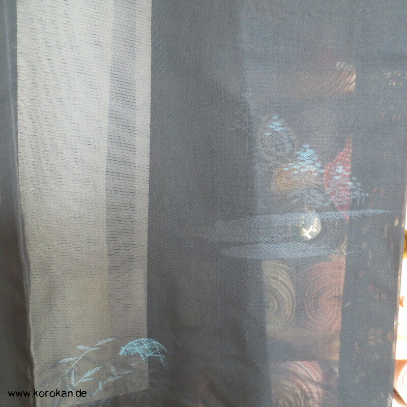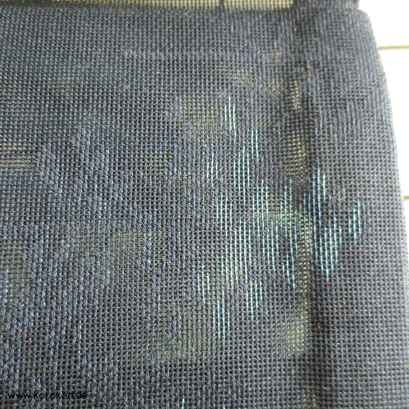 Vintage Sha Muster Drehergewebe Seide Kimono dunkelblau eingewebte Boote am Seerand mit Bambusgittern und Blättern blau in blau, für den Sommer oder als Negligée