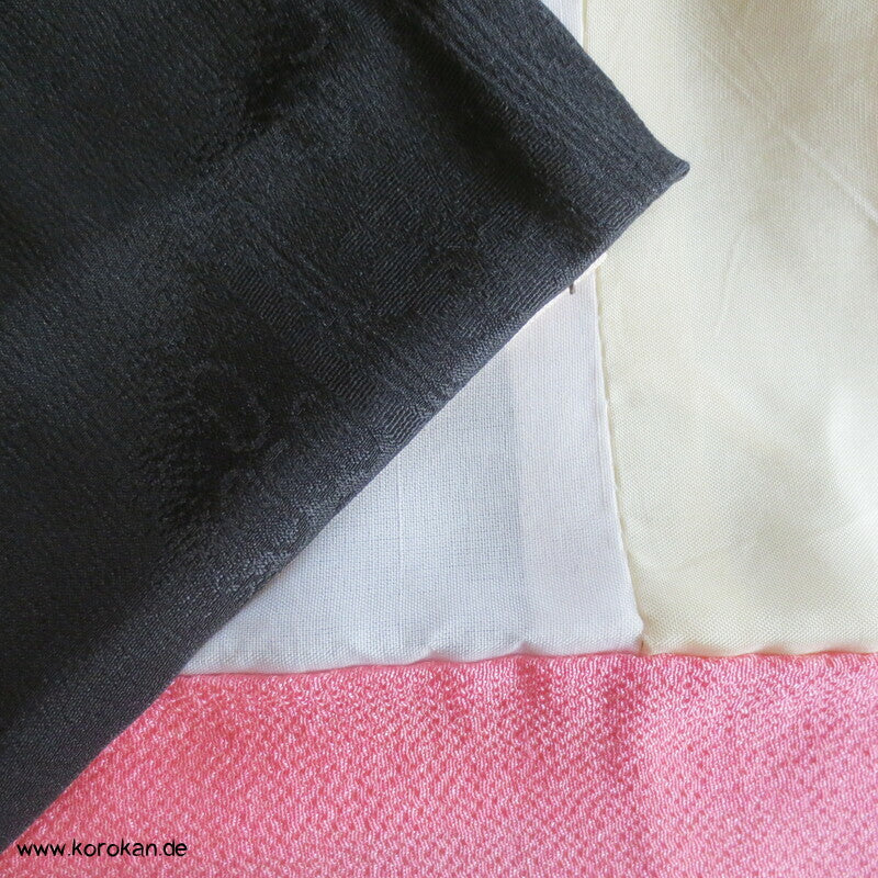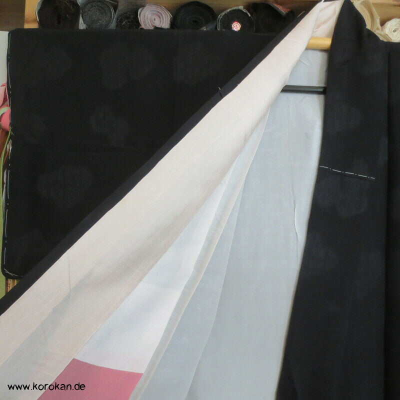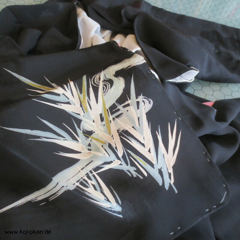 Vintage, eher antiker Homongi Kimono schwarzer Seidendamast mit abstrakten und Blumenmotiven, bemalt mit Bambus, teils gold, feinem oberen hellen Seidenfutter und unterem Hakkake Seidenfutter in rosa