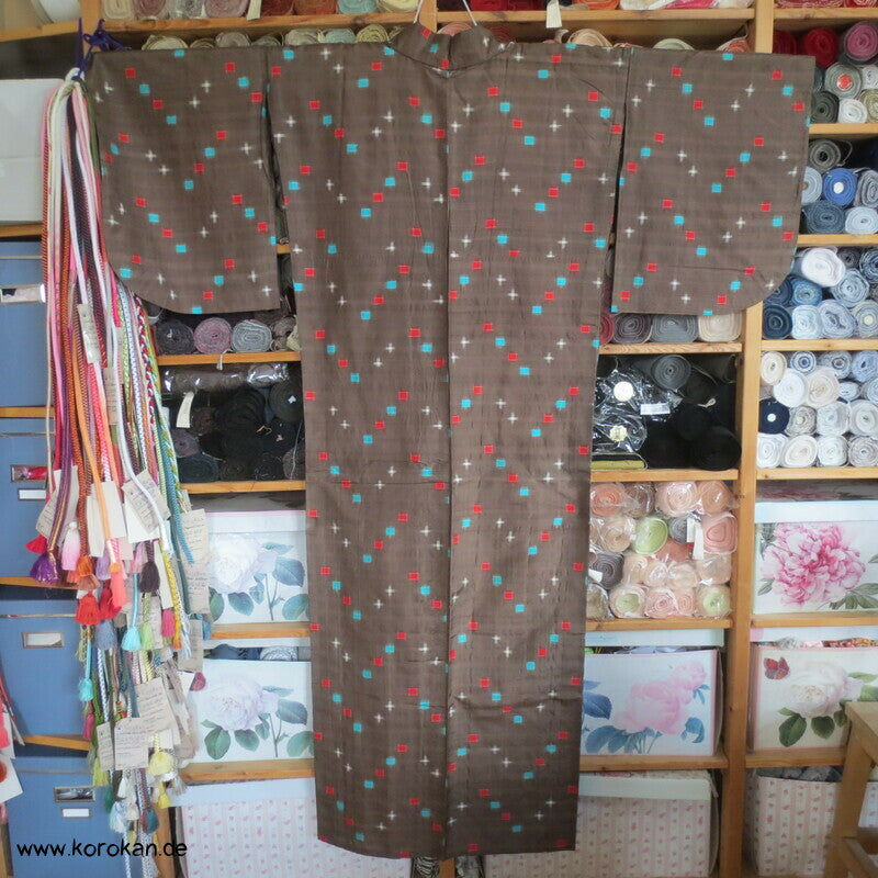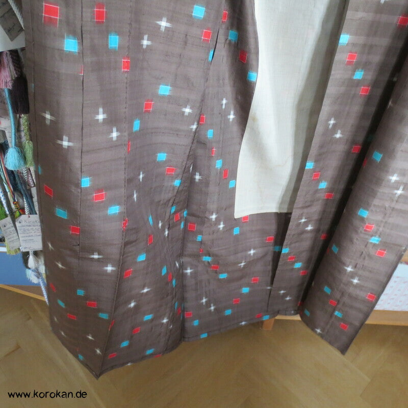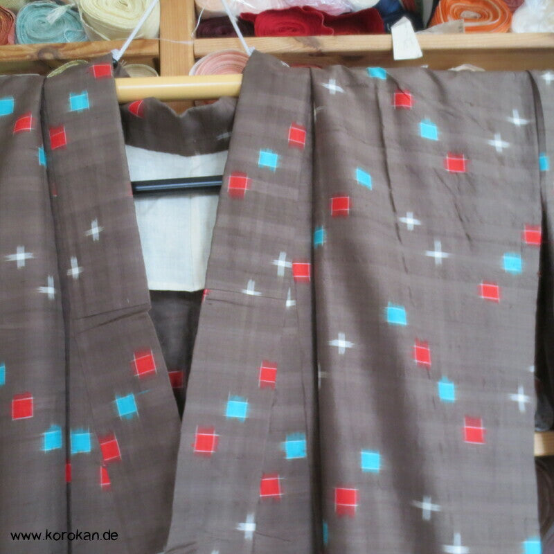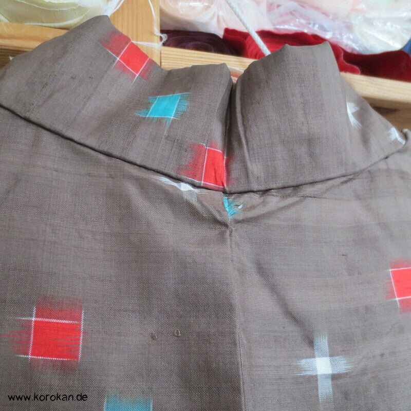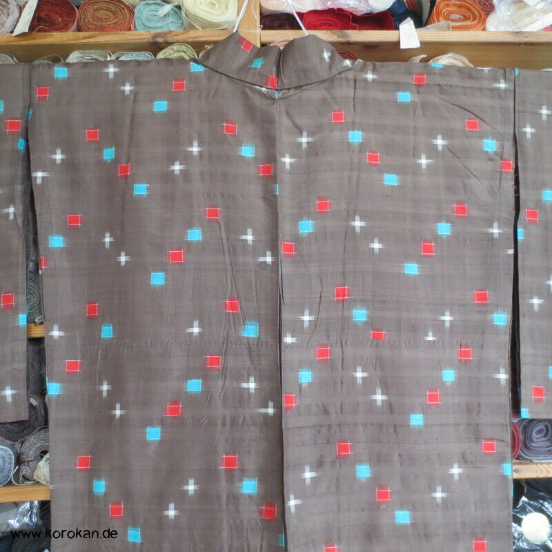 antiker handgewebter Meisen / Kasuro Seiden Komon Kimono mit hellen Punktkaros in rot und türkis in blassbraun, Teil und Sitzfutter in Baumwolle