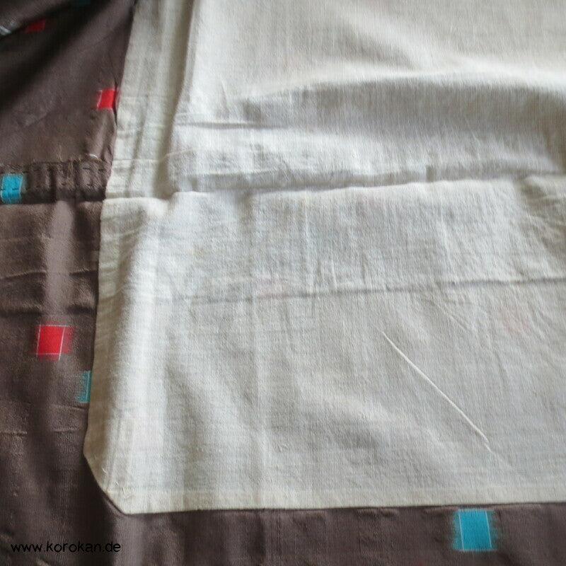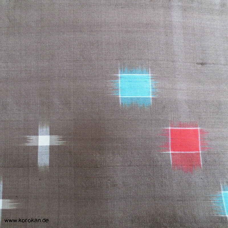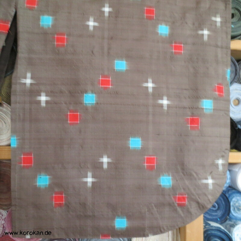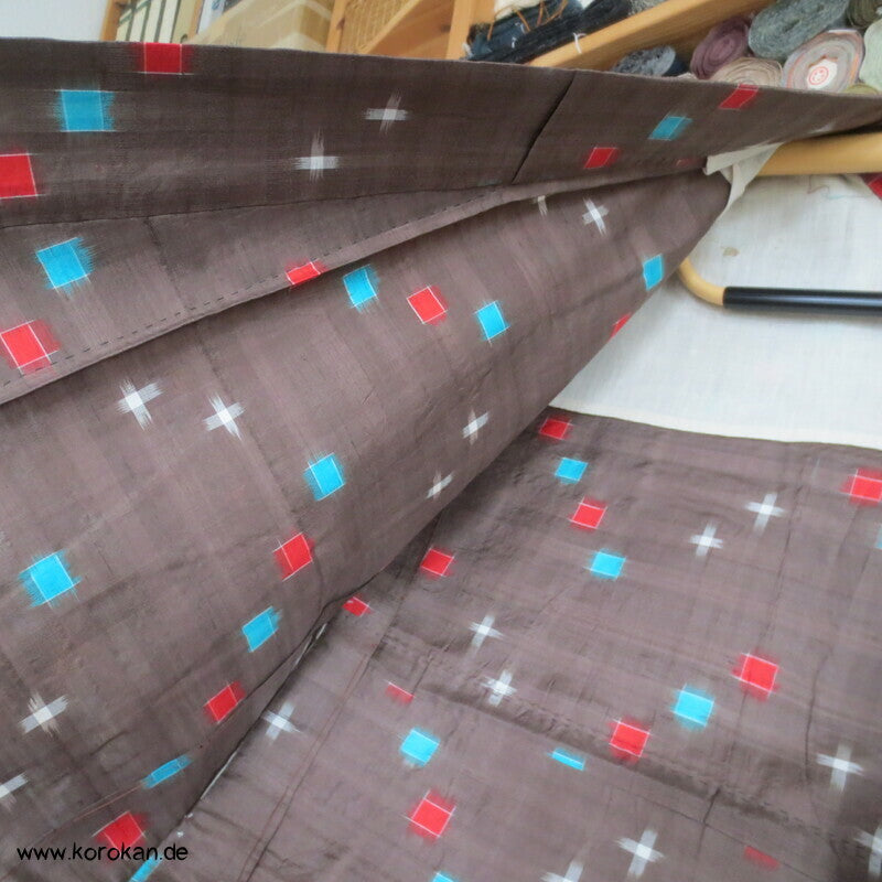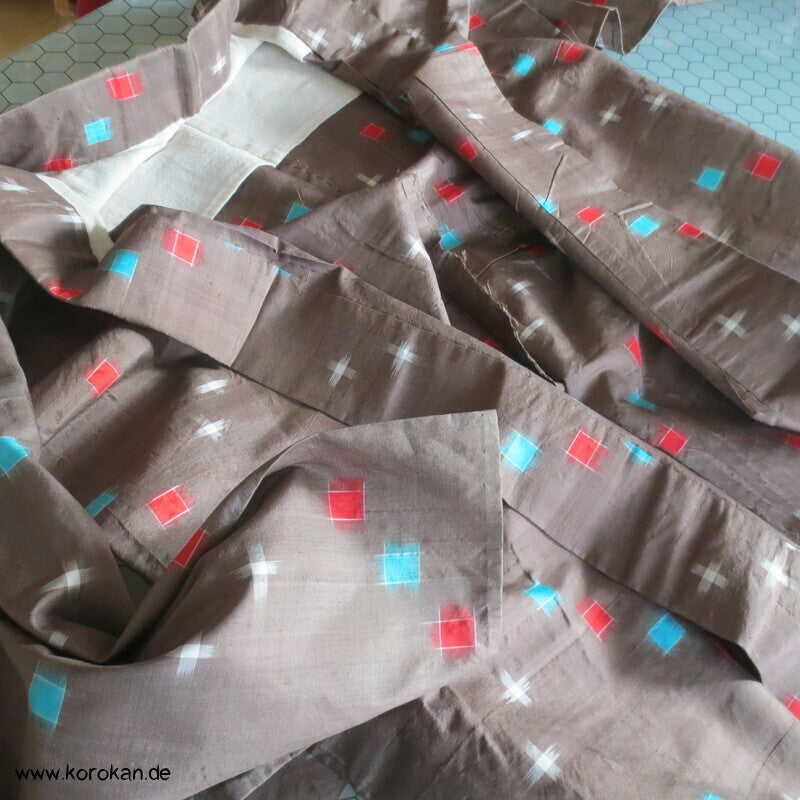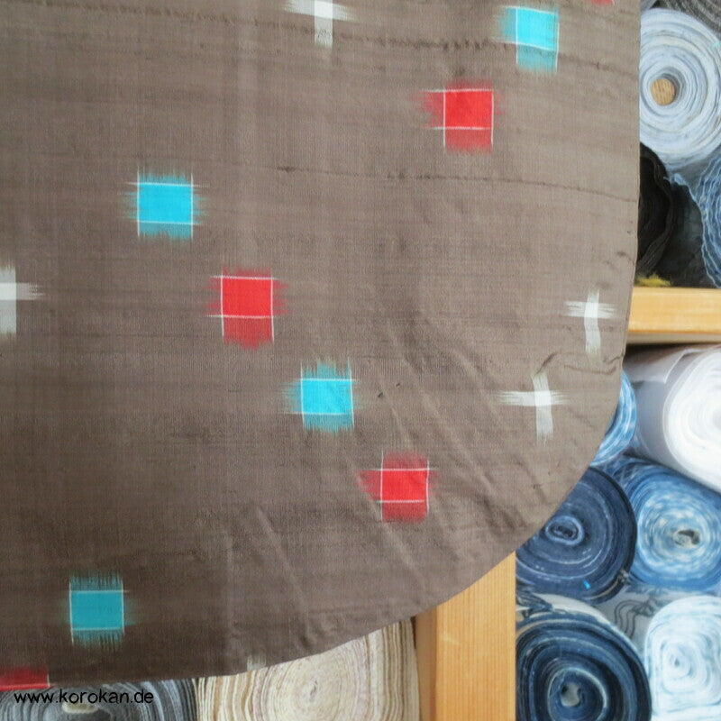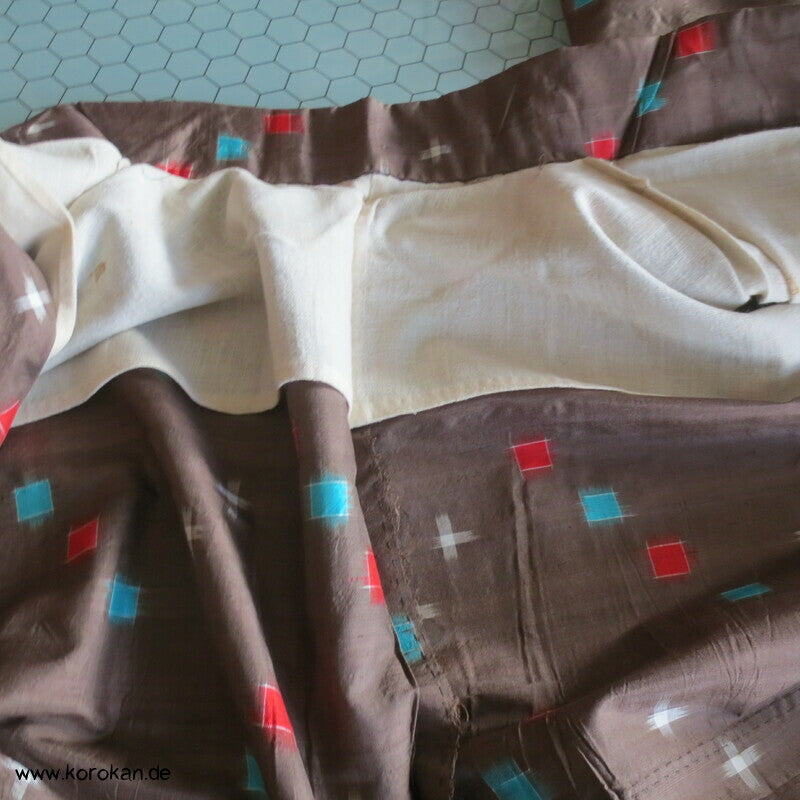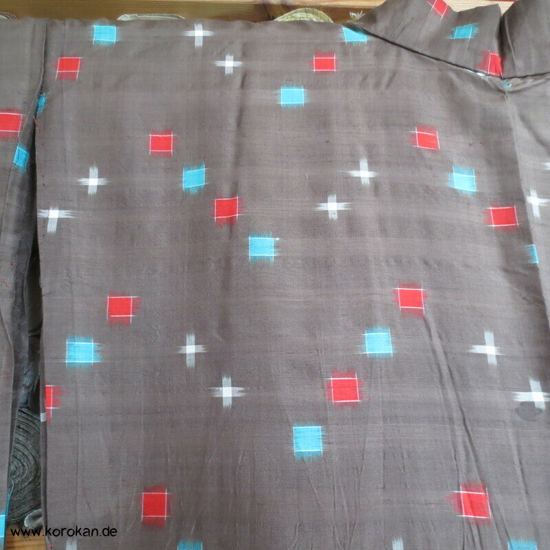 blassbraun mit roten und türkisen Rechtecken Kasuri Meisen Hitoe Kimono