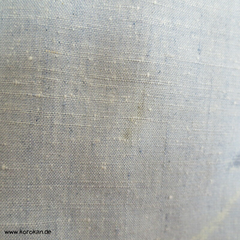 Vintage Tsumugi Seide Komon Kasuri Arabesekenmuster hellblau hellgrau, oberes Futter hell, unteres Hakkake Futter Seide mit Verlaufsrand