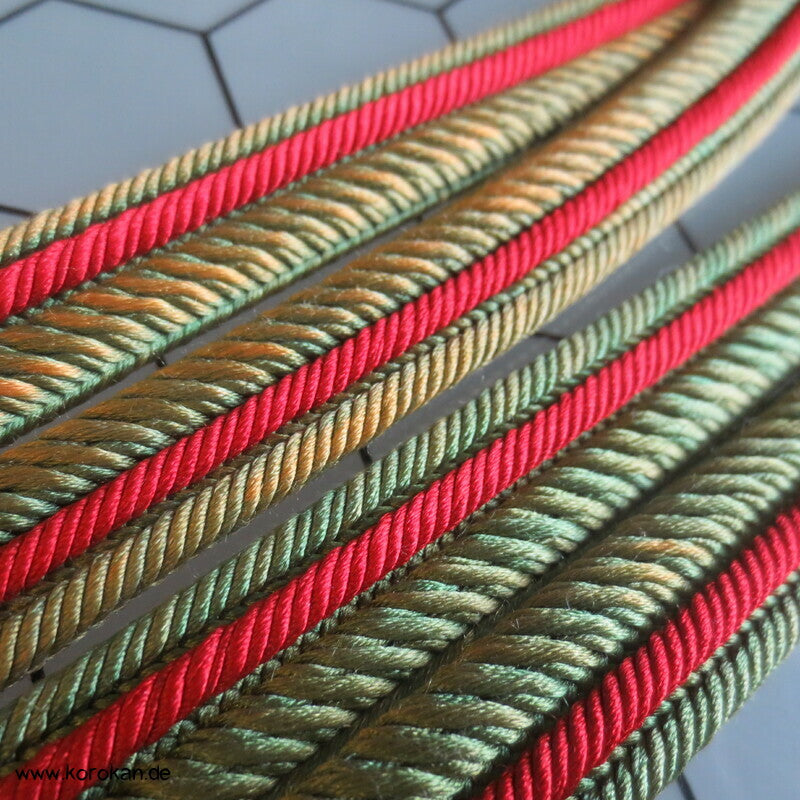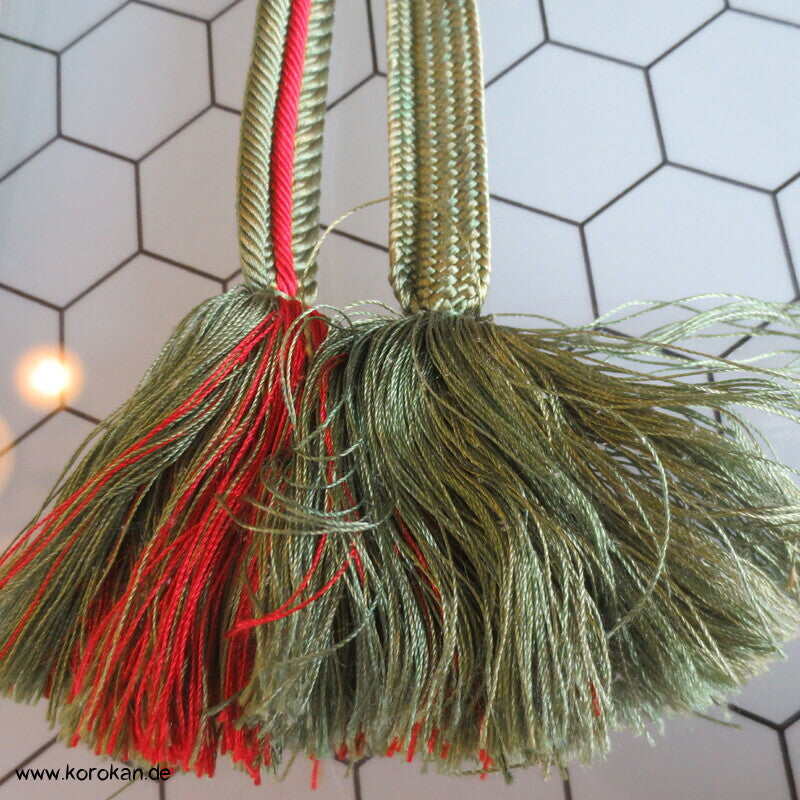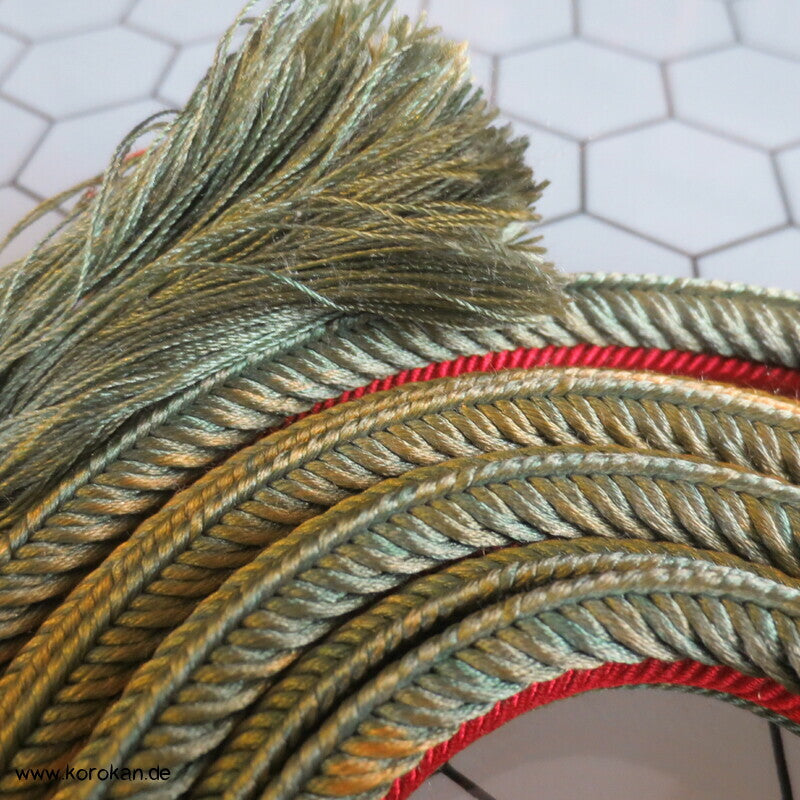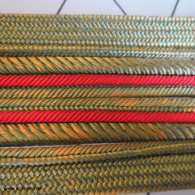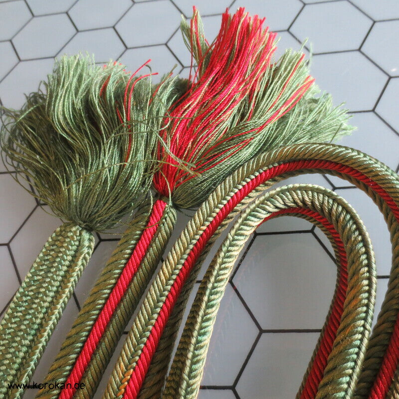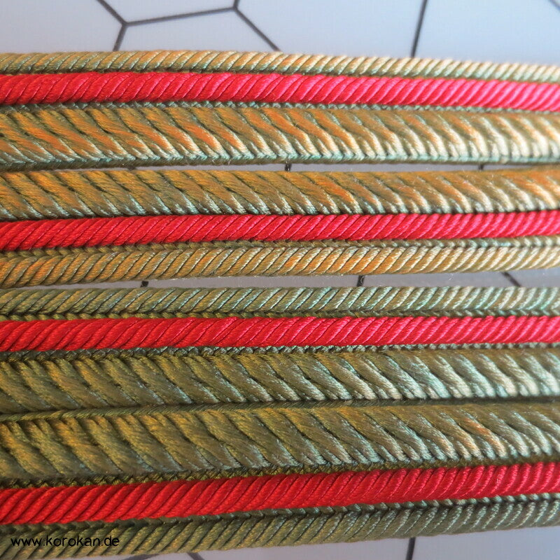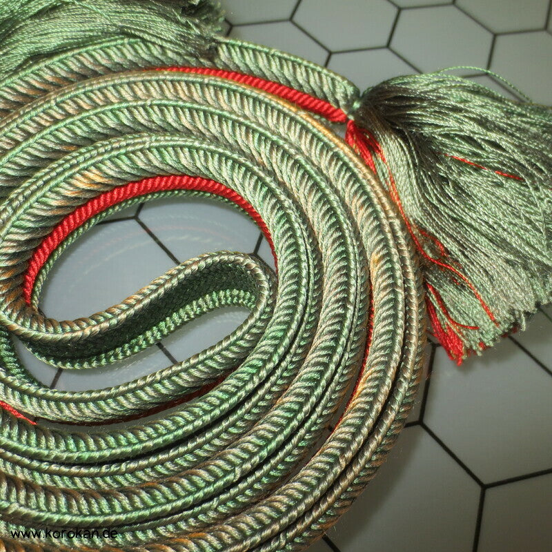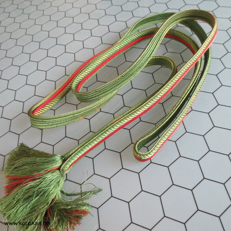 japanischer Flecht Seiden Obijime grün rote Streifen, das grün ist verschossen