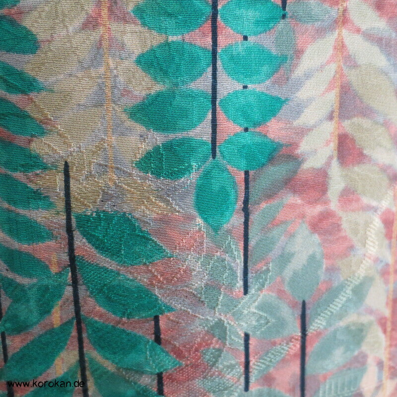 Vintage Komon Kimono Seidendamast mit eingewebten Blättern und Blüten und einem Blätterwald Druckmuster, oberem hellen Seiden Futter und unterem Hakkake Futter Seidencrepe mit einem mangofarbenen Bokashi Farbverlaufsrand