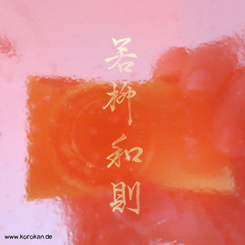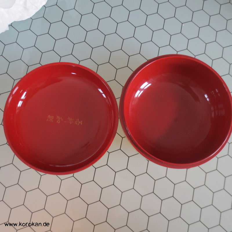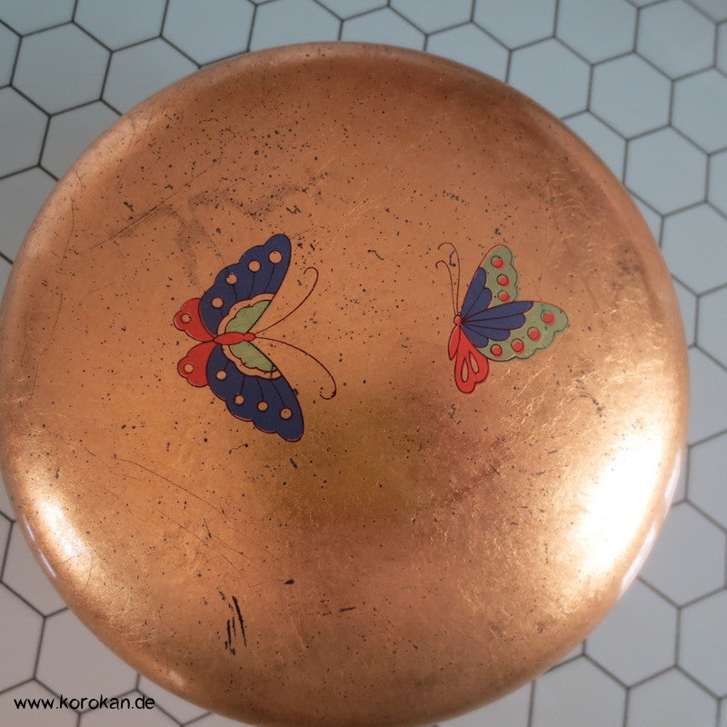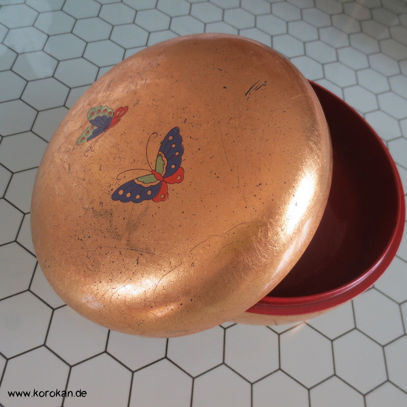 Vintage kleine Deckeldose aus Holz, rot lackiert mit Blattgoldauflage und Schmetterlingen - innen eine japanische Widmung.... oder sowas