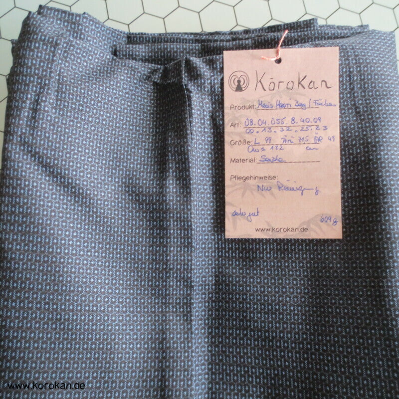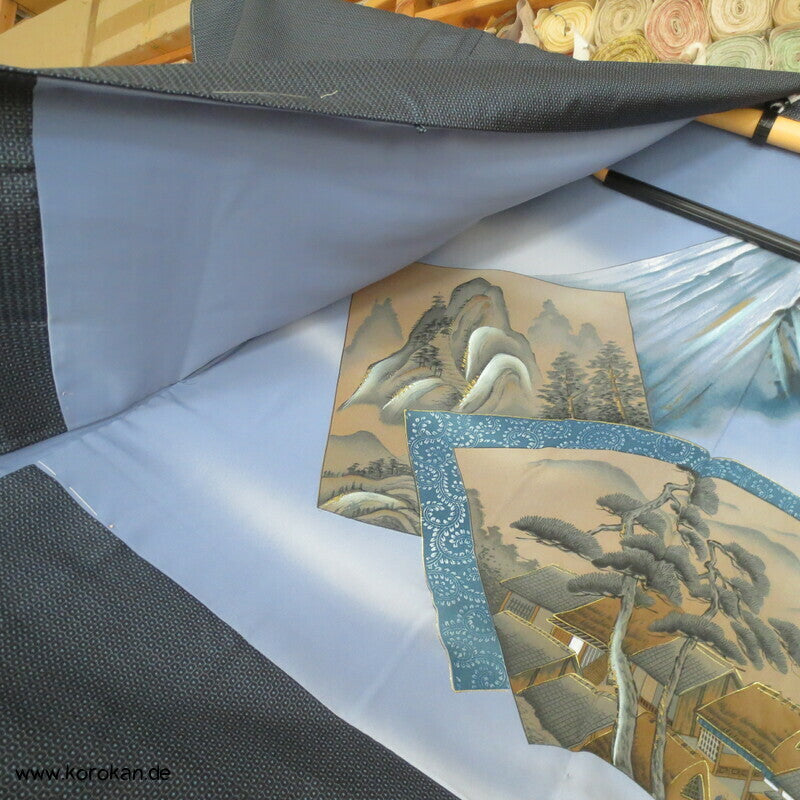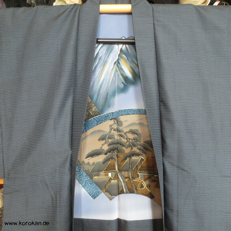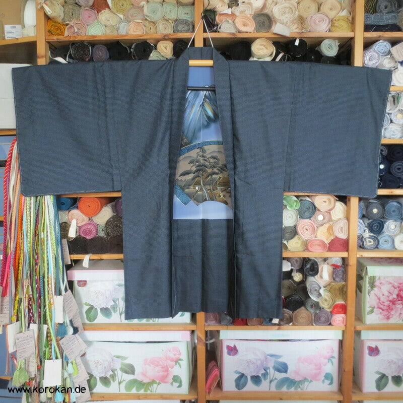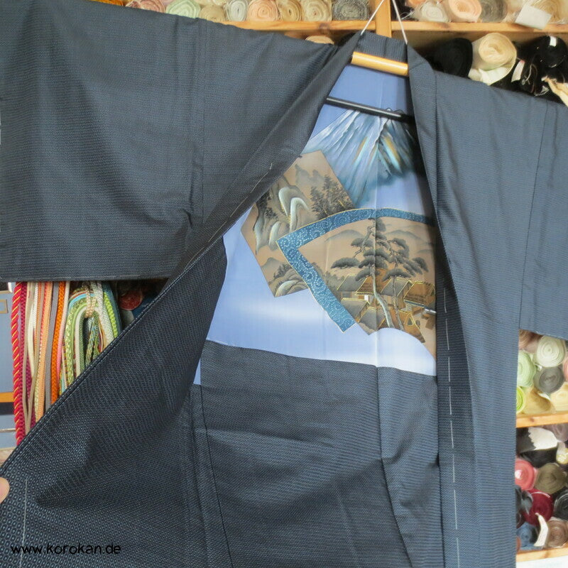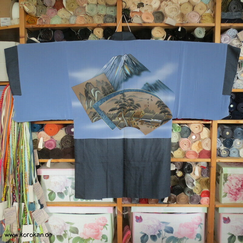 Vintage japanische Männer Haori aus blau - schwarzer feiner Kasuri garngefärbter Kikko Tsumugi Seide mit Seidenfutter Fächer mit Motiven vor Berg