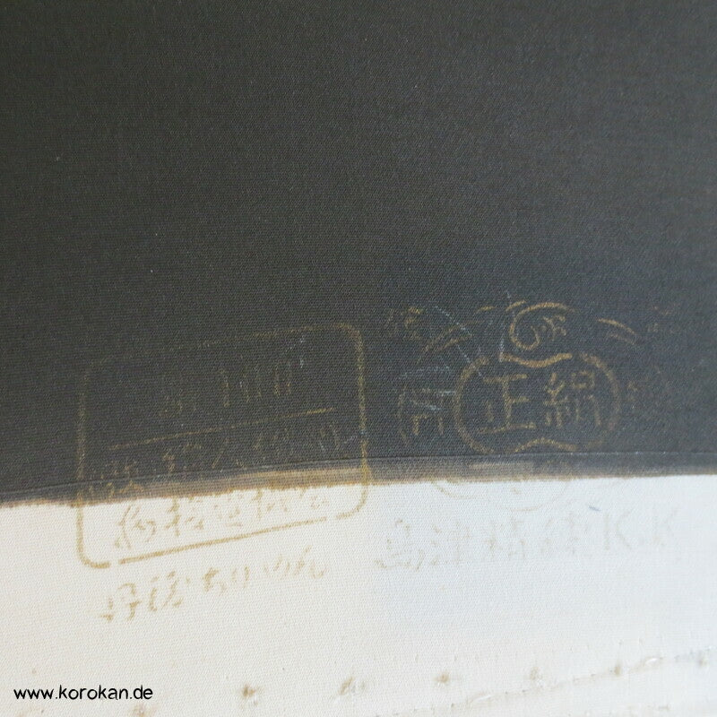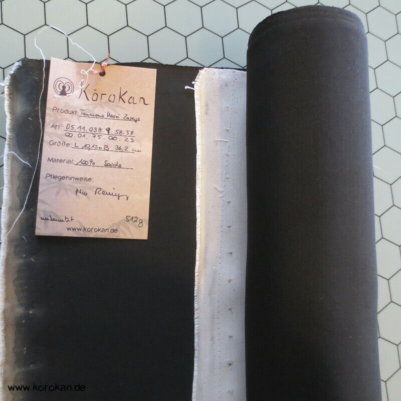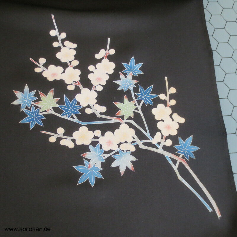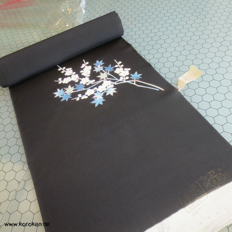 Vintage unbenutzte Tanmono Stoffrolle schwarzer Seidencrepe für Kimono Haori Jacke mit Blütenzweigen bemalt