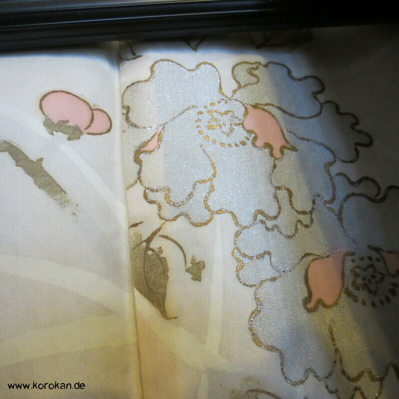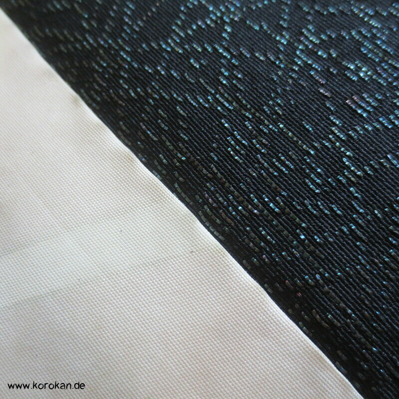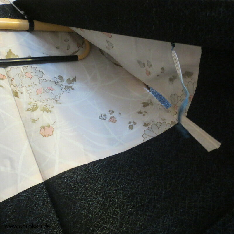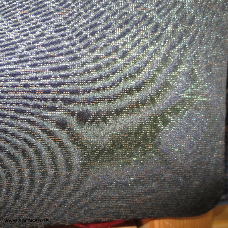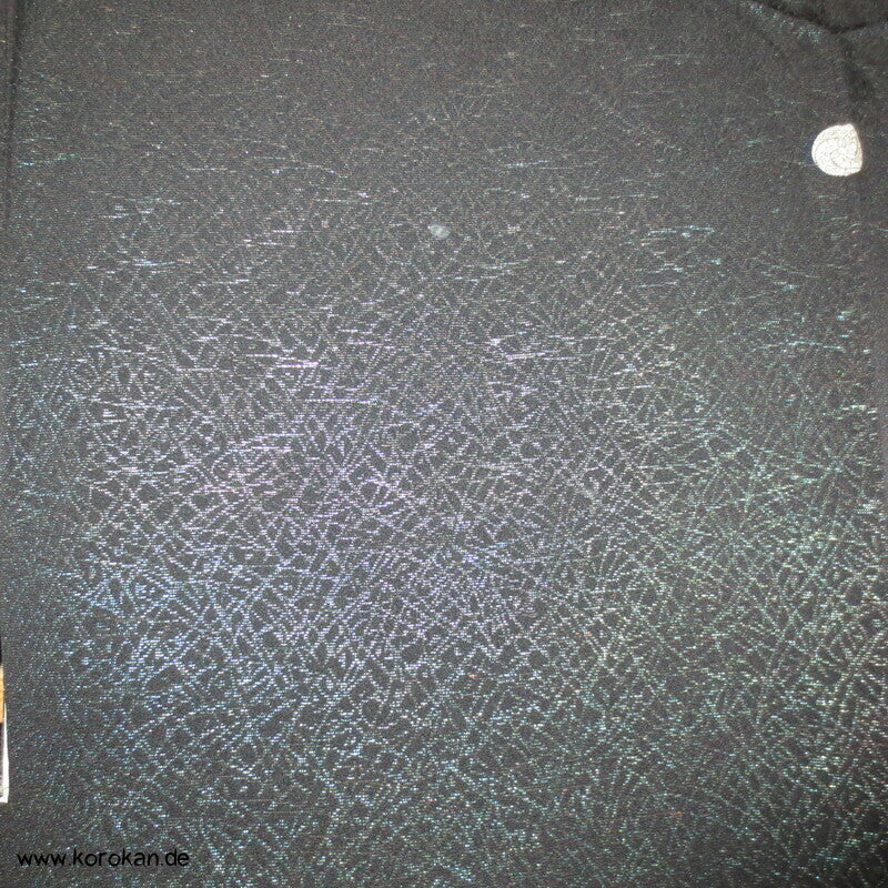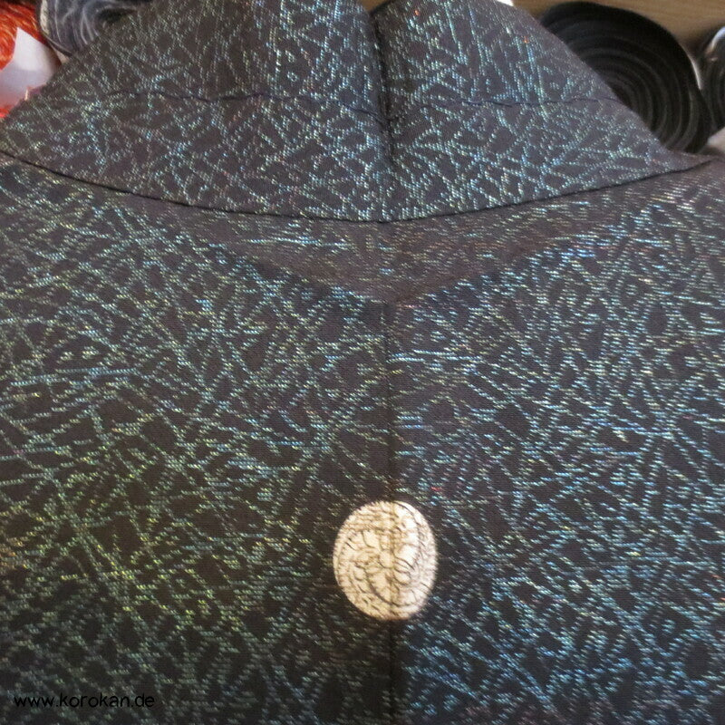 Vintage Haori Kimono Jacke aus feiner, schwarzer japanischer Crepe Seidenbrokat mit eingewebten gold, silber und urushi Fäden mit einem Mon auf dem Rücken und einem hellen oberen Damast Seidenfutter und blaugrauen Haori Himo Bindebändern.