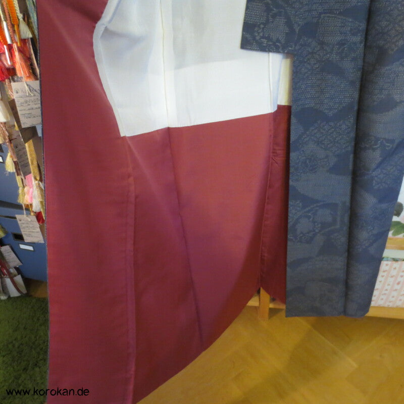 japanischer Vintage Tsumugi Seide Komon Kasuri hellgraue Fächer und Muster in indigo, oberes Futter helle Seide, unteres Hakkake Futter Seide himbeersorbet