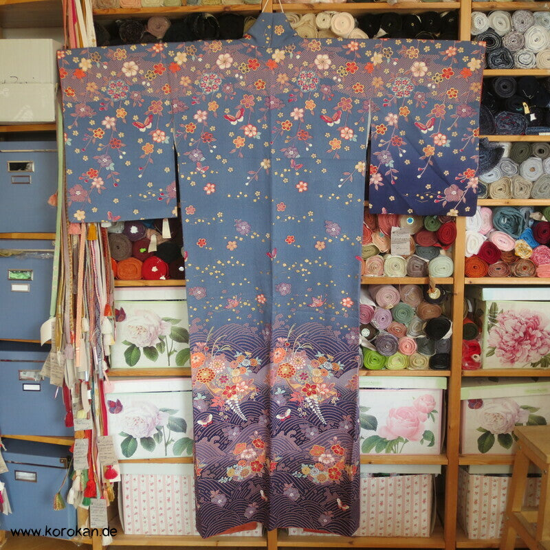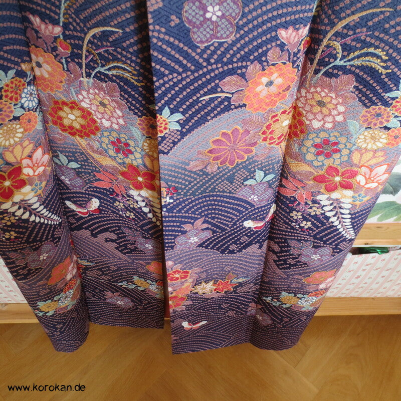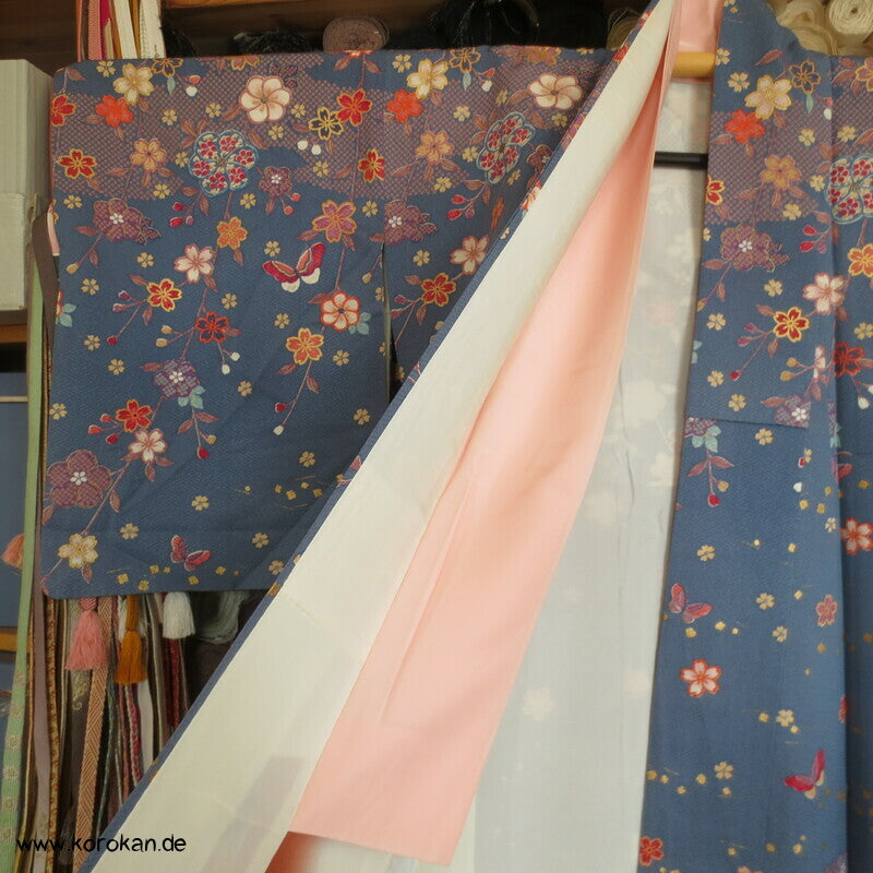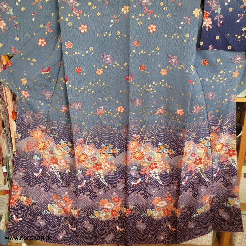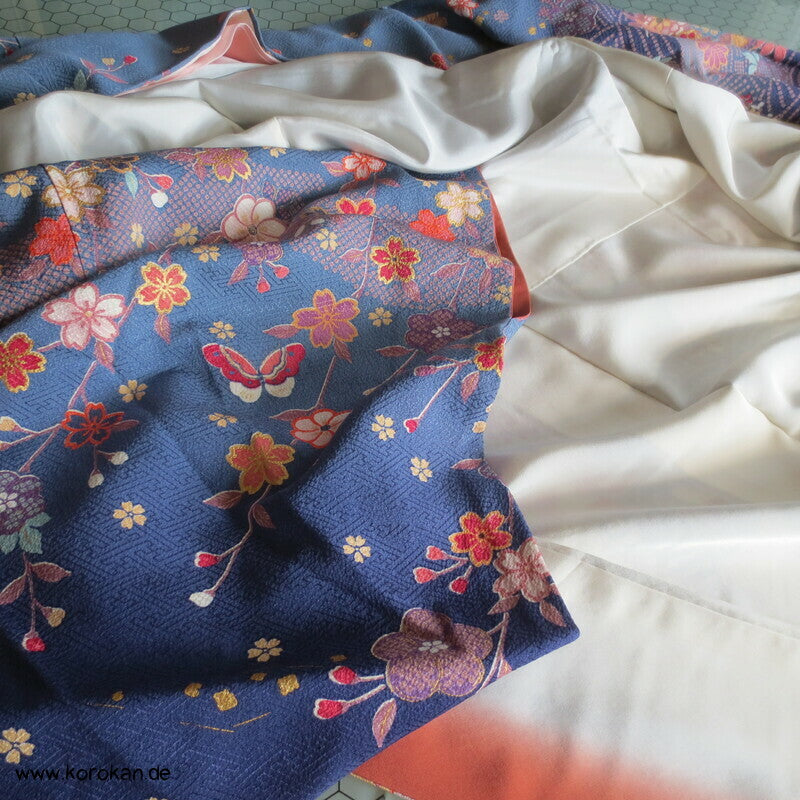 japanischer Vintage Homongi Kimono indigoblauer Sayagata Seidendamast, fallende und aufsteigende Blüten etwas Bingata-artig, mit Schmetterlingen, feinem oberen hellen Seidenfutter und unterem Hakkake Seidenfutter mit Farbverlaufsrand
