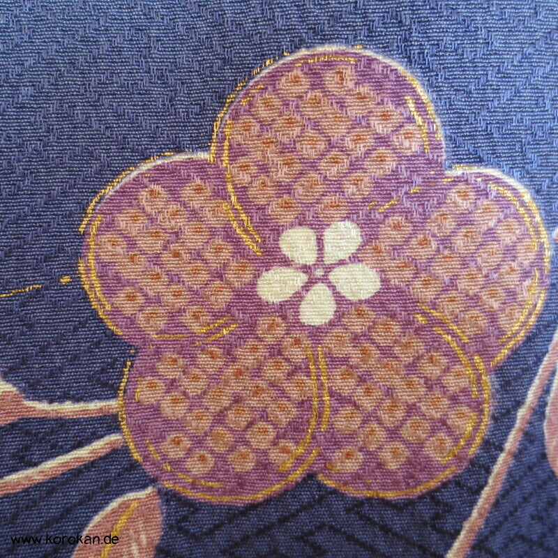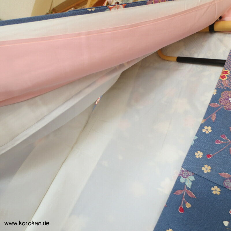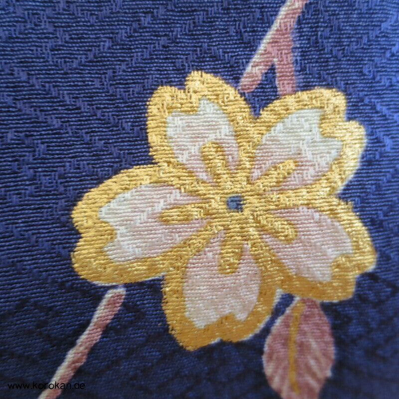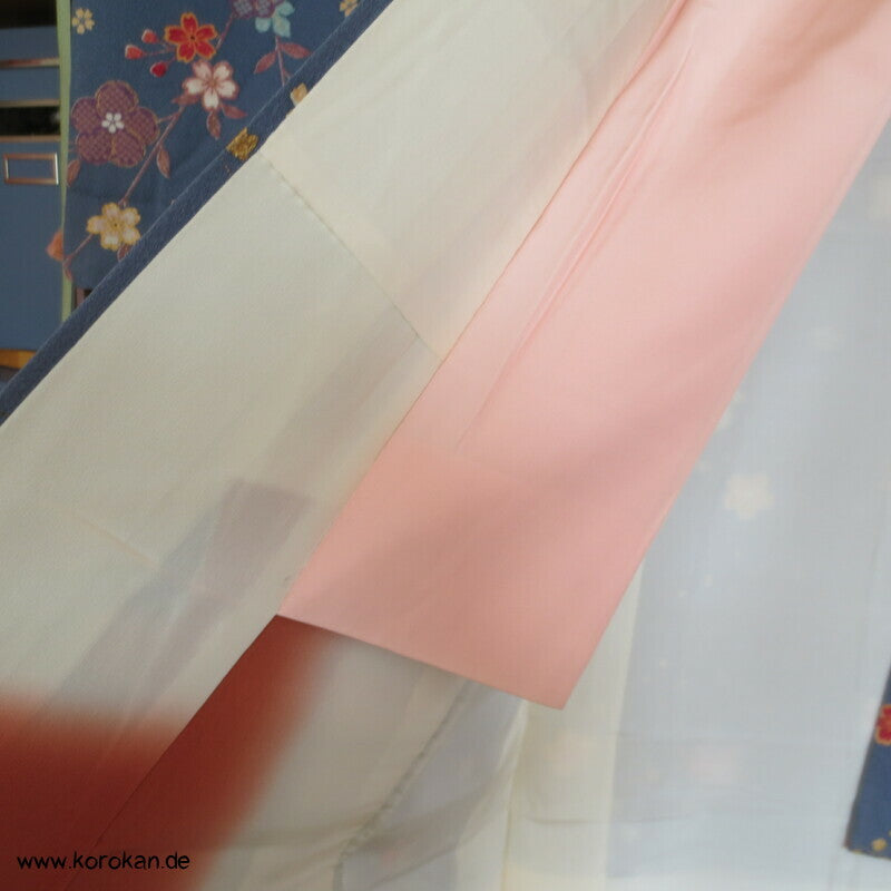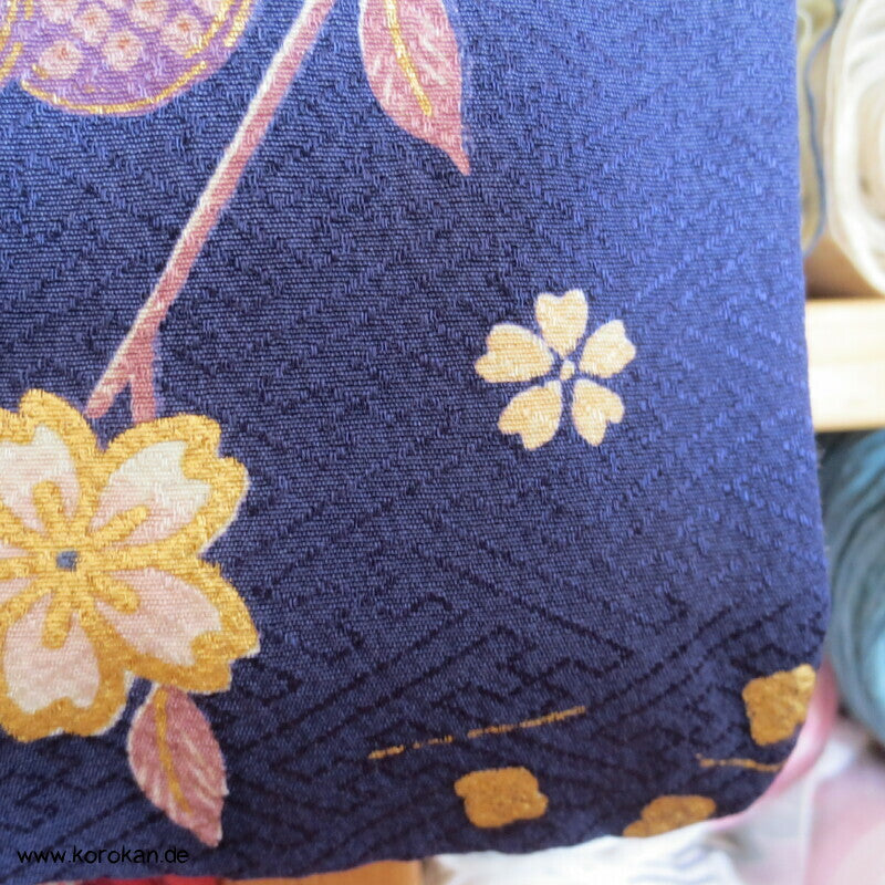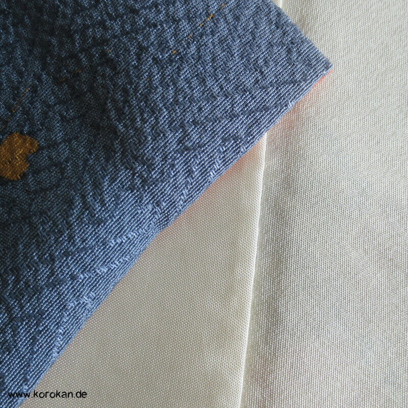 japanischer Vintage Homongi Kimono indigoblauer Sayagata Seidendamast, fallende und aufsteigende Blüten etwas Bingata-artig, mit Schmetterlingen, feinem oberen hellen Seidenfutter und unterem Hakkake Seidenfutter mit Farbverlaufsrand