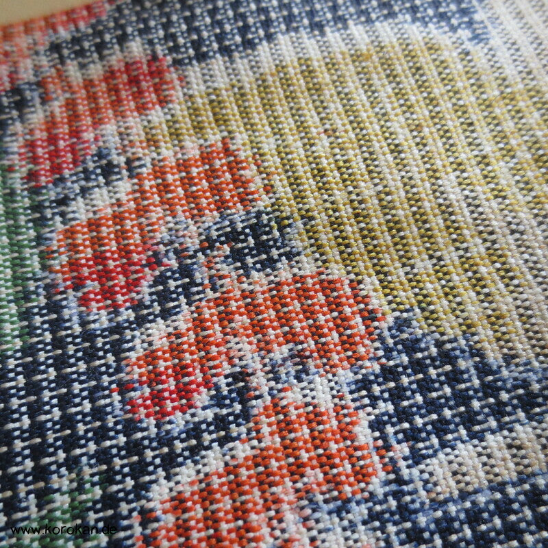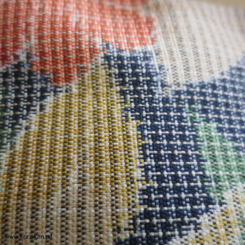 Vintage Tsumugi Seiden Komon Kimono mit Kasuri garngefärbtem Blumenmuster allover, oberes Futter helle nachgedunkelte Seide, unteres Hakkake Futter Seidencrepe mit Verlaufsrand.