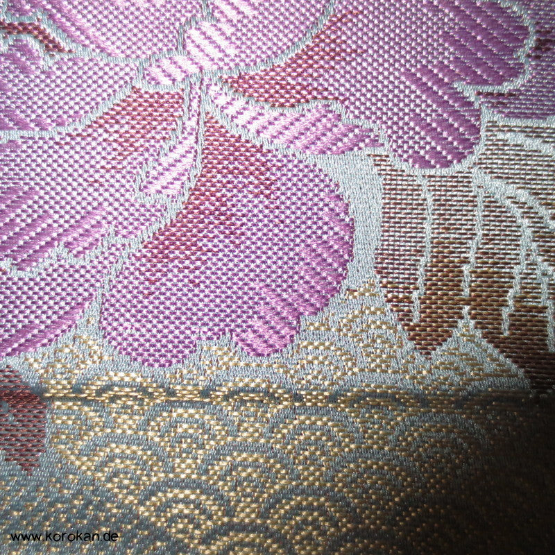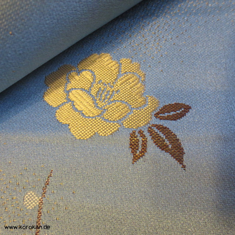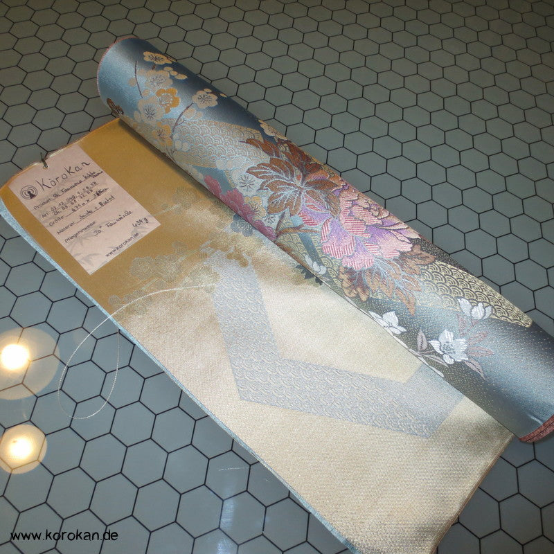 Vintage unbenutzter Kunstseiden Damast Kimono Stoff mit feinsten sich überlappenden Mustern Blumen über Kikko auf blaugrau glänzendem Grund