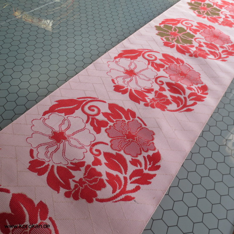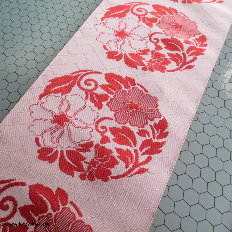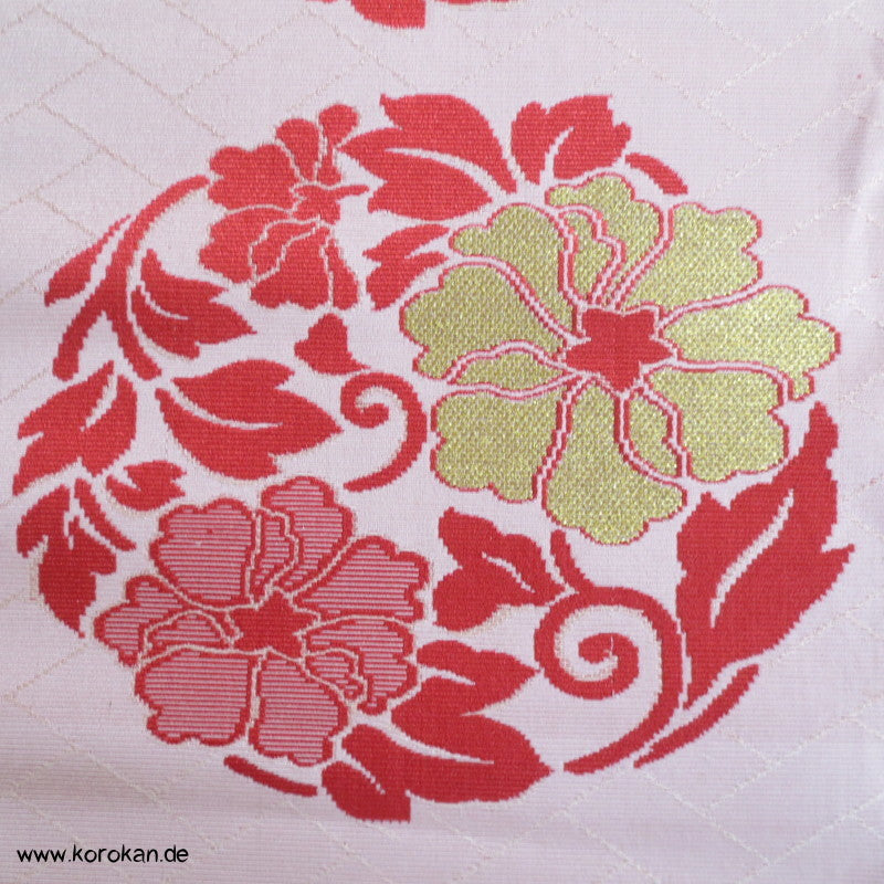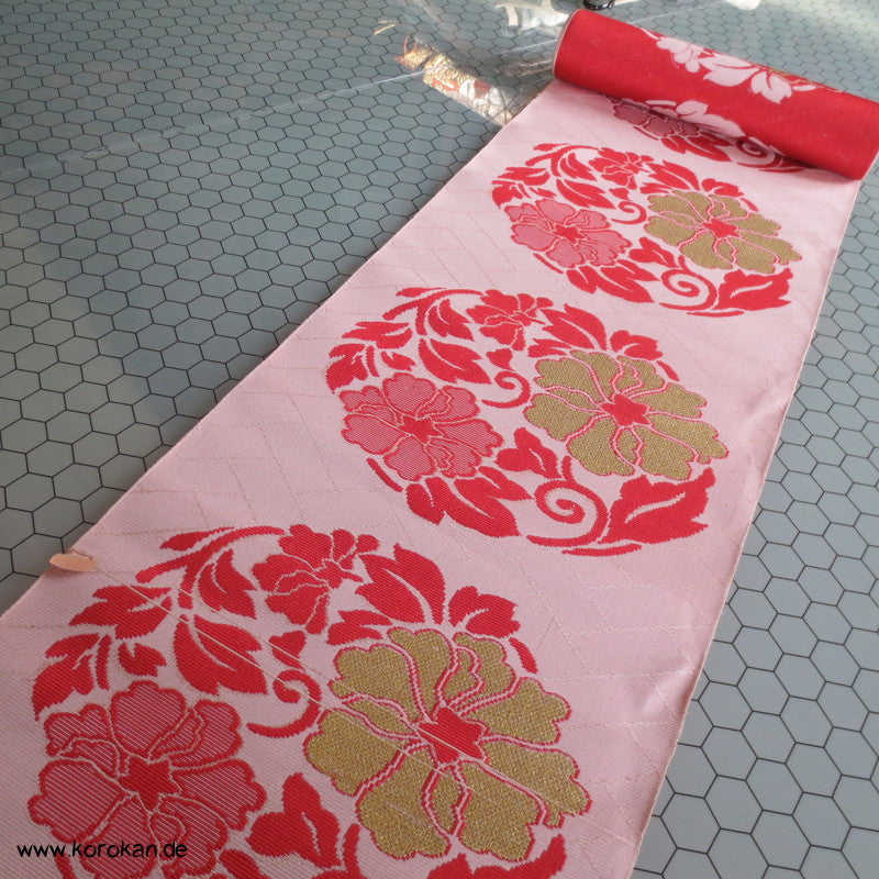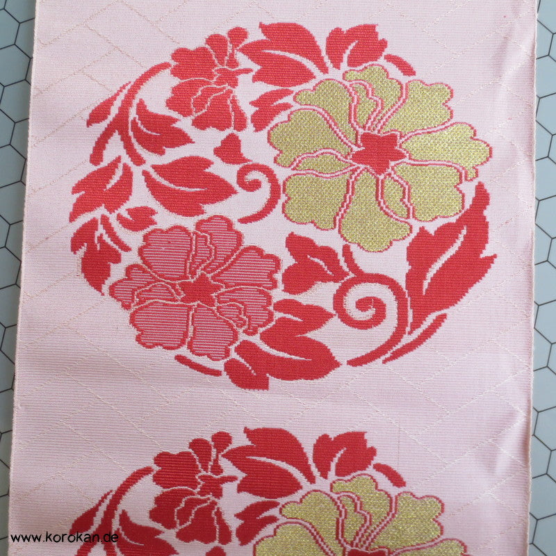 Hassun Obi Tanmono Stoffrolle mit Blumenrondellen gold rot aus blassrosa