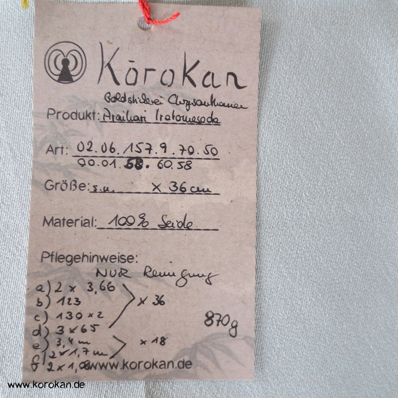 Vintage Araihari Homongi Kimono, feine Crepeseide hellgrau Blumenmuster mit ganz viel gold und Stickerei
