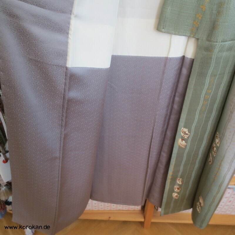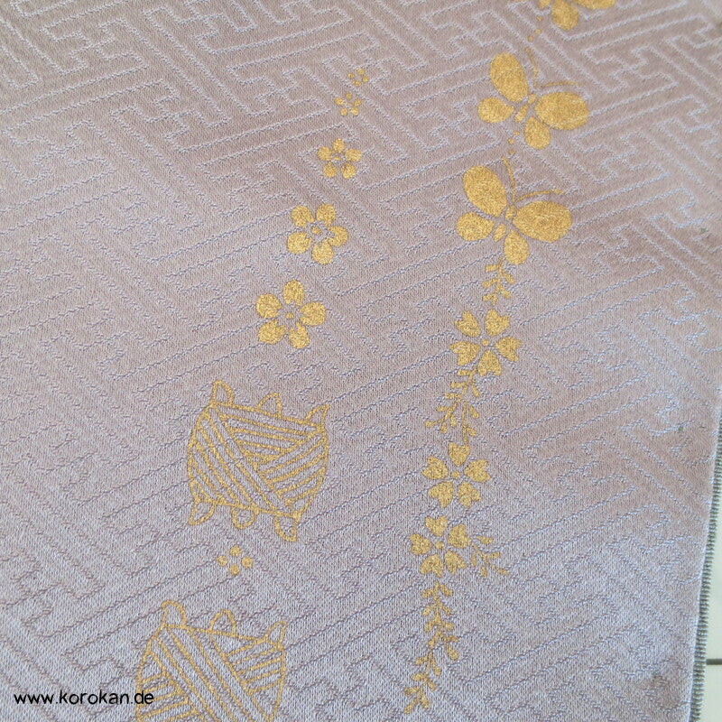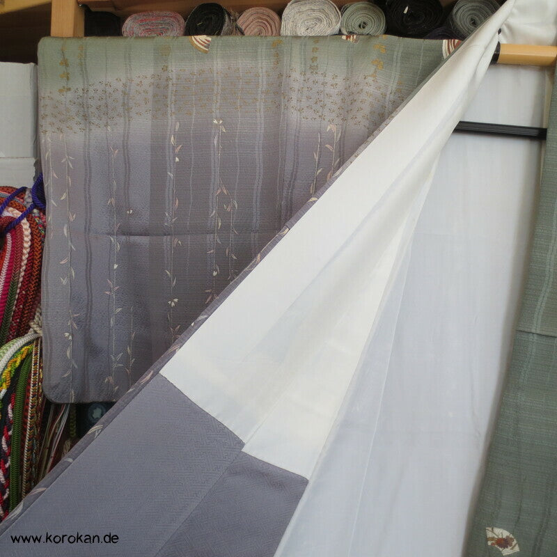 Vintage Homongi Kimono riesiger Farbverlaufsschwung auf differenziertem Seidendamast mit goldenen Schmetterlingen, Garnspulen, Fächermotiven etc... sehr feminin, feinem oberen hellen Seidenfutter und unterem Hakkake grauem Seidendamast mit Sayagata.