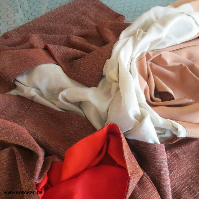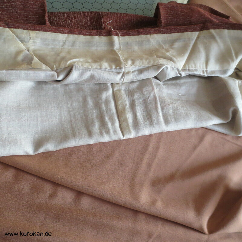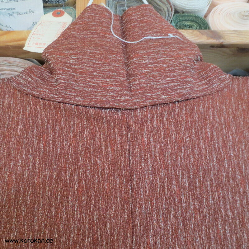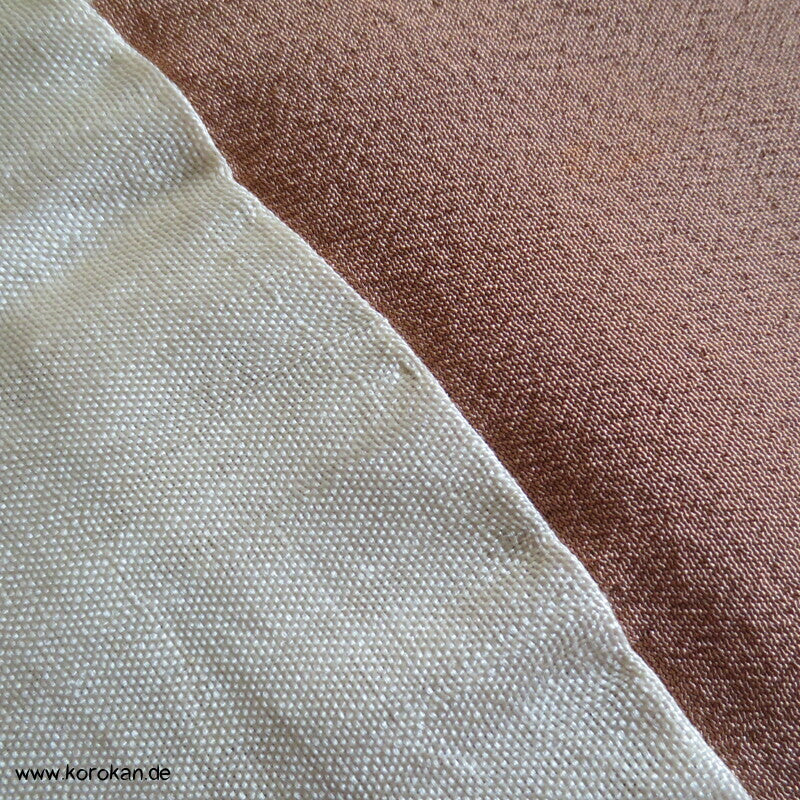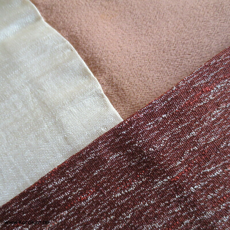 Feiner weicher Borkenkrepp mit zimtrotbrauner Färbung, weißen Oberflächen, hellem oberem antiken handgewebten Seidenfutter, rotem Seiden Ärmelfutter und unterem Hakkake in einem Milchkaffeebraun.