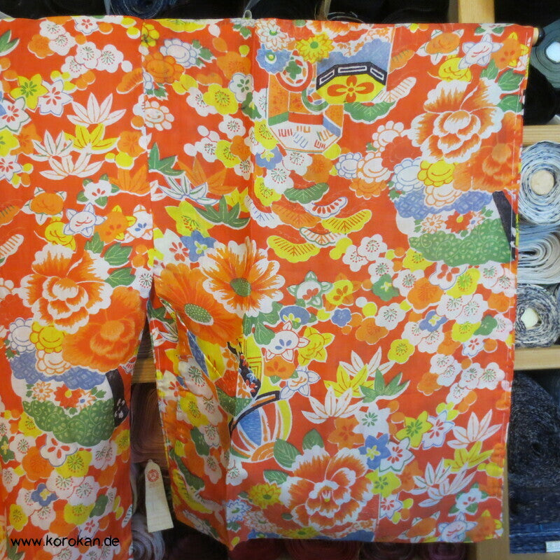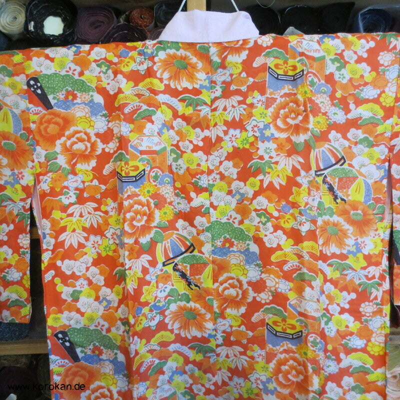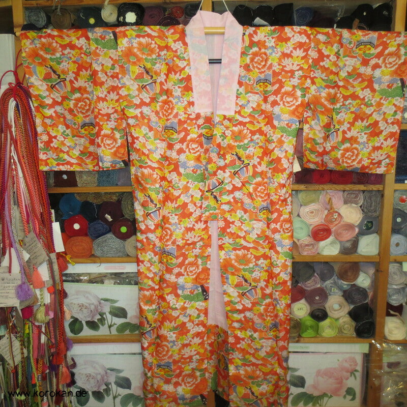 Vintage, eher antiker Juban Unter Kimono Seidentaft mit buntem Blütendruck, hellem Kragen, oberen Teilfutter rosa Baumwolle