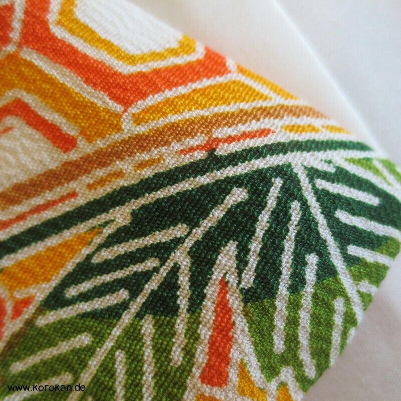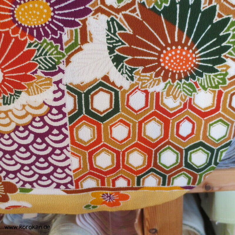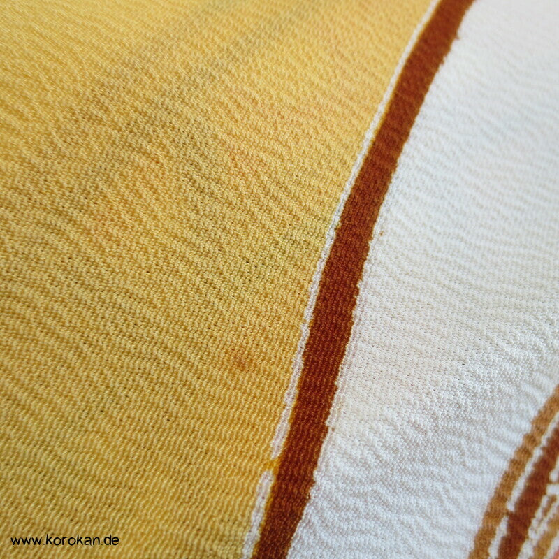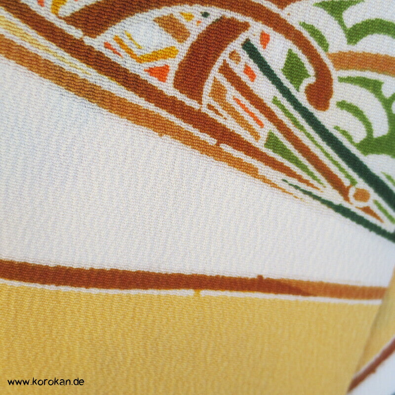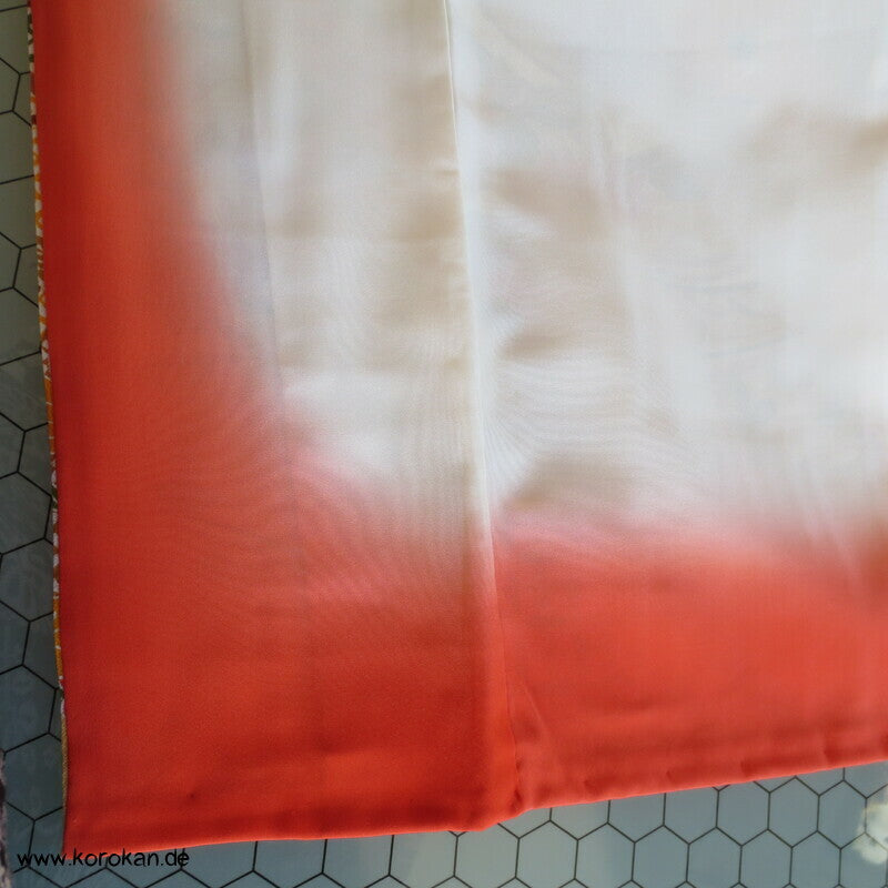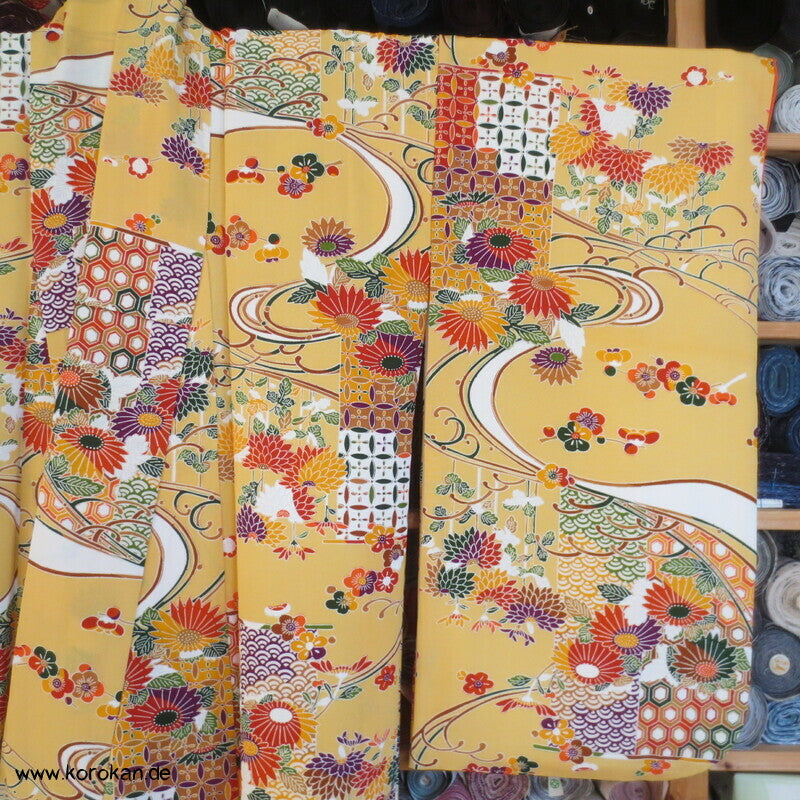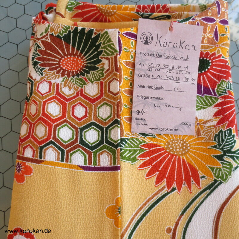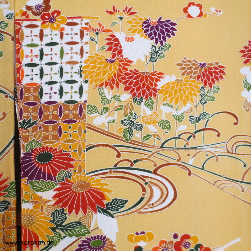 Vintage Chu Furisode / Komon Kimono feiner Seidencrepe mit einem quietschbunten Druck auf sonnengelb, oberes Futter helle Seide, unteres Futter mit Bokashi Verlaufsrand