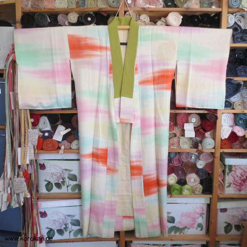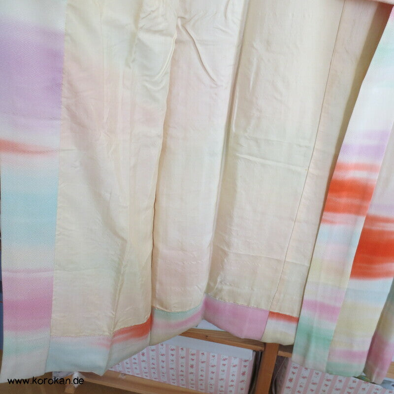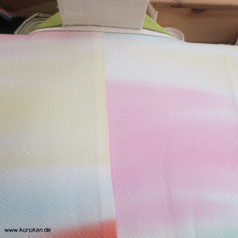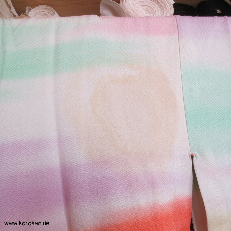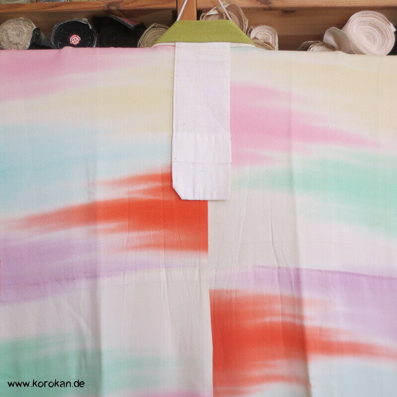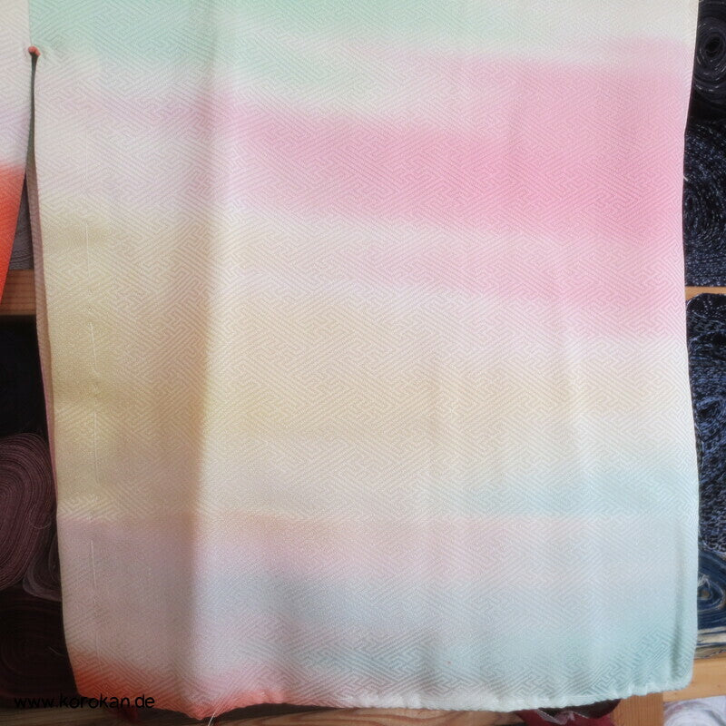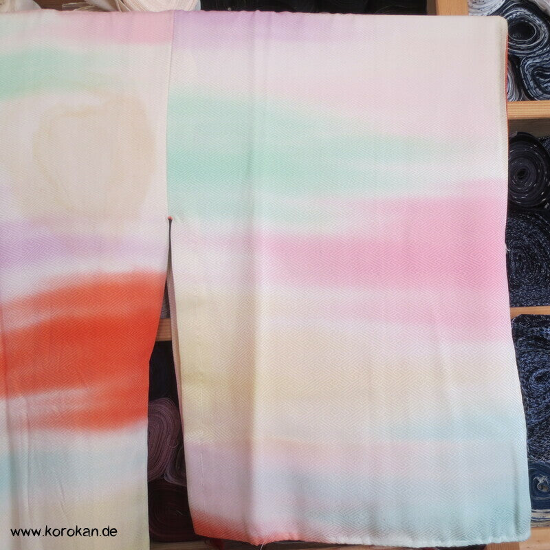 japanischer Vintage, eher antiker Juban Unter Kimono Blüten Seidendamast mit Bokashi Verlaufsfarben bunte Nebelschwaden, Han Eri khaki Seiden Chirimen Crepe