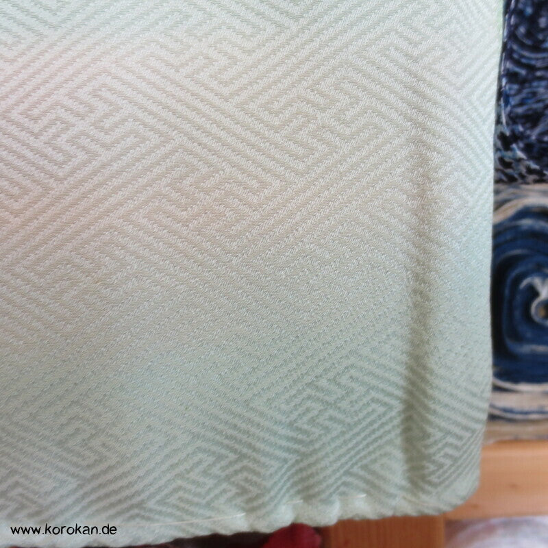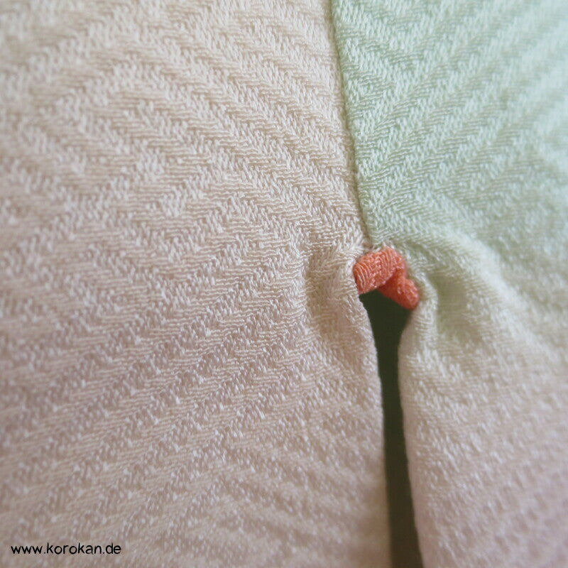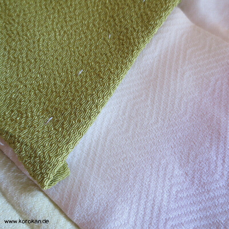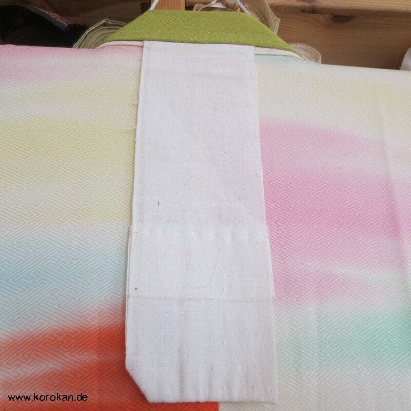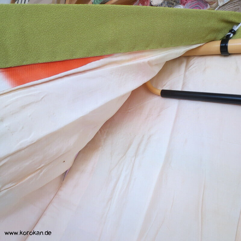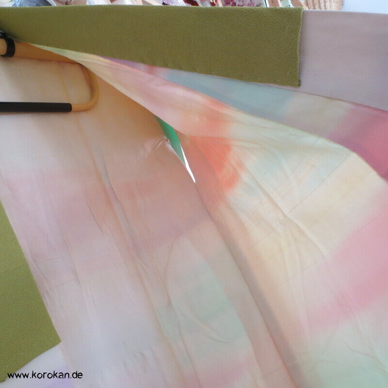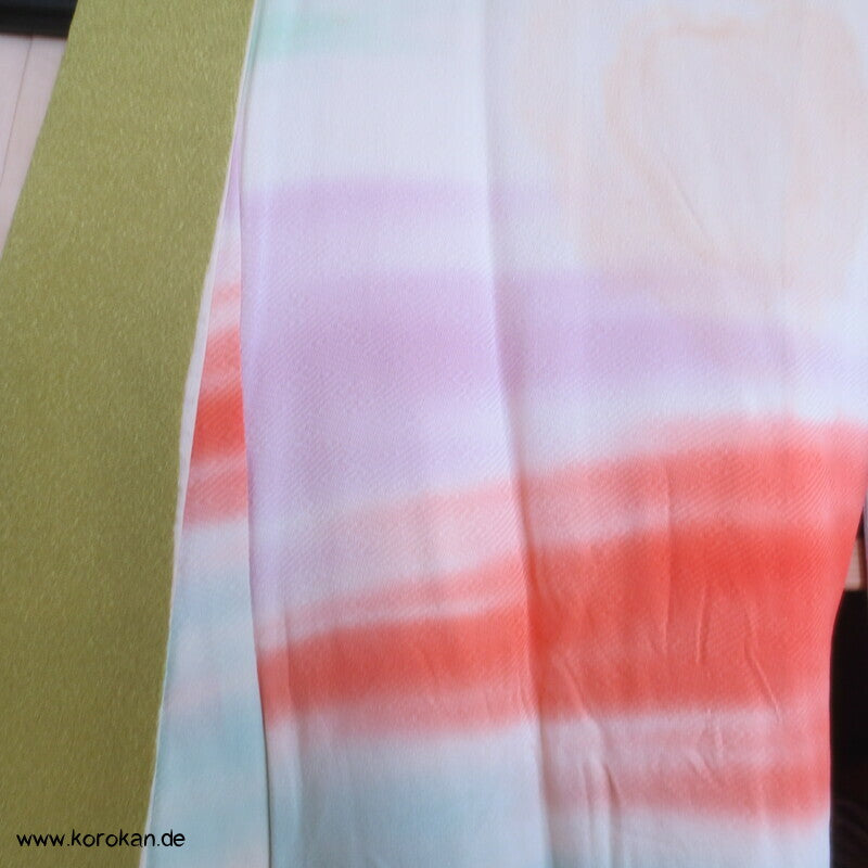 japanischer Vintage, eher antiker Juban Unter Kimono Blüten Seidendamast mit Bokashi Verlaufsfarben bunte Nebelschwaden, Han Eri khaki Seiden Chirimen Crepe