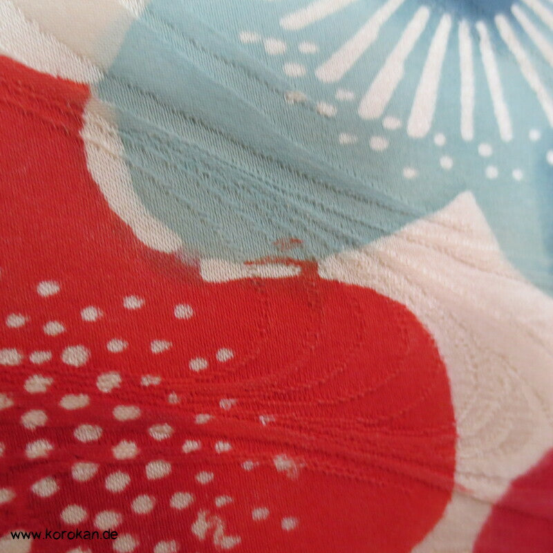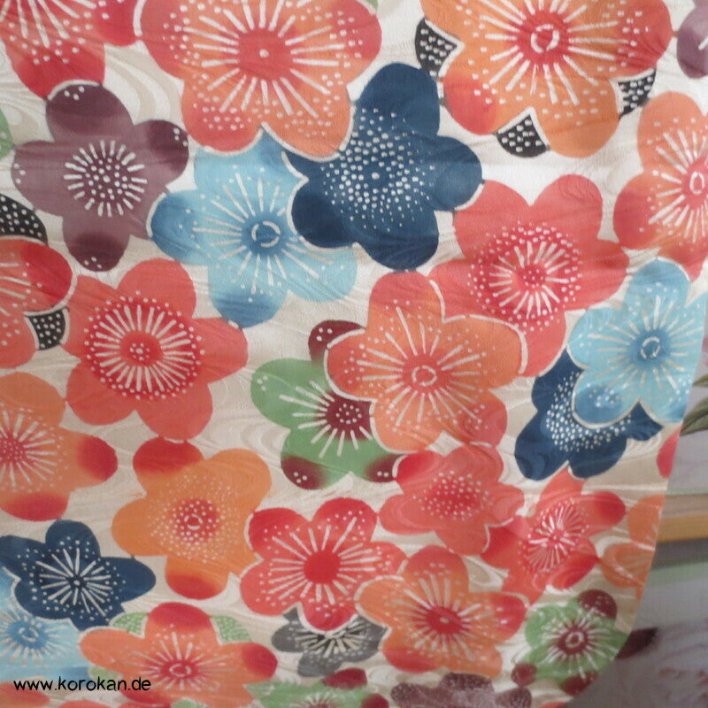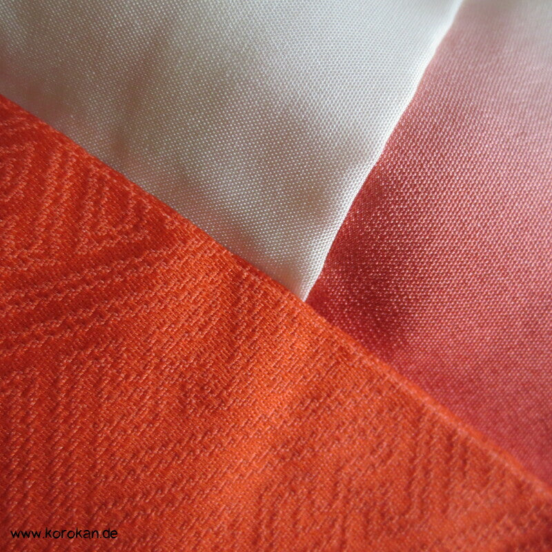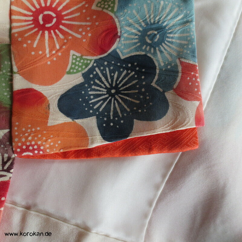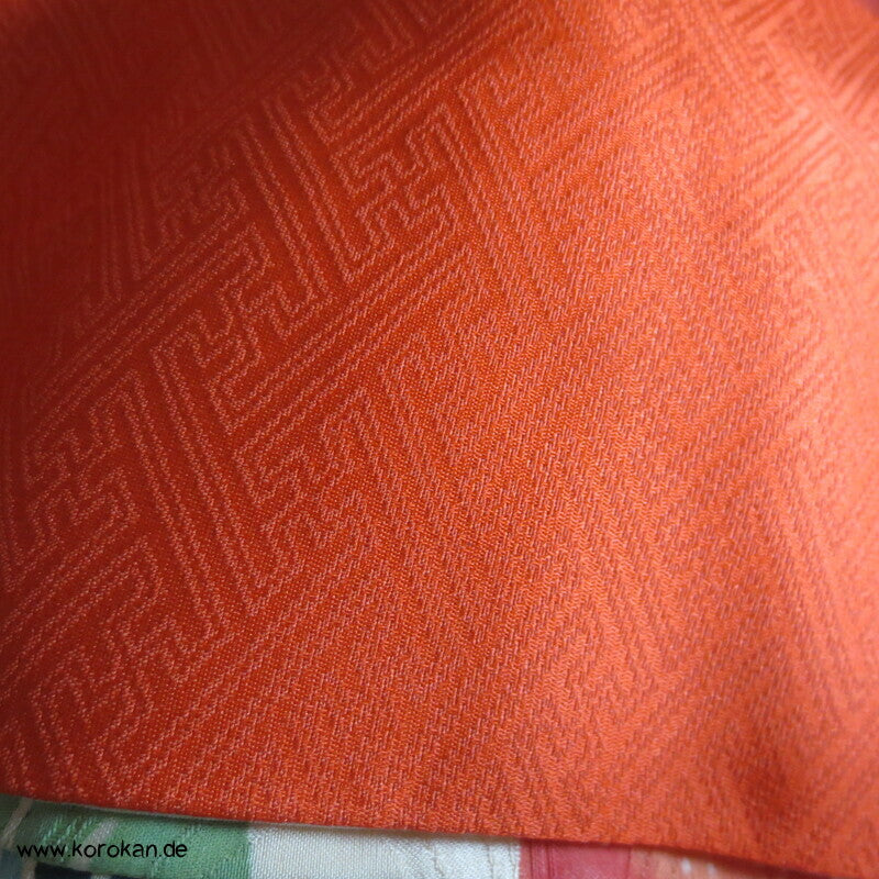 Seidendamast gewebtes welliges Muster, glänzend wildbunt bedruckt, oberes Futter helle Seide, unteres Hakkake Seidenfutter mit Bokashi Farbverlaufsrand in rot und Han Eri in orange Sayagata Seidendamast.