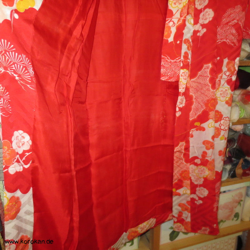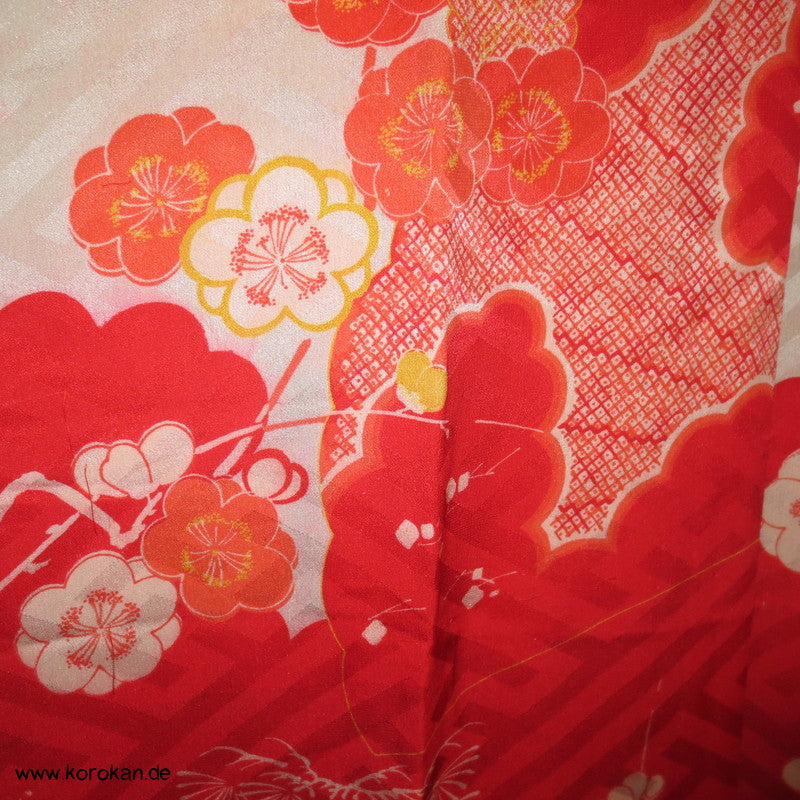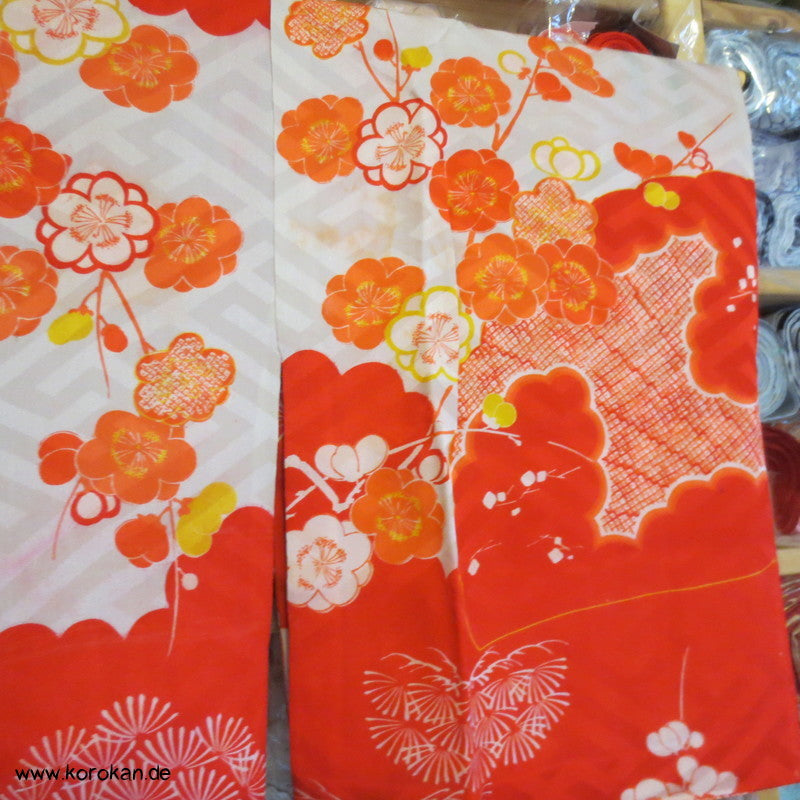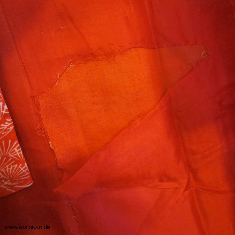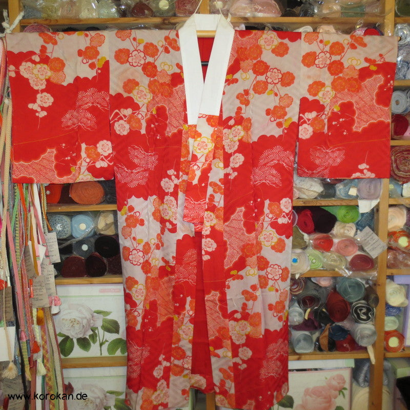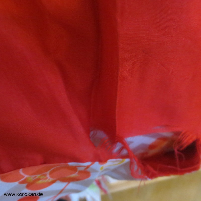 Vintage, eher antiker japanischer Juban Unter Kimono Sayagata Seidendamast rot weiß rosa mandarine Blumen und Wolken, hellem Baumwoll Kragen, rotes Seidenfutter
