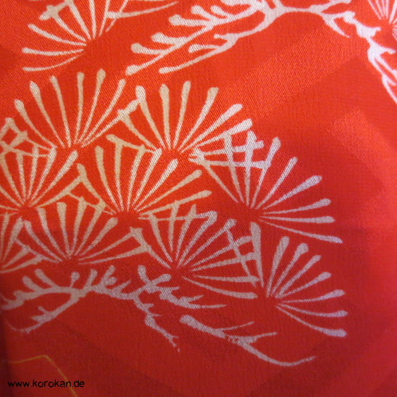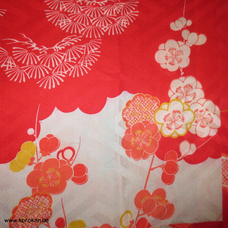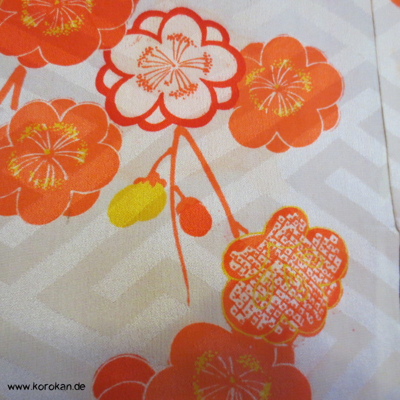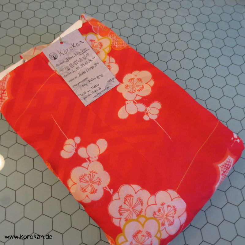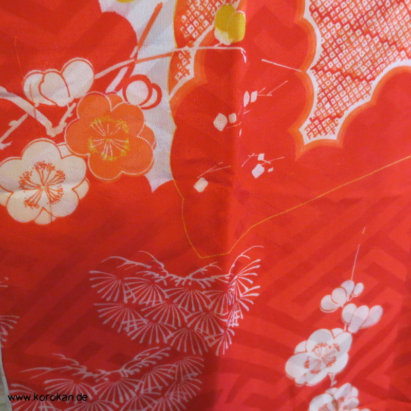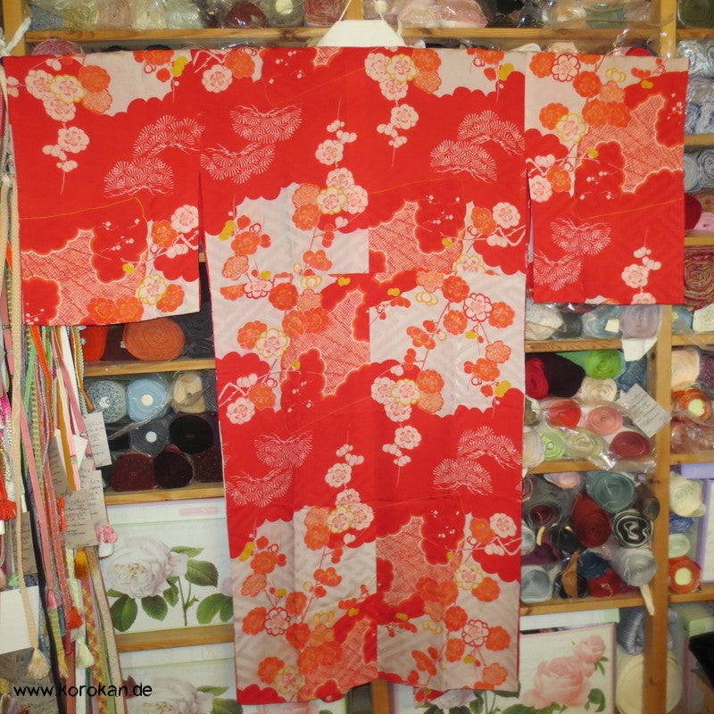 Vintage, eher antiker japanischer Juban Unter Kimono Sayagata Seidendamast rot weiß rosa mandarine Blumen und Wolken, hellem Baumwoll Kragen, rotes Seidenfutter