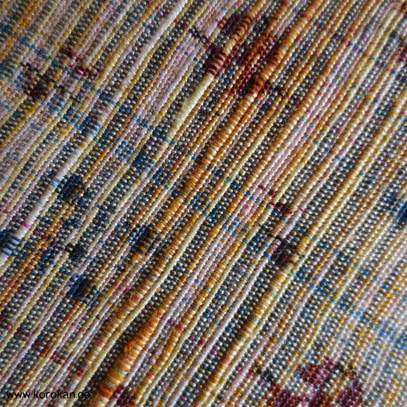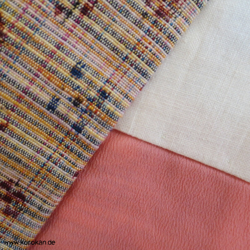Vintage Tsumugi Seide Komon Kasuri kariert bunt auf natur, oberes Futter helle Seide, unteres Hakkake Futter rosa Seide