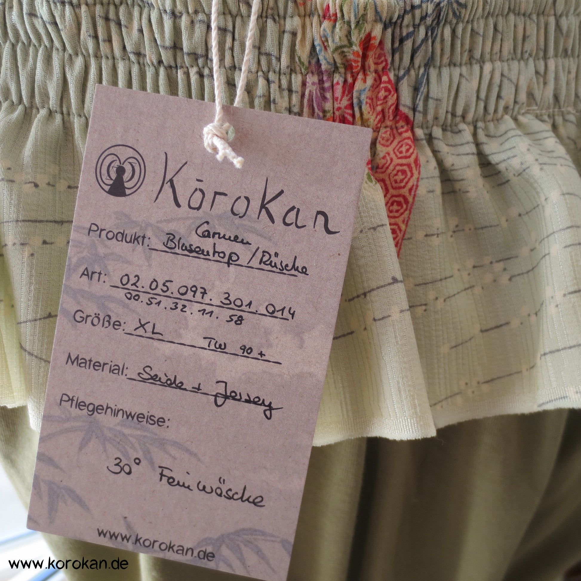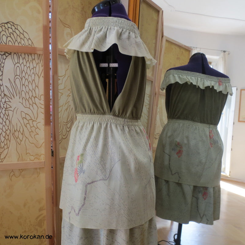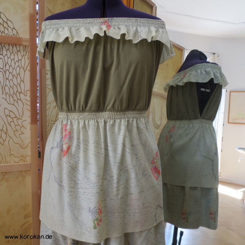 Baumwolljersey Top in schilfgrün mit Kimonoseidenunterteil und Carmenrüsche, Ausschnitt und Taille mit Gummizug unterlegt. Kann man auf der Schulter oder schulterfrei tragen
