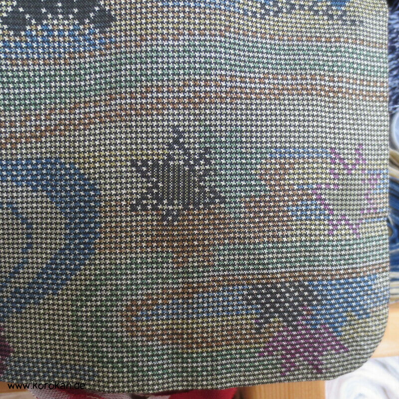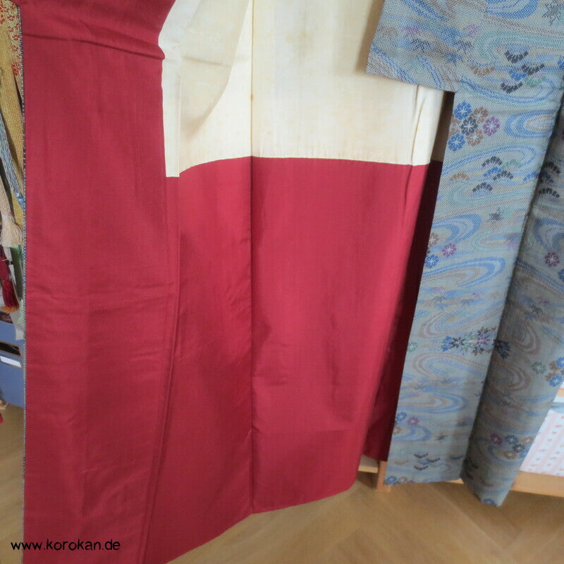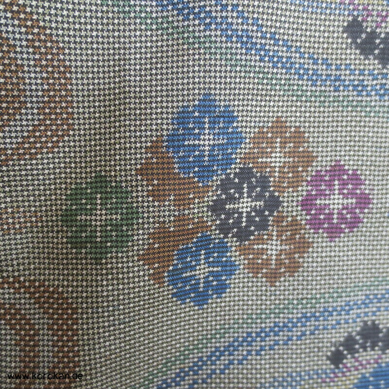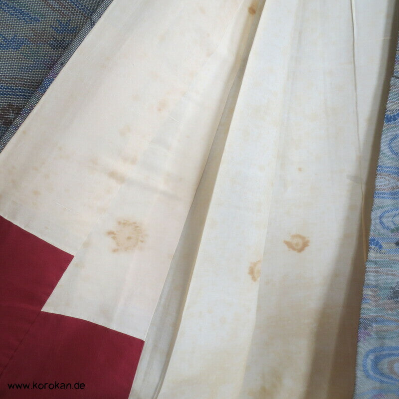 Vintage Tsumugi Seiden Komon Kimono Kasuri Flusswellen mit Chrysanthemen und Blättern frohe hellere Farben, oberes Futter hell, unteres Hakkake Futter in roter Seide