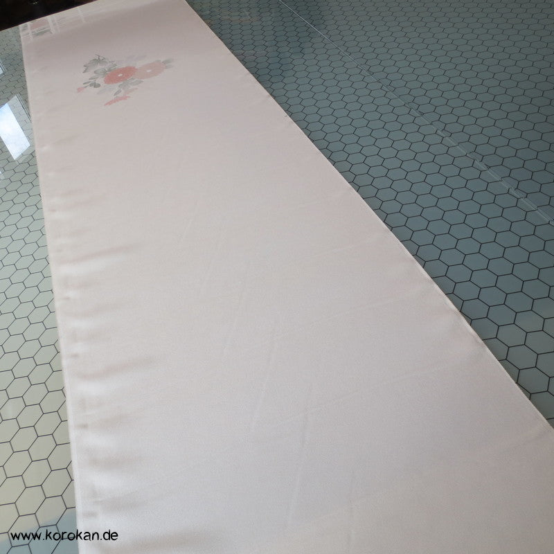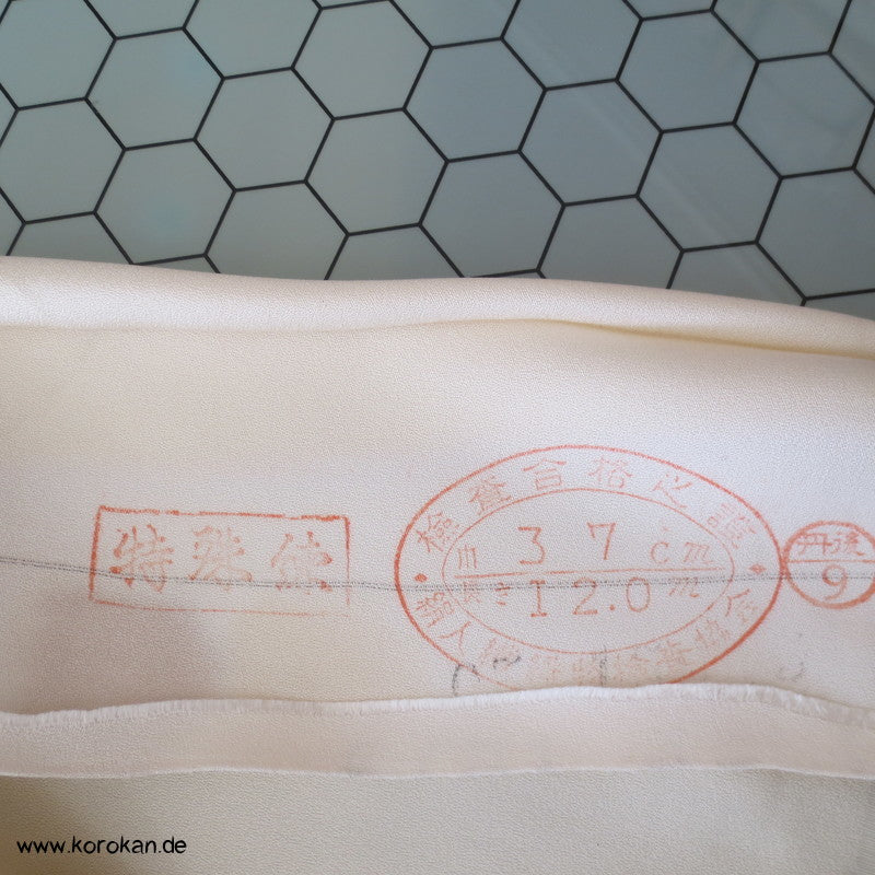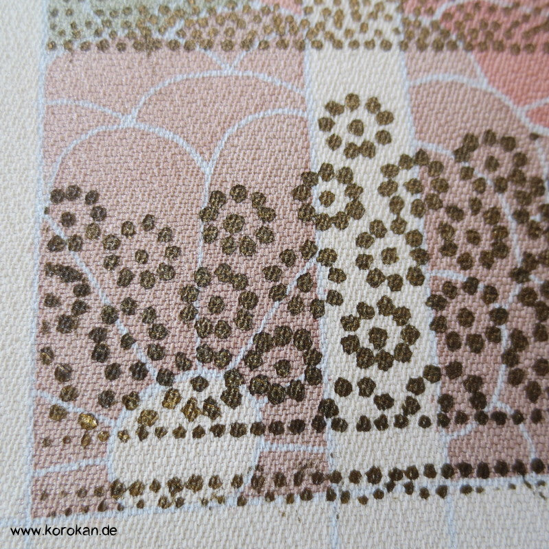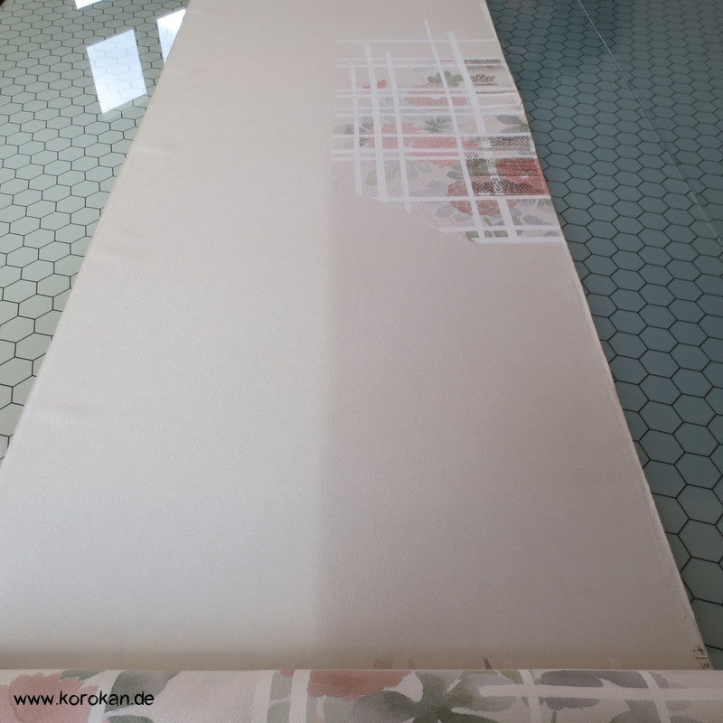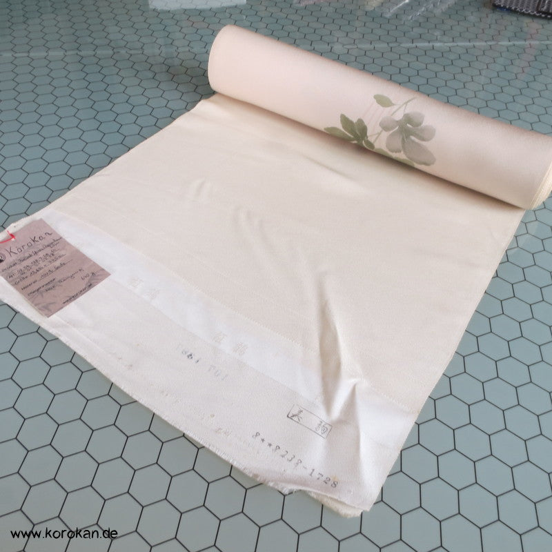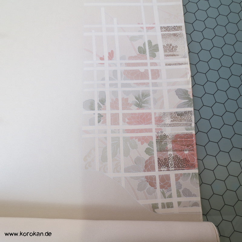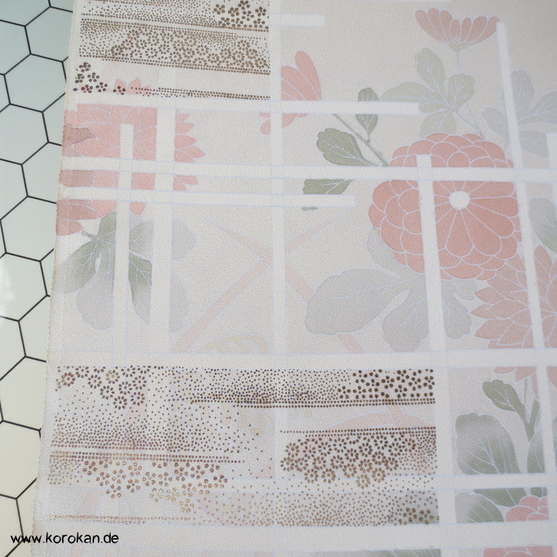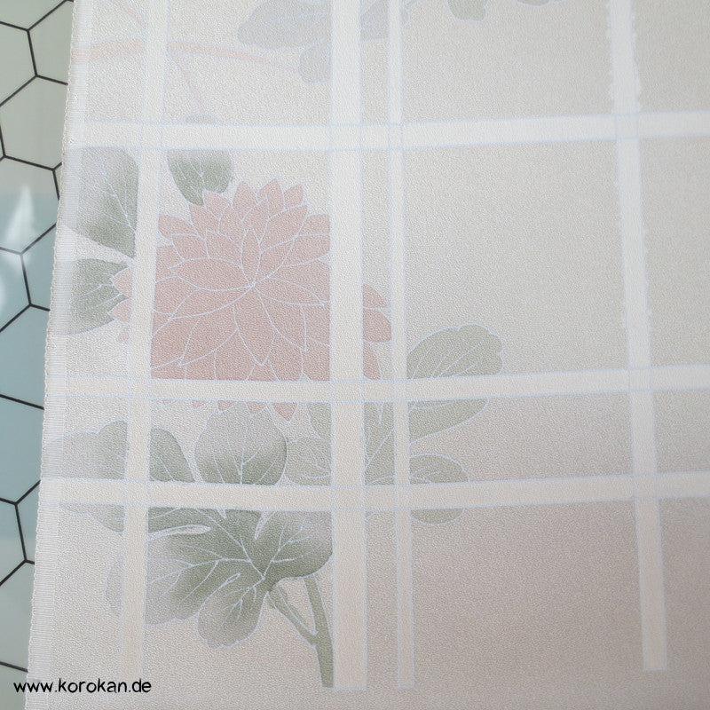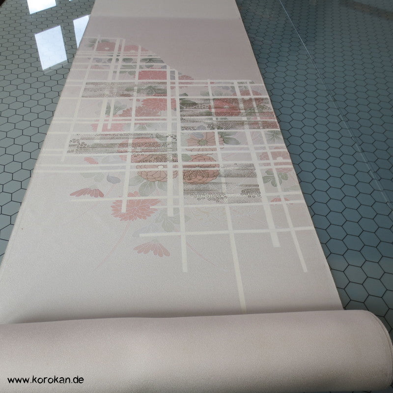 Vintage unbenutzter japanischer Stoffballen Crepesatin Seide, bemalt mit Kugelchrysanthemen hinter Gitter für einen ganzen Homongi Kimono. Das Muster ist unregelmäßig im Stoff verteilt und wird erst durch das genaue Zusammensetzen der Bahnen ein ganzes Bild.