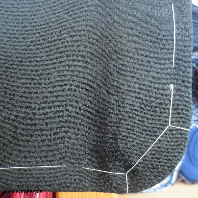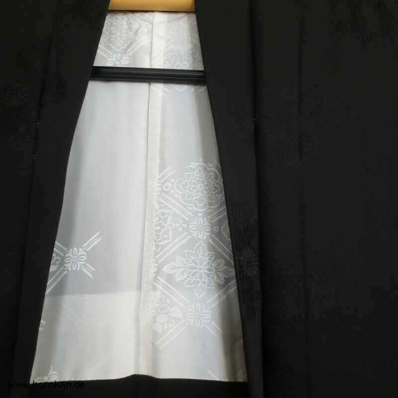 Vintage Haori Kimono Jacke aus feiner, schwarzer japanischer Damast Seide mit eingewebten stark strukturierten Chrysanthemenwolken, oberen Seidenfutter bedruckt mit weißen Blütenrastern.