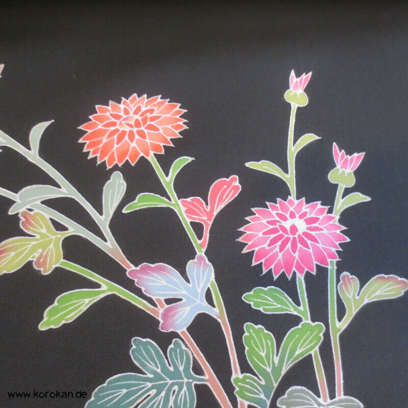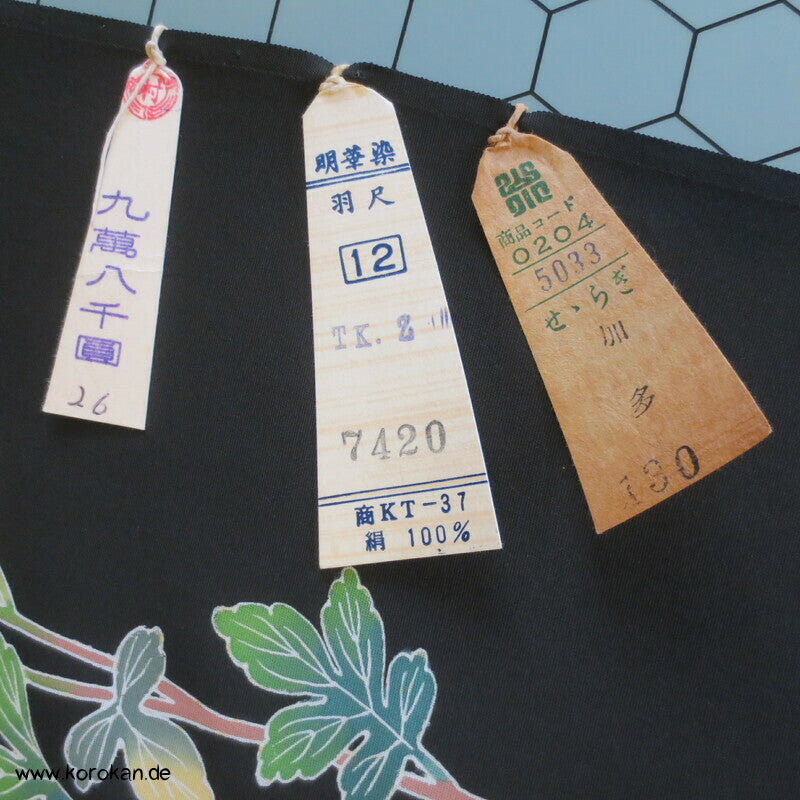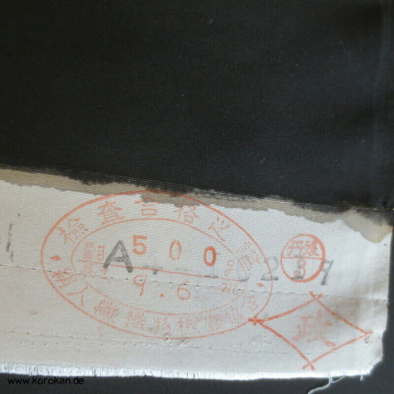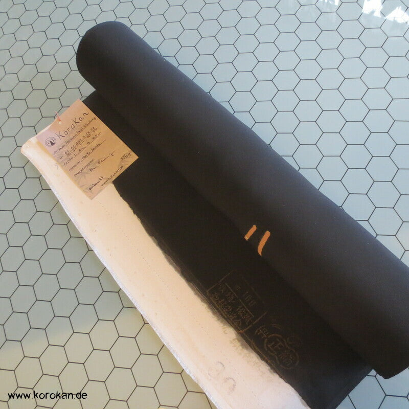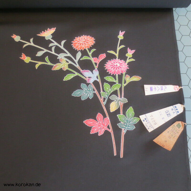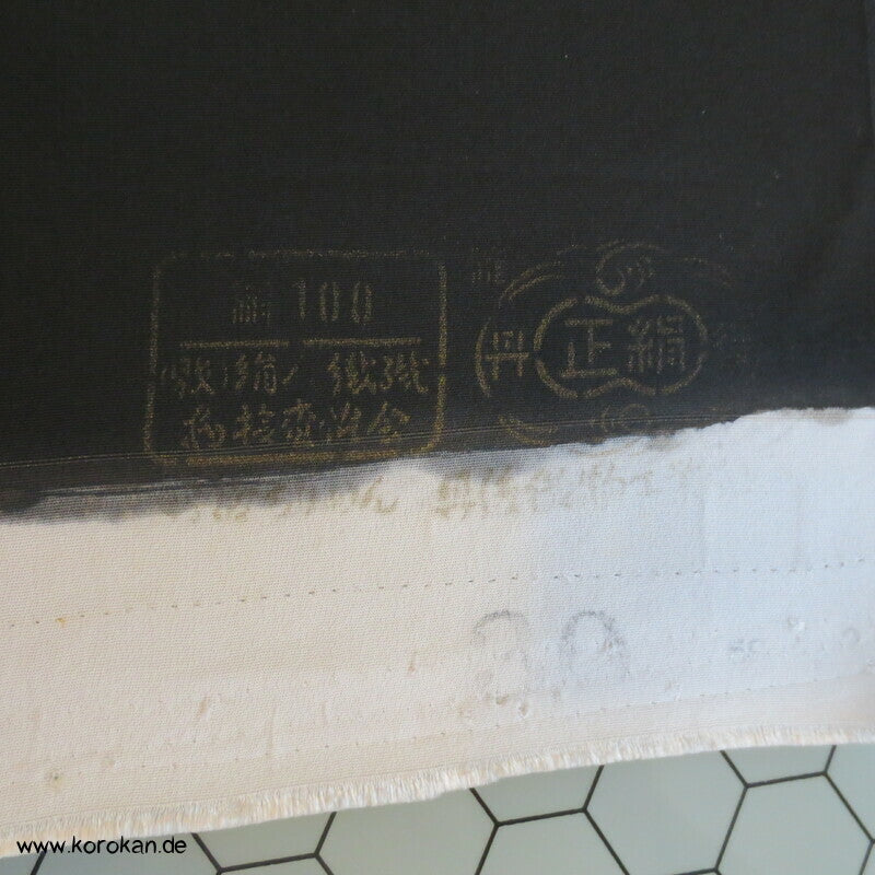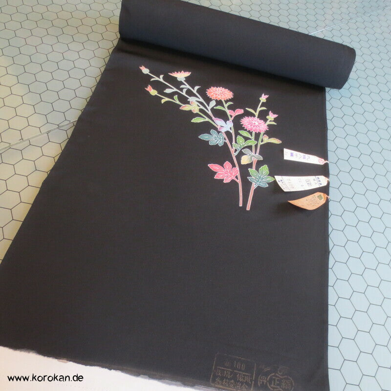 Vintage unbenutzte Tanmono Stoffrolle schwarzer Seidencrepe für Kimono Haori Jacke mit Blütenzweigen bemalt